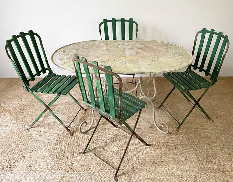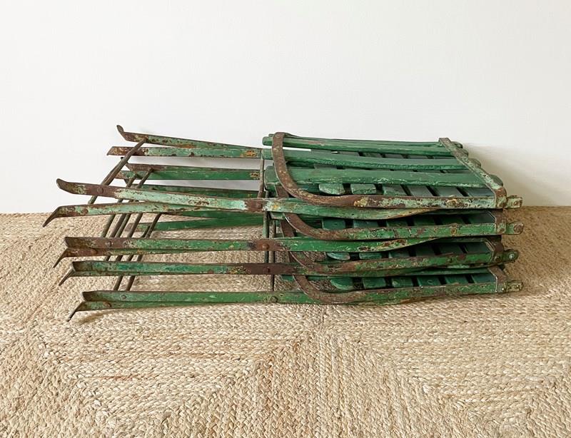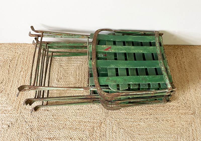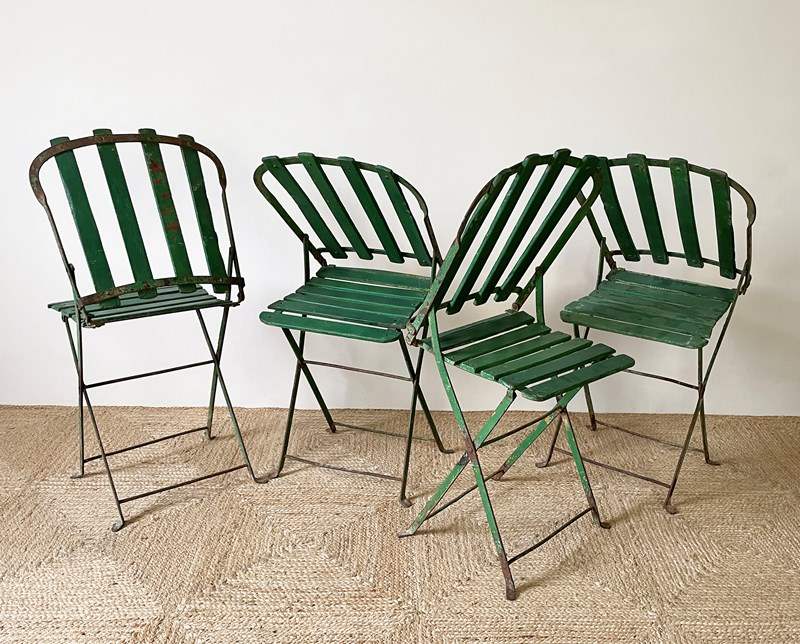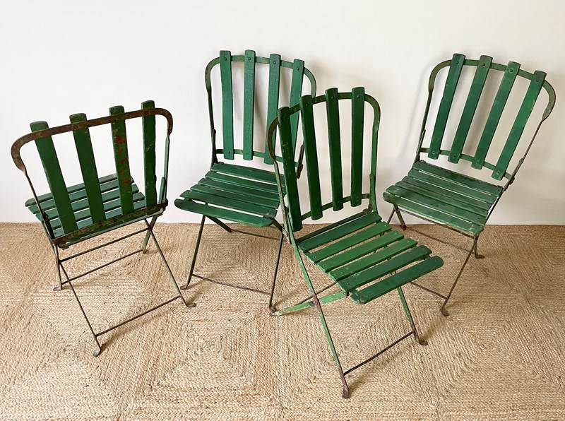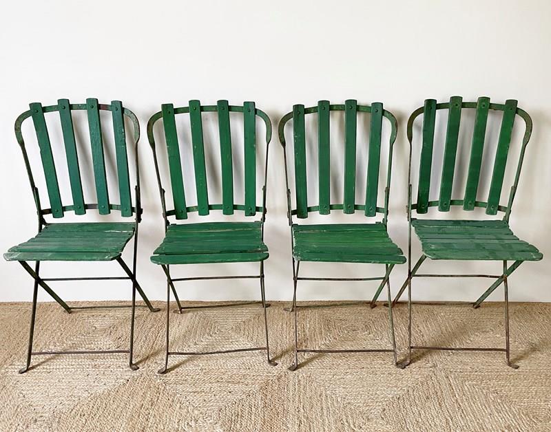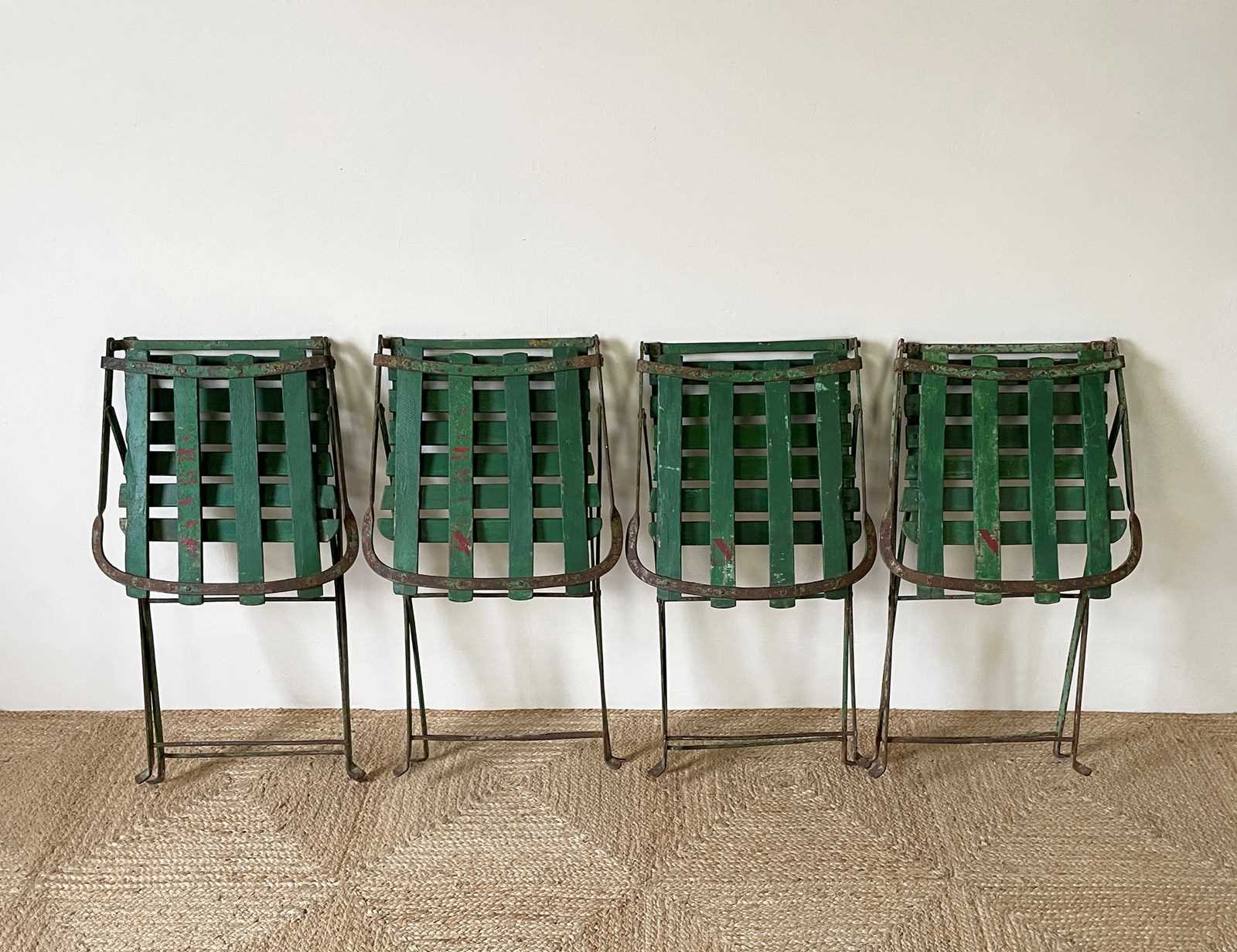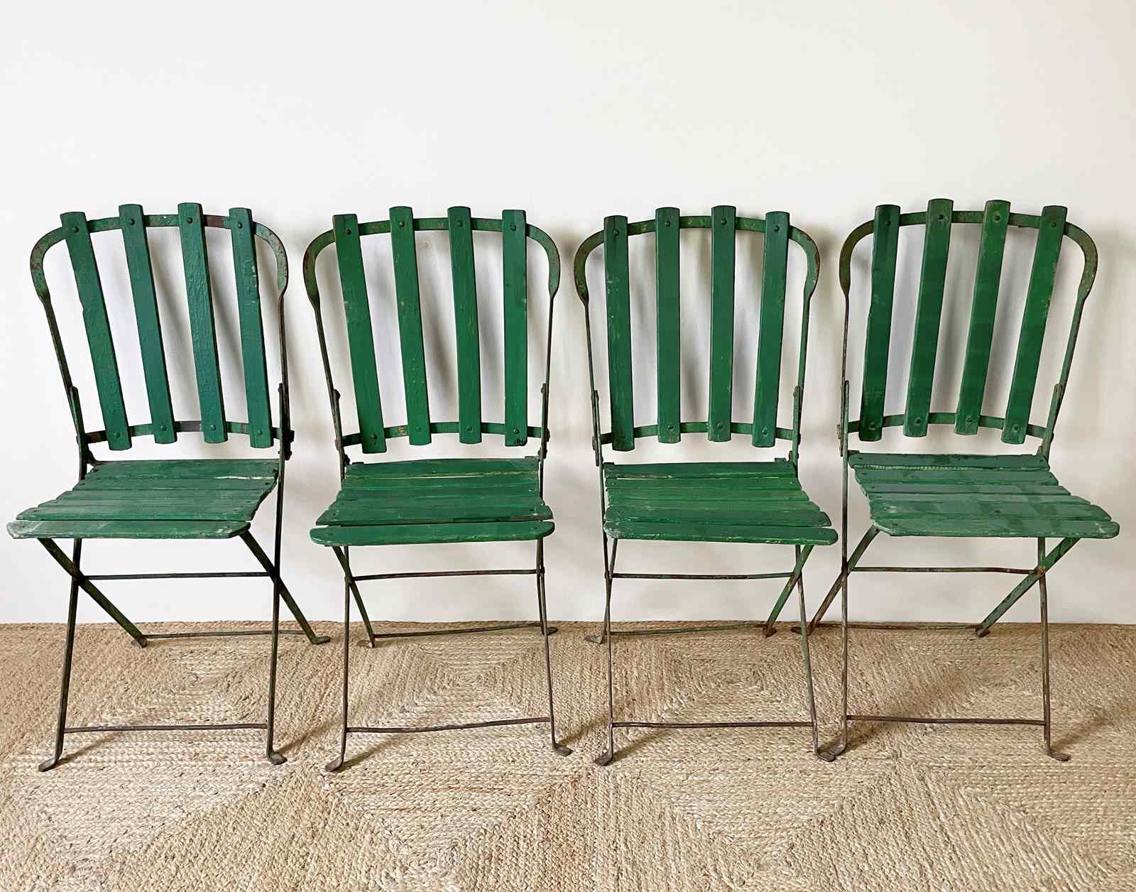Set of 4 charming French Slatted chairs - old green paint and folding... all in good condition. A perfect set for the garden and so handy to be able to fold them and stow them away through the winter. Originally Bistro or Café chairs so great to use them around the kitchen table - easy and light to move around and not blocky! Circa 1920