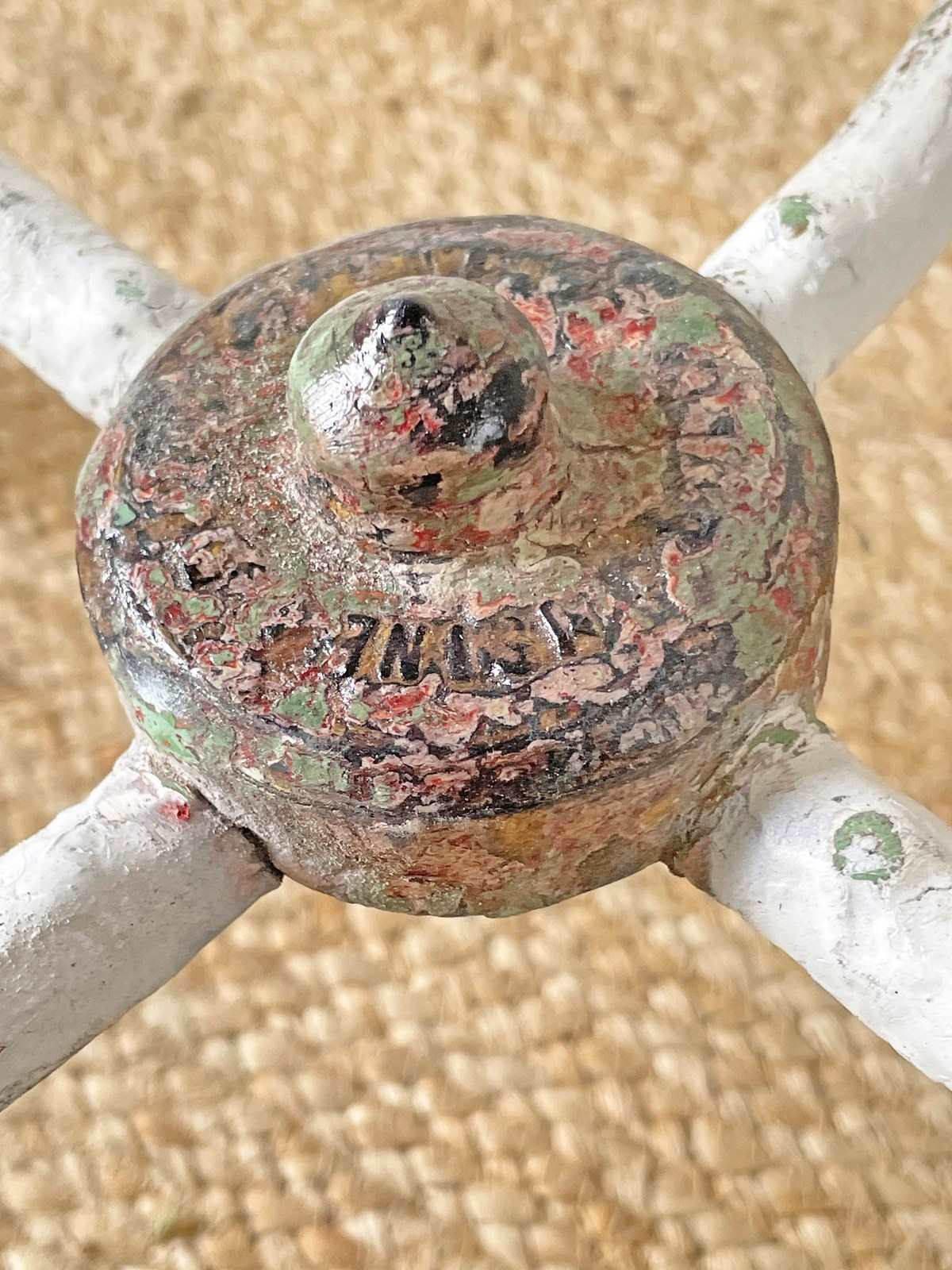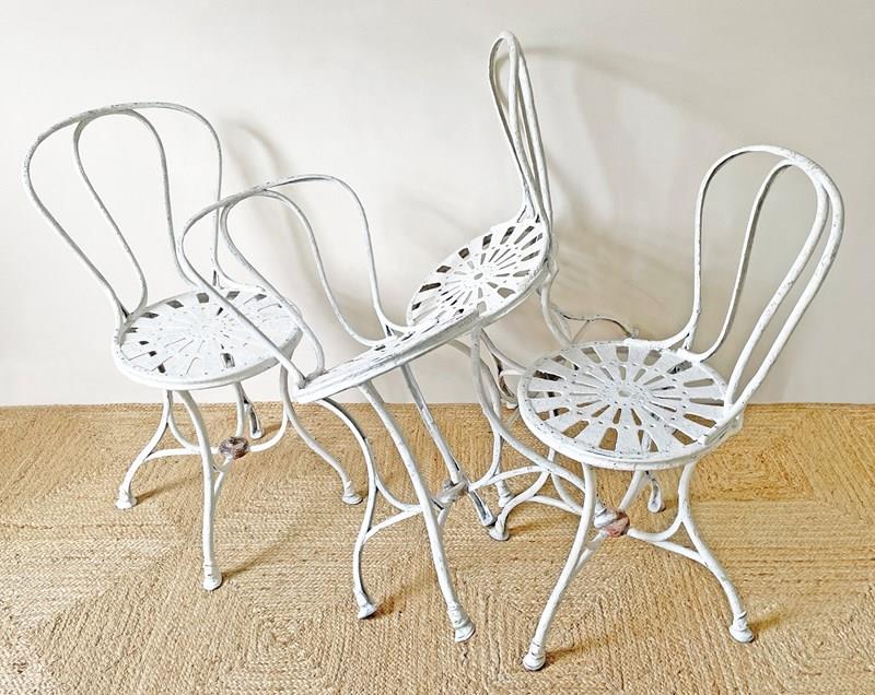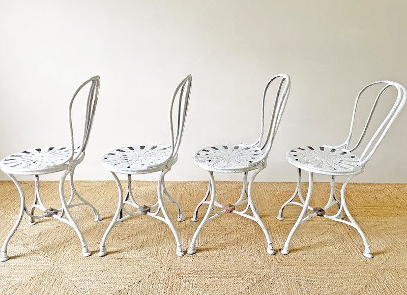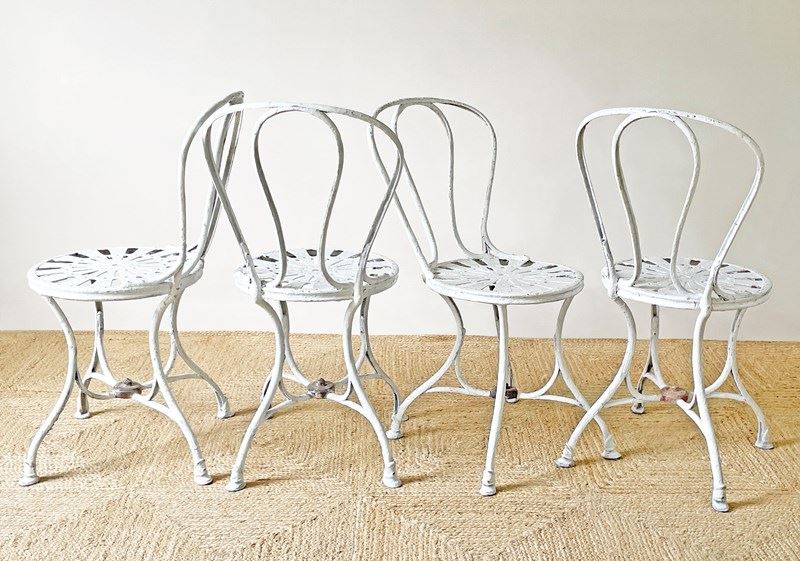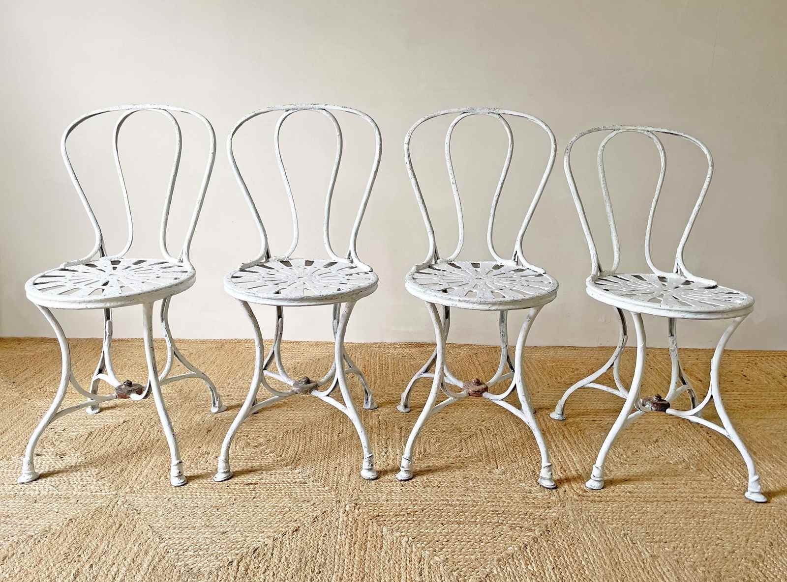 Set of 4 19th century French Arras Garden Chairs - this model has beautifully perforated seats in an Art Nouveau style. These are a rare and early model and have those eponymous "hooved" horses' feet. Made in the iron factories in Arras, Northern France, who made beautiful and very stylish iron garden furniture in the late 19th century. Many layers of paint over the years - now rust converted, sanded and painted white - ready for another 100 years! circa 1890