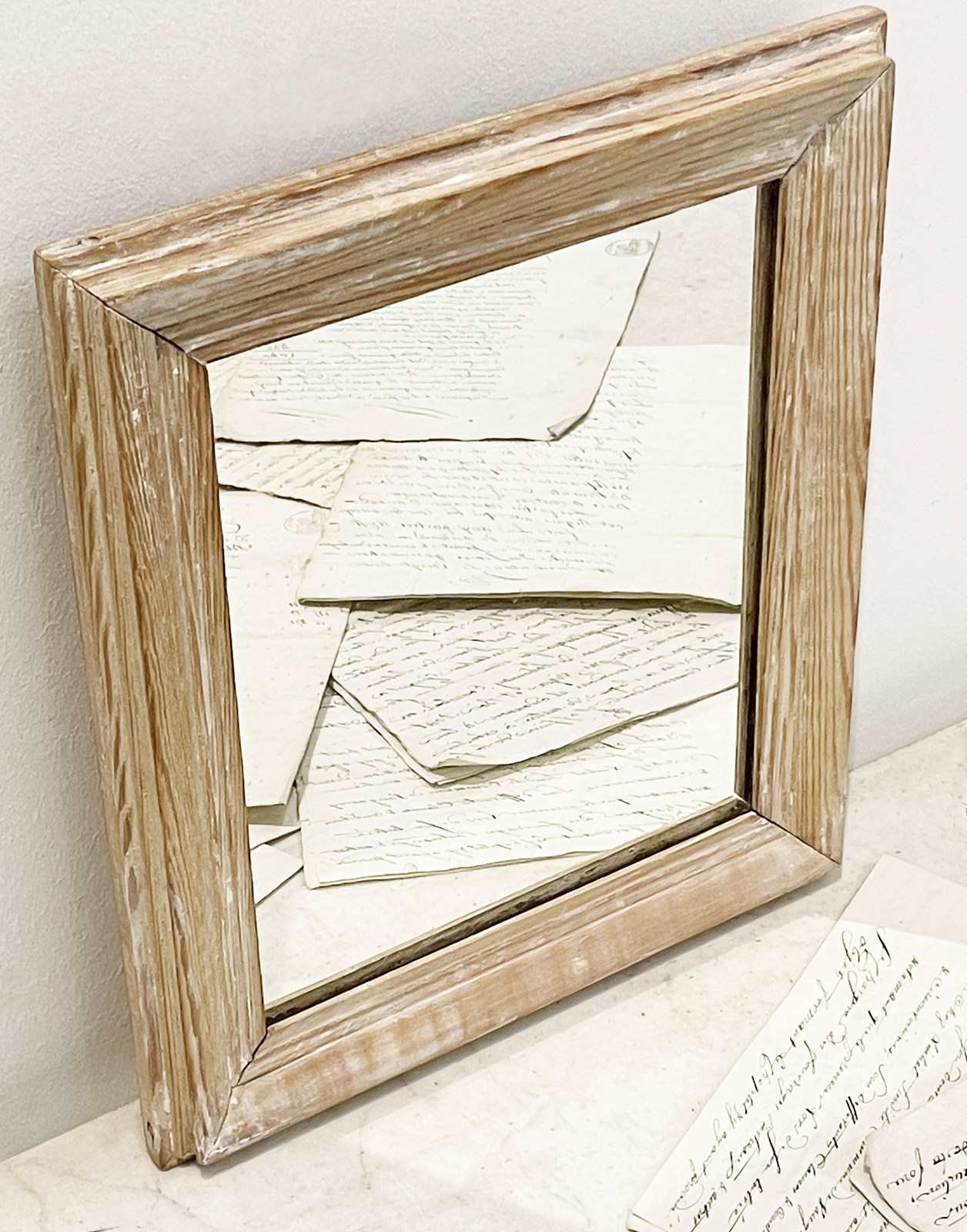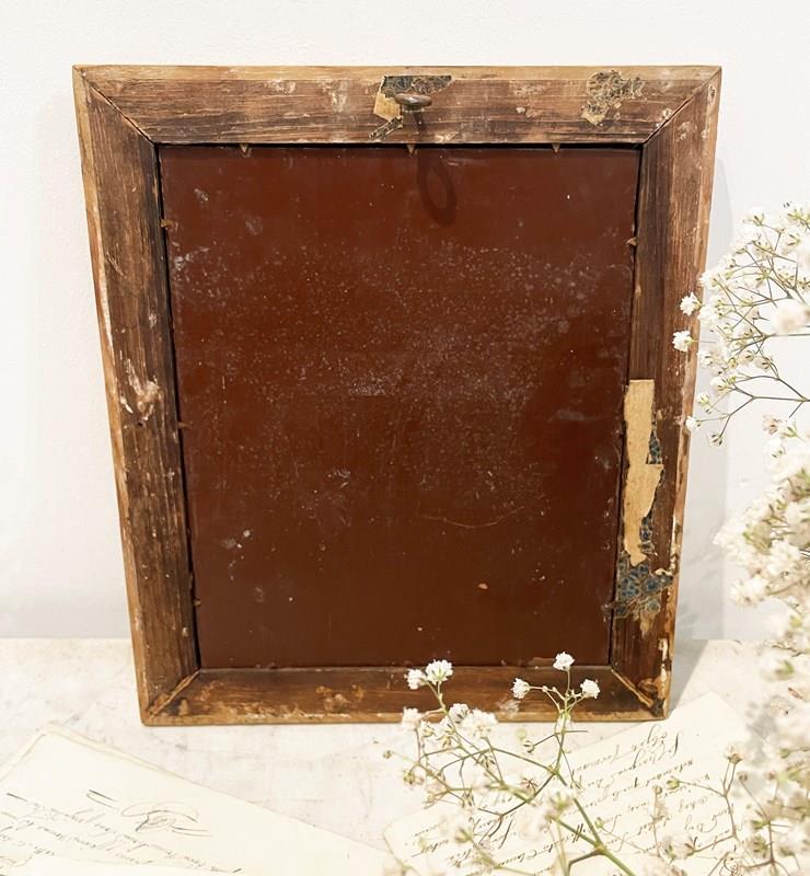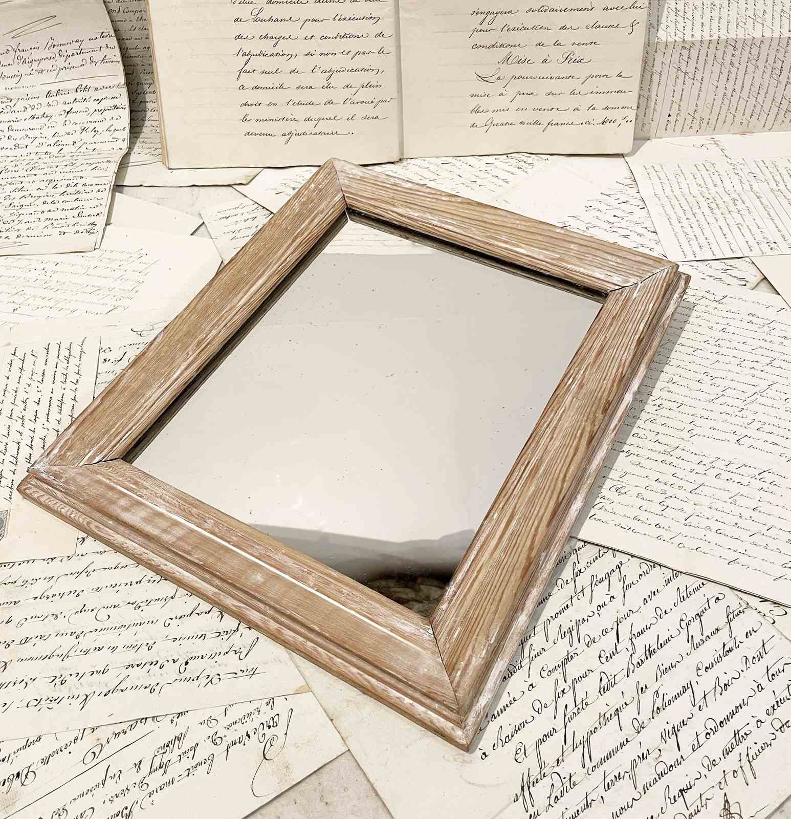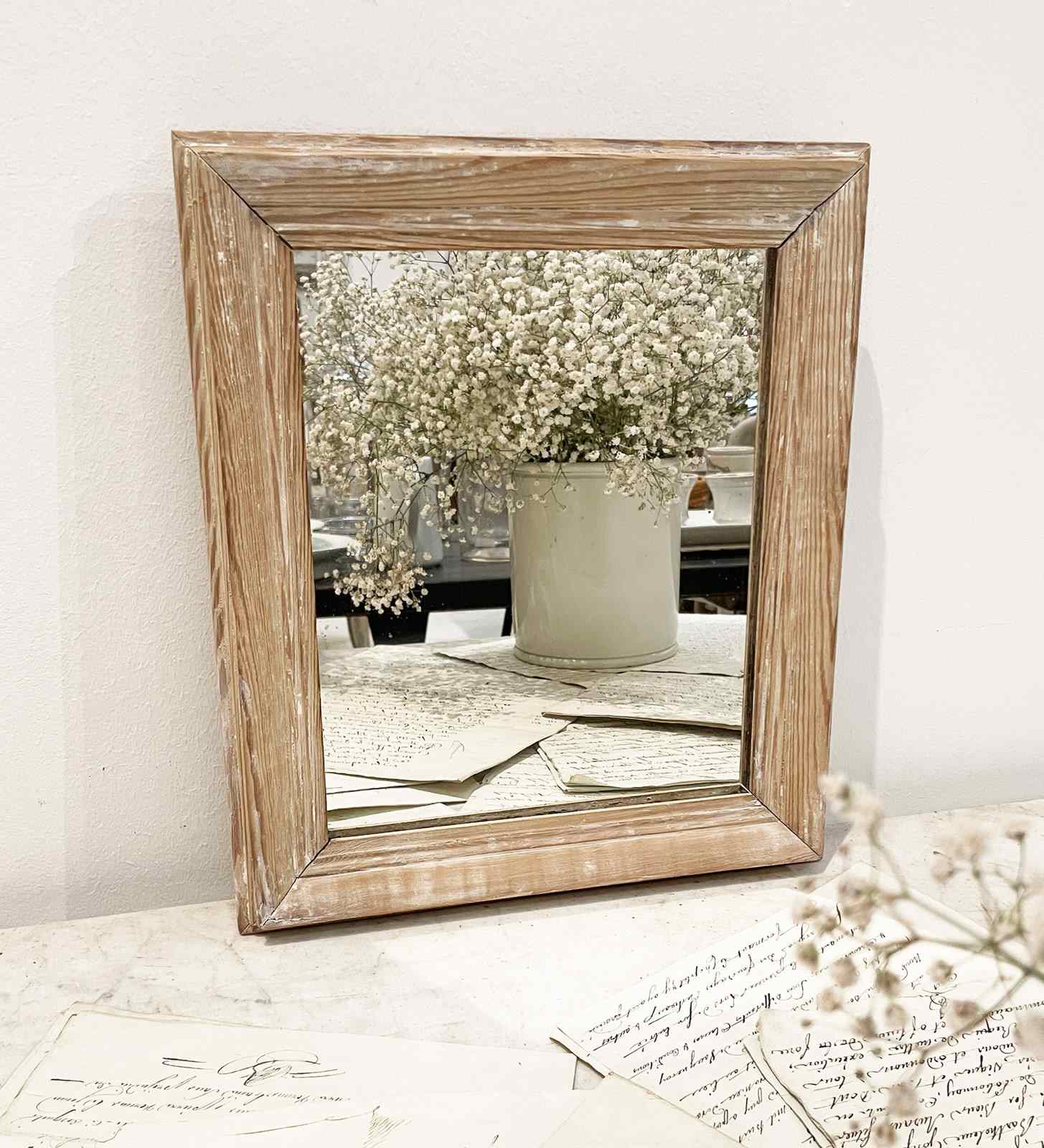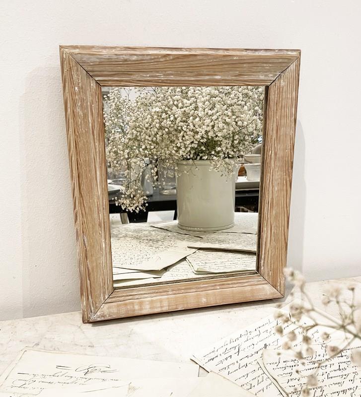 Small 19th c French Mirror with original moulded pine frame and remains of white paint. Old thick glass plate without wooden back. A charming and decorative little piece. Circa 1870