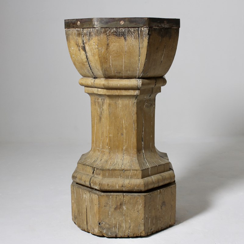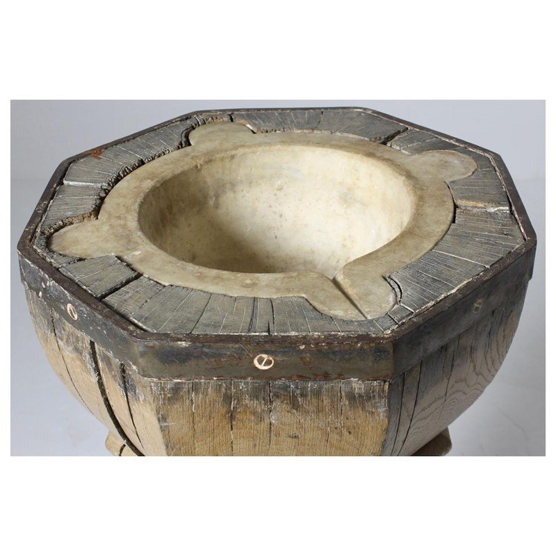 A truly wonderful and rare, 17th century, English Country House, oak and marble, floor standing, pedestal mortar. The bold, octagonal oak base is a beautiful colour, with a later iron band to the top to strengthen it, original inset marble mortar to the top.
