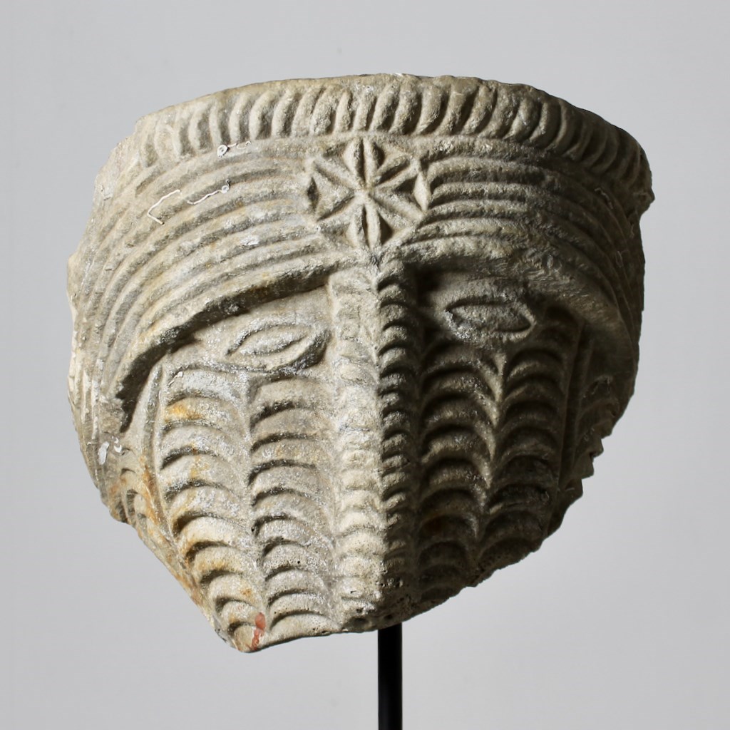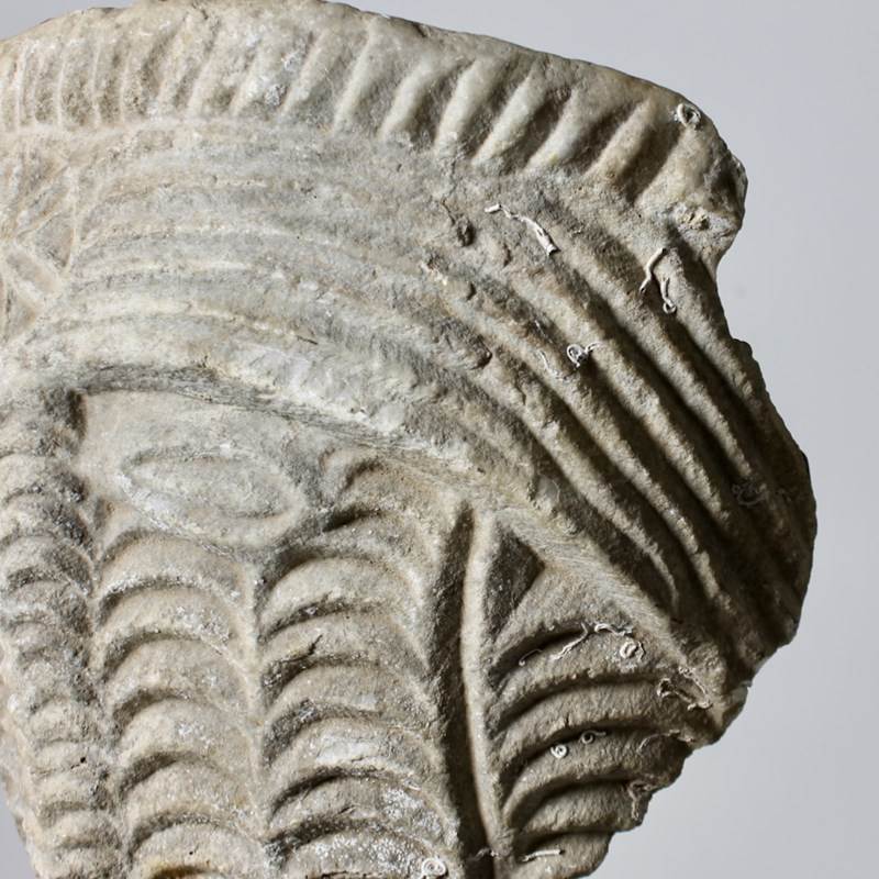 A large scale, early Roman Byzantine marble fragment, salvaged from the bottom of the sea. With bold carved detail, the back is hollowed out so most probably part of an urn or vessel, with many traces of encrustations, mounted on a stand, but can also be wall hung.
