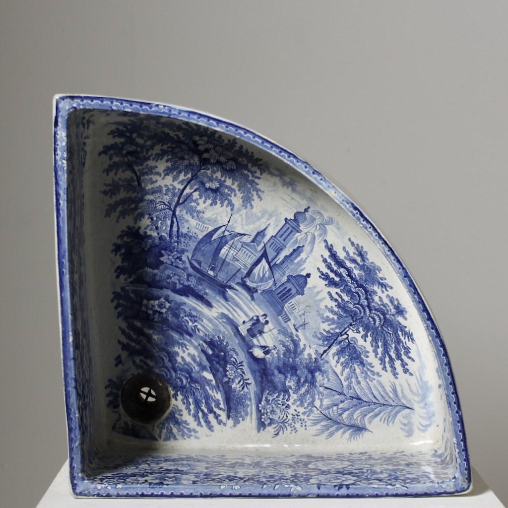 A beautiful and rare, early to mid 19th century, Staffordshire blue and white transfer printed corner sink, in very good condition and retaining it's original brass plug hole.