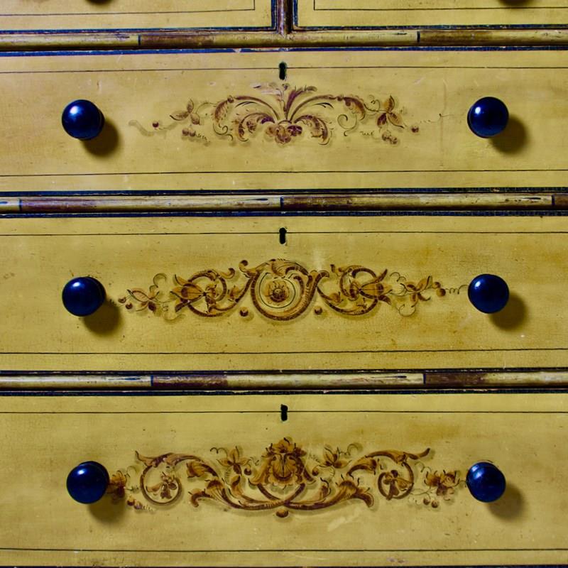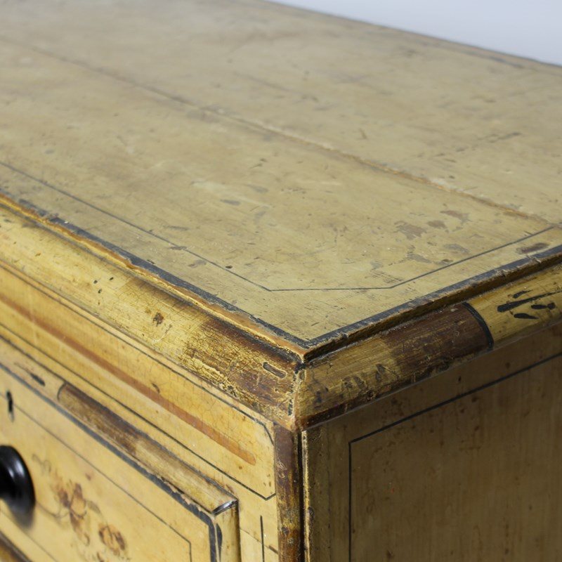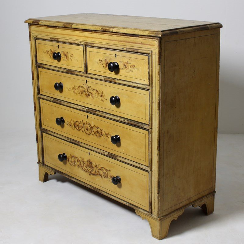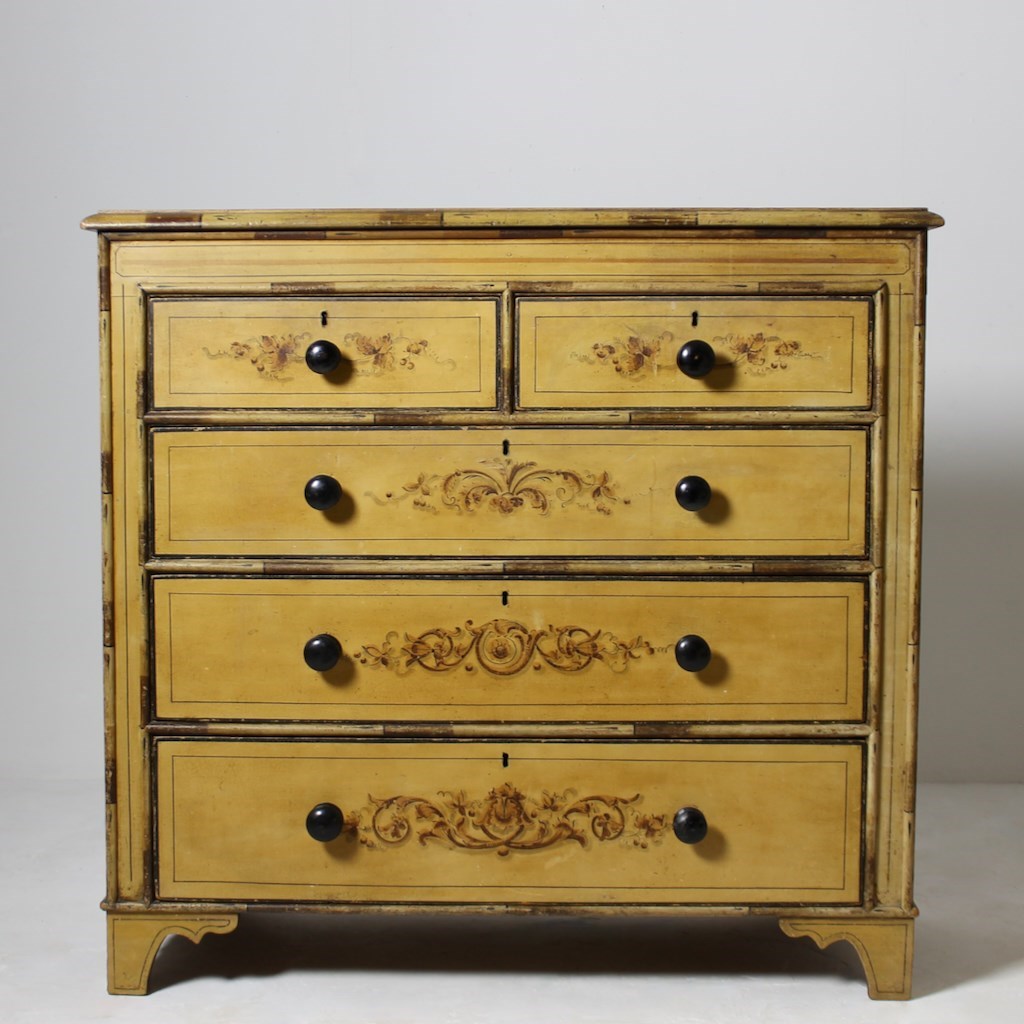 A truly wonderful, large scale, early 19th century original painted pine chest of drawers. With all over faux bamboo and line decoration, floral sprays to each drawer, standing on bracket feet and retaining its original handles, one of the best i've had.
