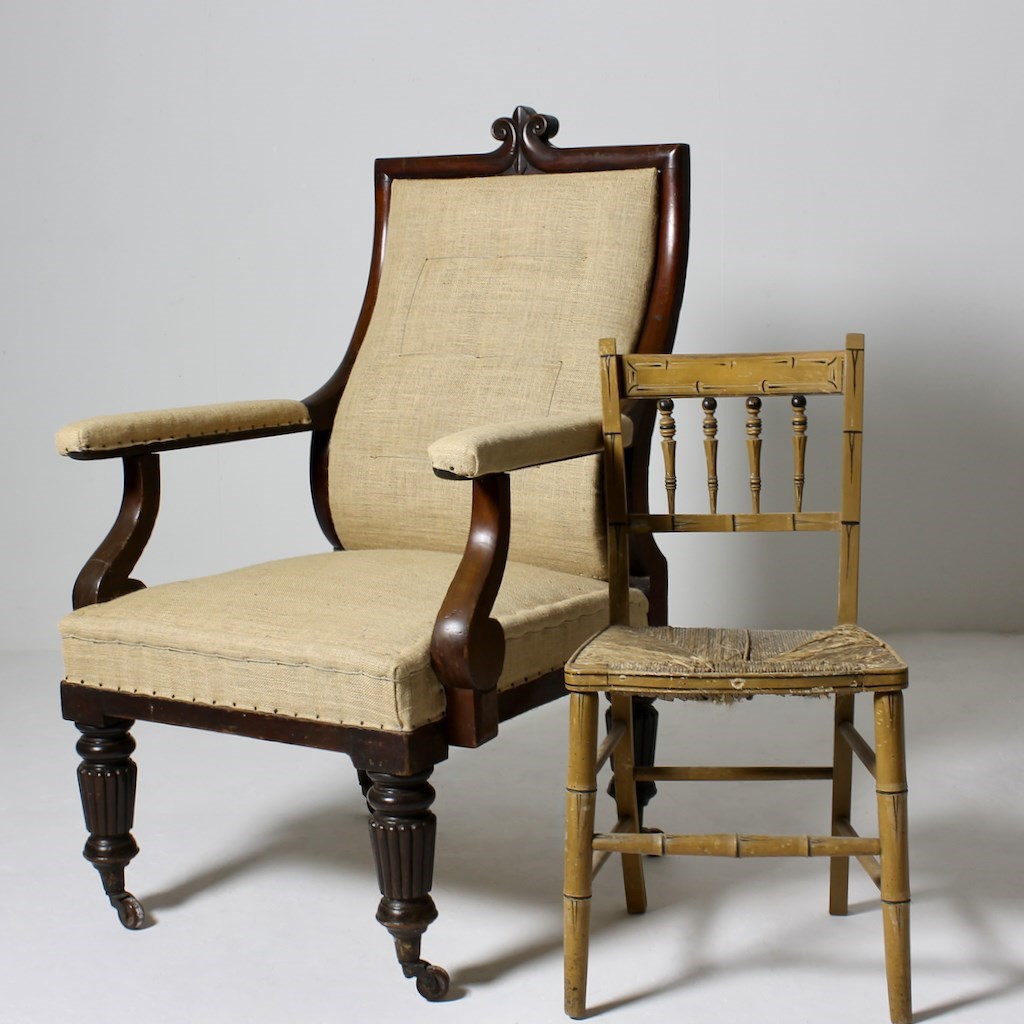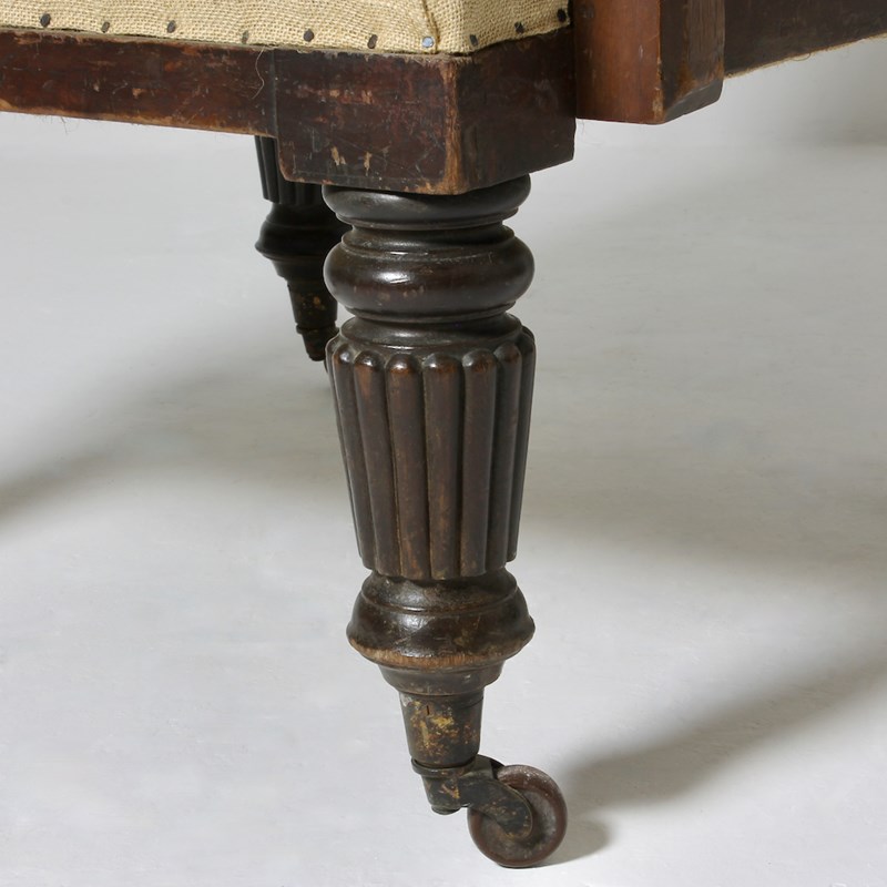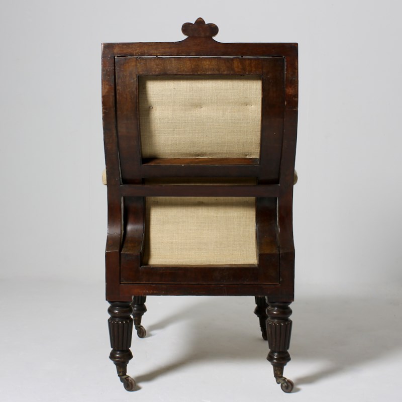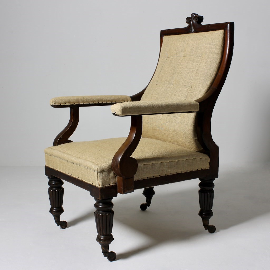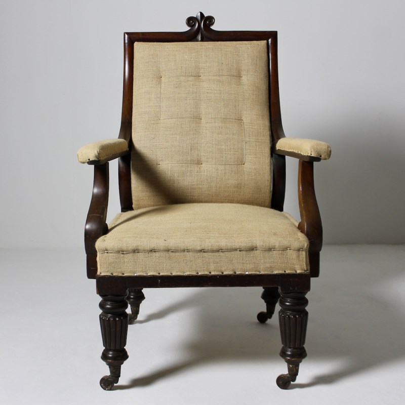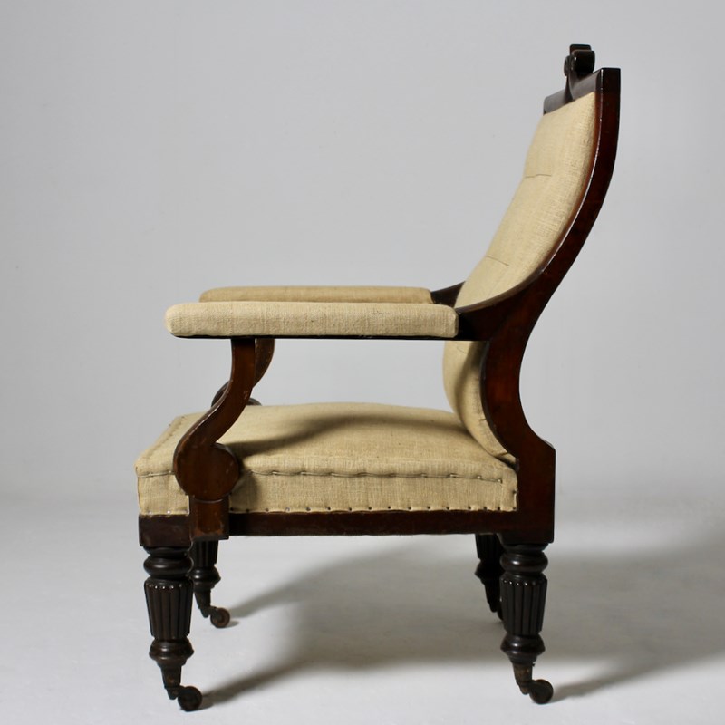 A very large scale, early 19th century, William IV period, mahogany upholstered armchair. Simple, understated framework, with a wonderful shaped back, standing on bold ringed and reeded legs, traditionally reupholstered and ready for its top coat.