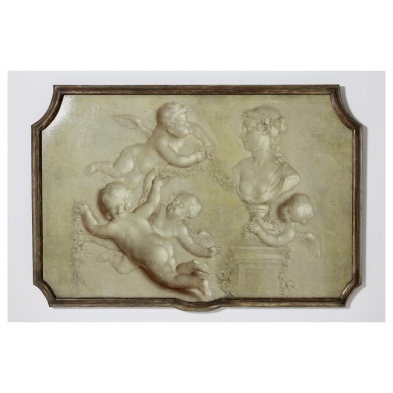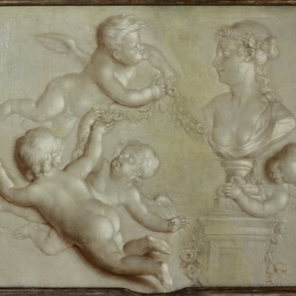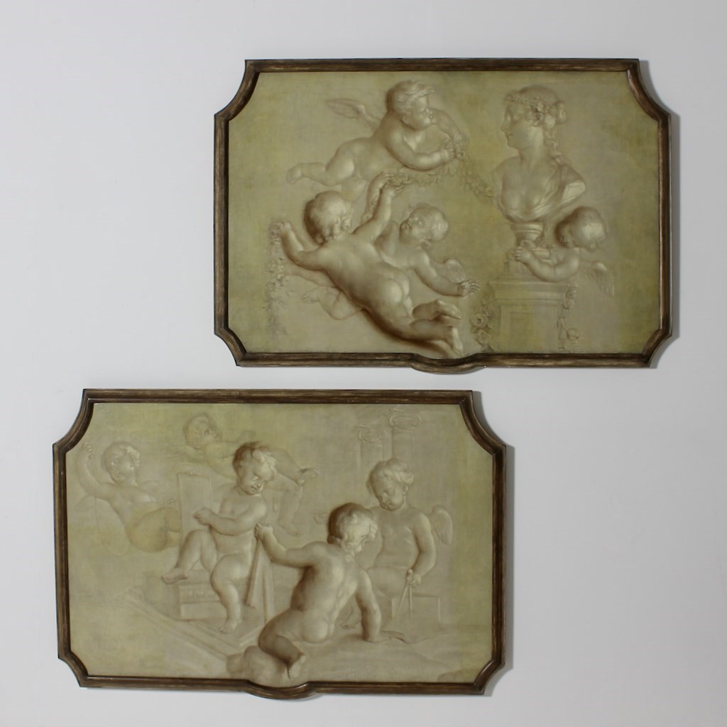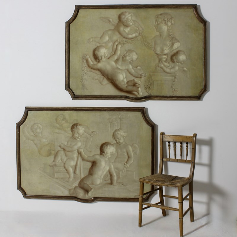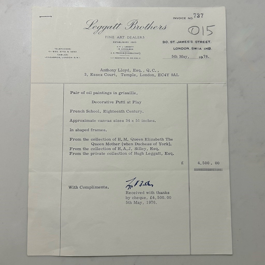 A fine, very large pair of French, late 18th century oil on canvas en grisaille paintings, depicting putti at play, formally in the collection of H. M. Queen Elizabeth The Queen Mother ( when the Duchess Of York ).