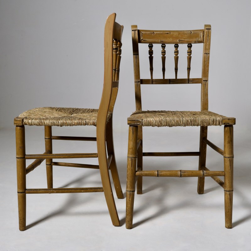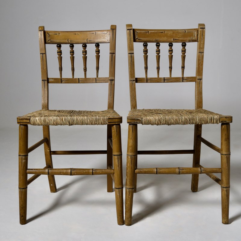 A delightful pair of early 19th century, original faux bamboo painted side chairs, both in good condition, beautifully and naturally distressed paintwork, re-rushed and ready to use.