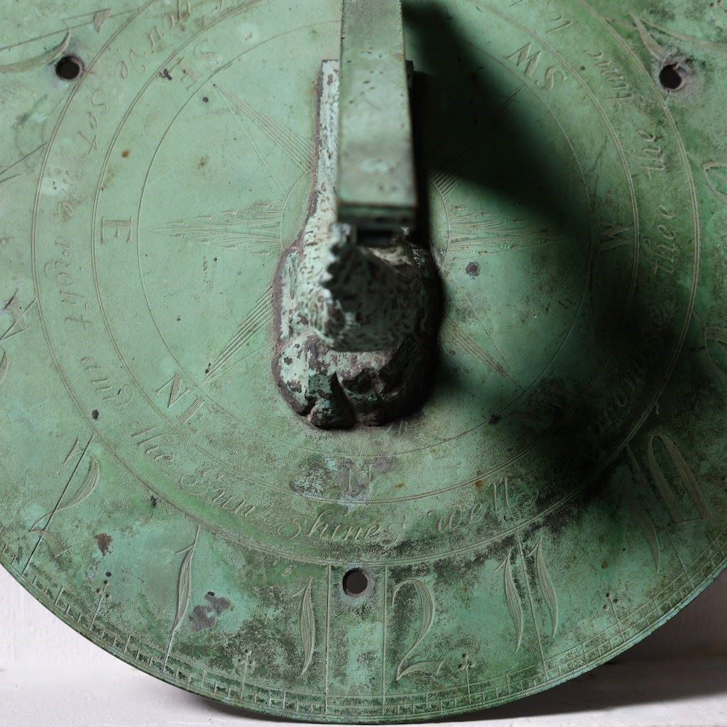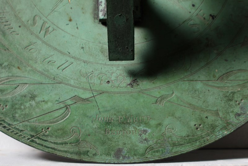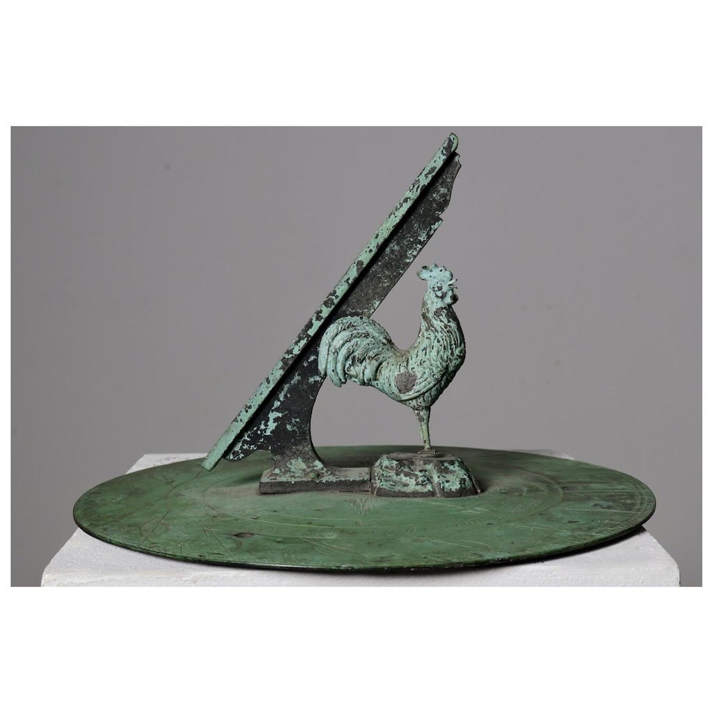 A rare, early 20th century, bronze cockerel sundial plate by J P White, Pyghtle Works, Bedford. The whole plate is beautifully and naturally verdigris'd, the cockerel with small break to lower leg.
