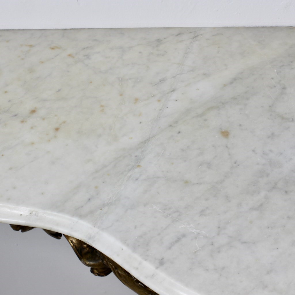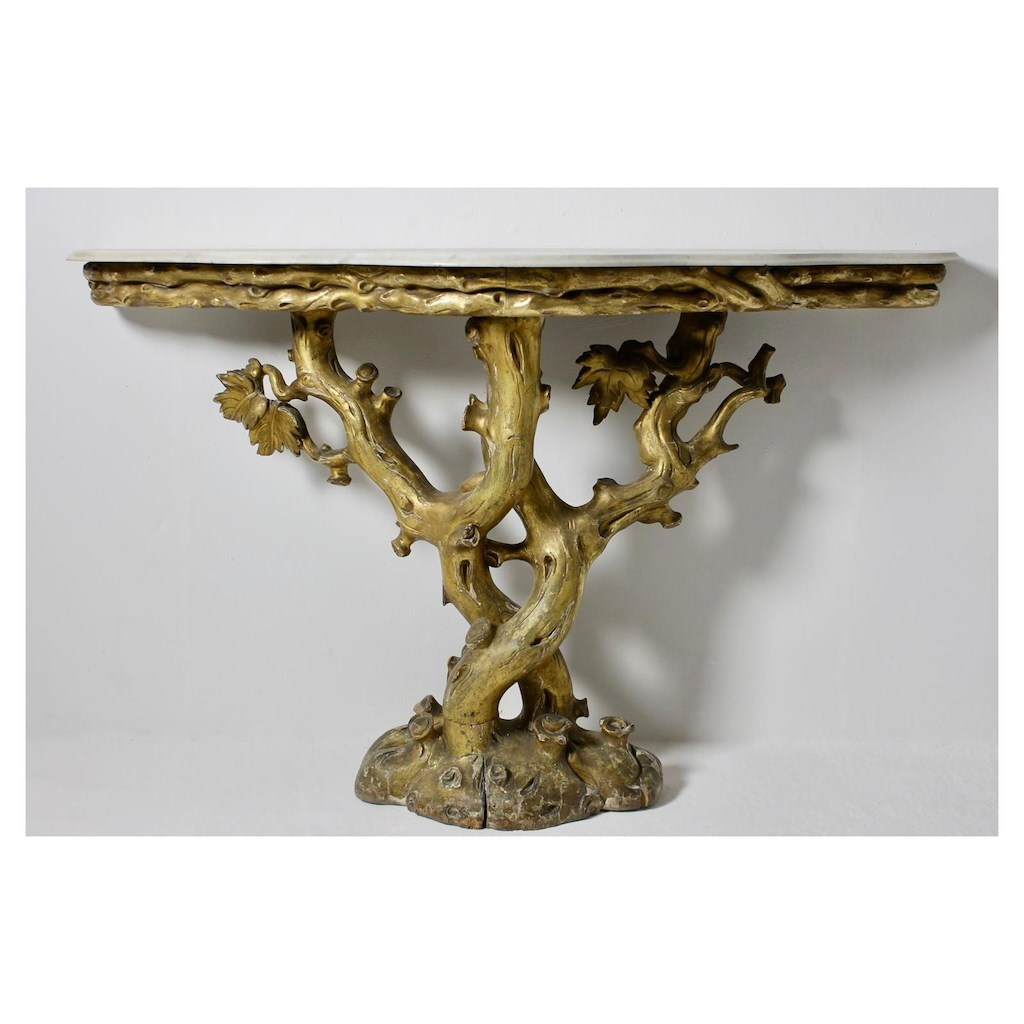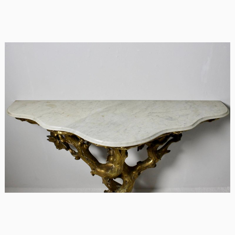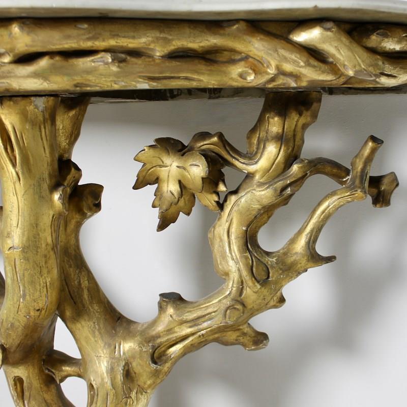 A delightful and wonderfully sculptural, Regency period, English Country House, naturalistic tree from console table. The original Carrara marble top, sits on a gilded support of entwined tree branches, emerging from a rooted base, the whole in country House attic condition, beautifully and naturally distressed, with some losses and old repairs.