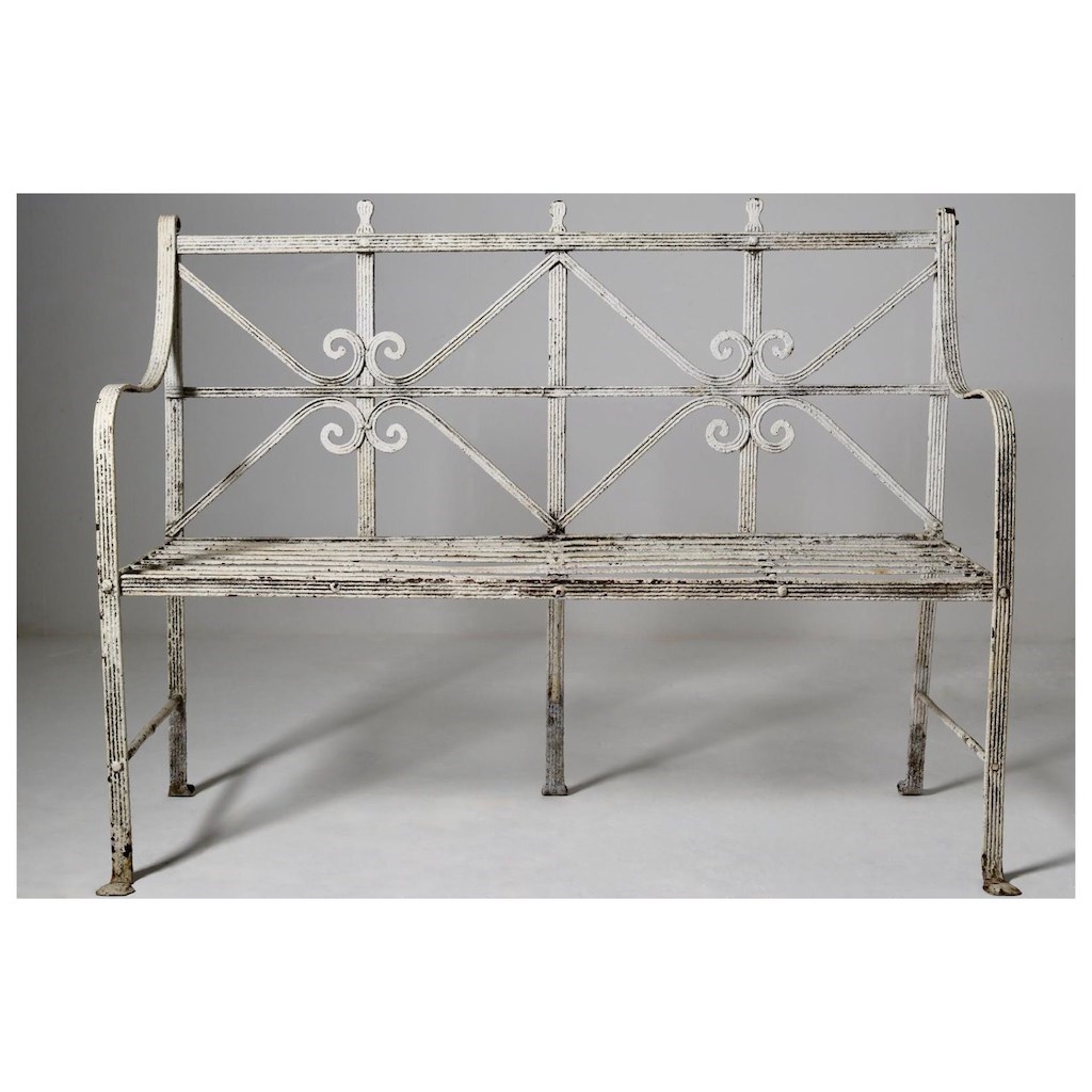 A fine, early 19th century, Regency period, English Country House garden bench / seat of rare design. Constructed in riveted, reeded wrought iron, standing on lions paw feet to the front and scrolled feet to the rear, the whole in very good condition.