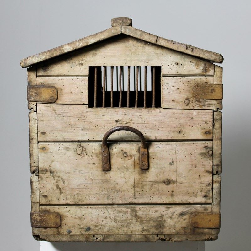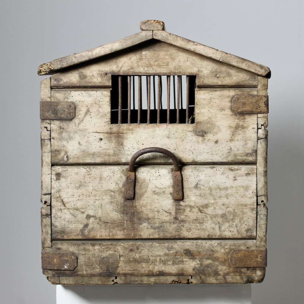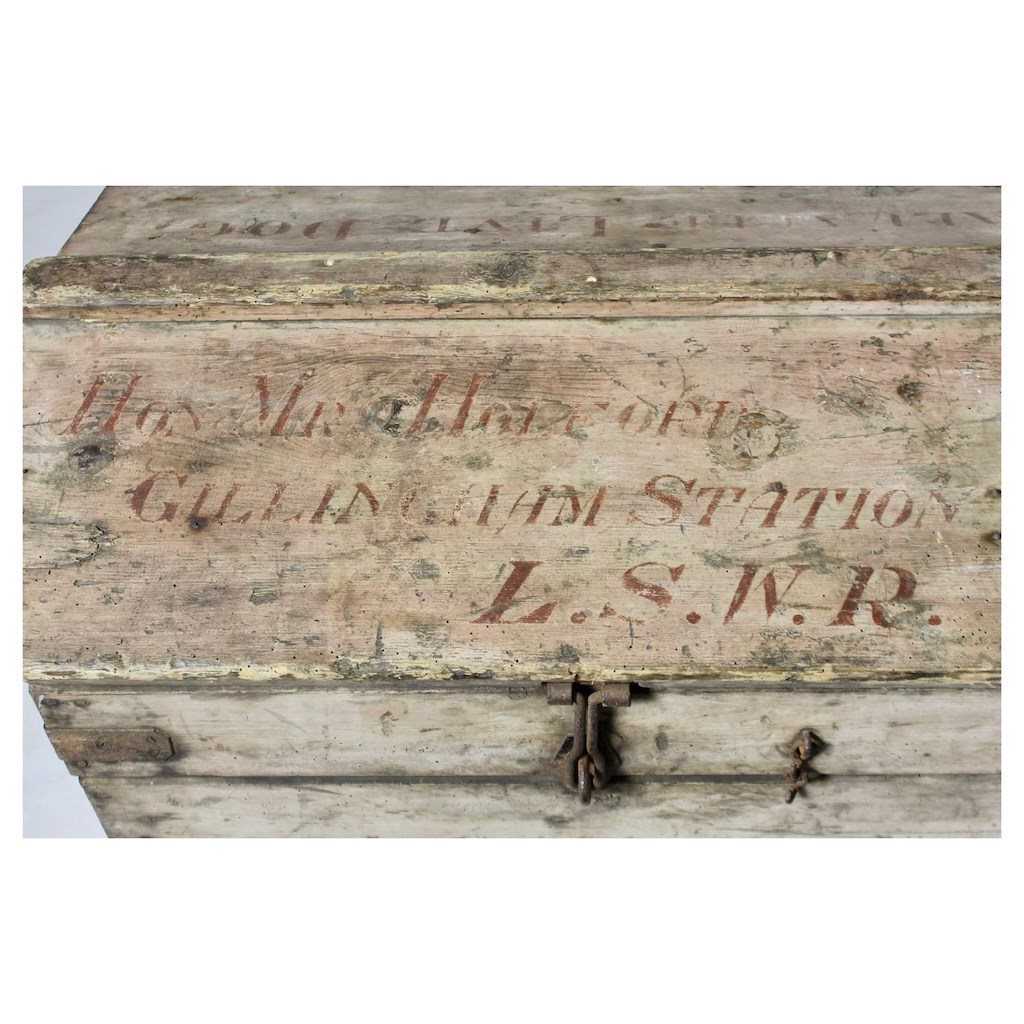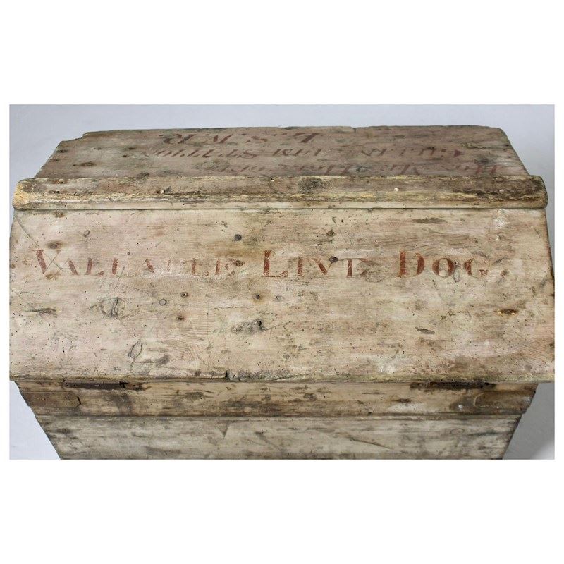 A really wonderful, mid 19th century, English Country House travelling box or crate for a dog. The top with the inscription ' Hon Mr Holford Gillingham Station L.S.W.R.' to one side and ' Valuable Live Dog' to the other, a wonderful piece of social history.