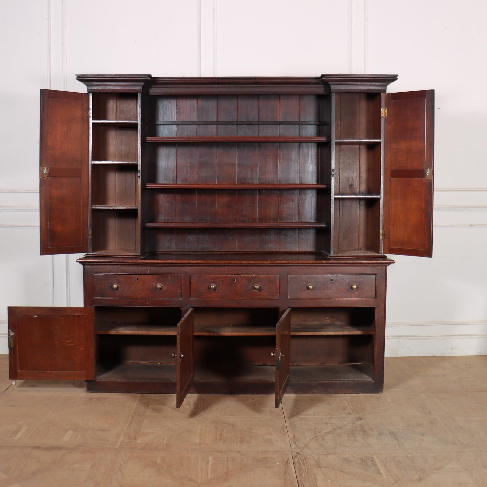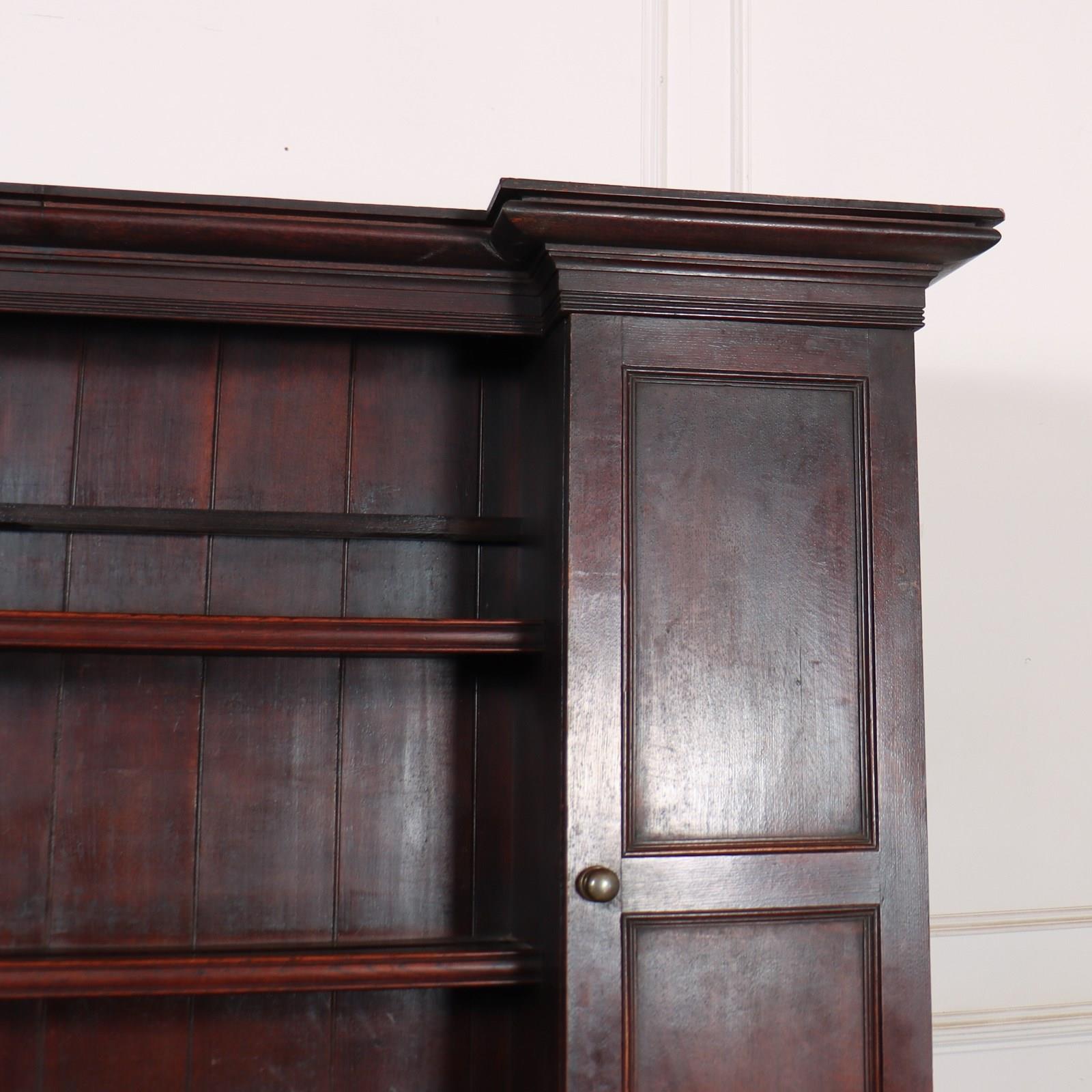 Large 18th C English country house oak dresser with cupboards on the rack. 1790