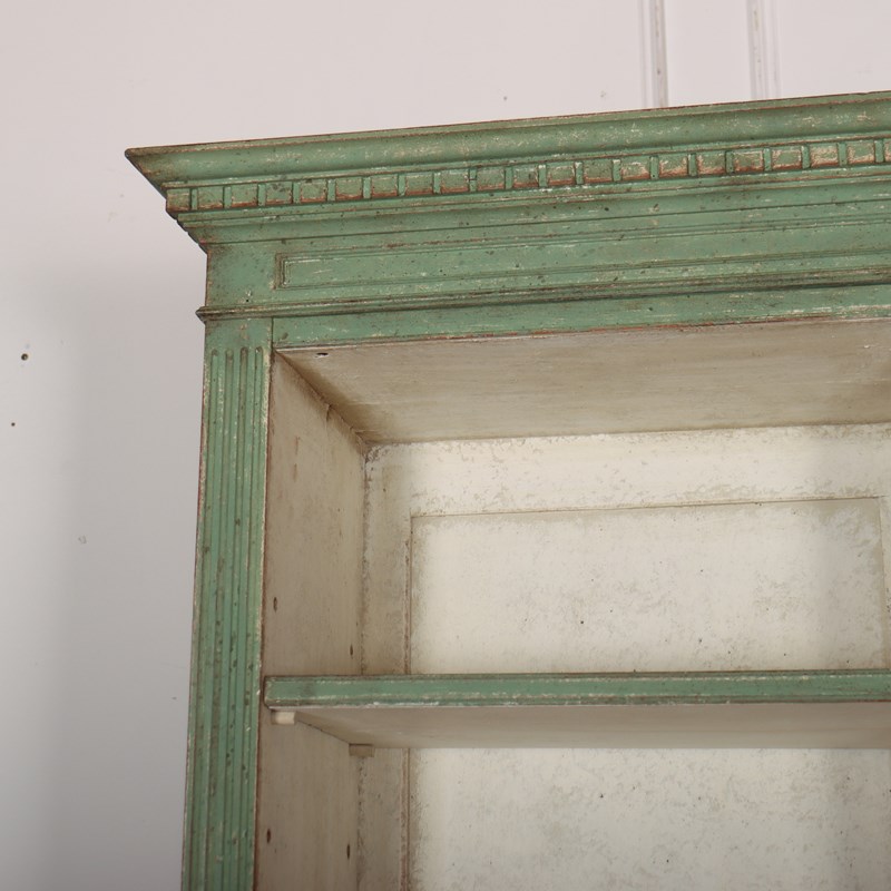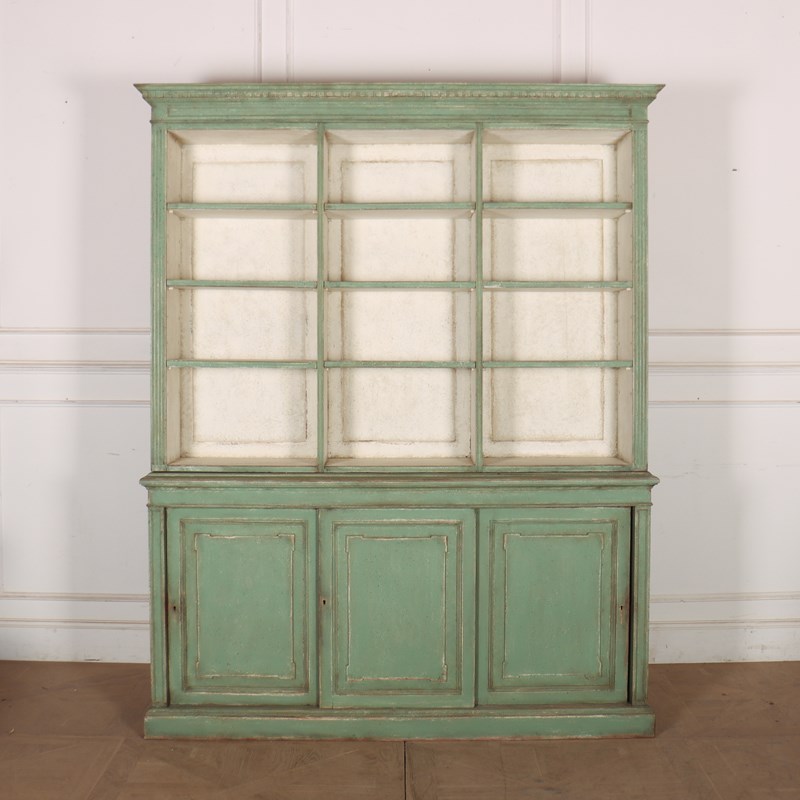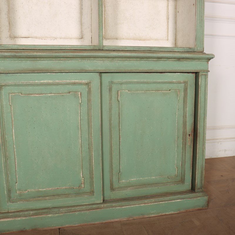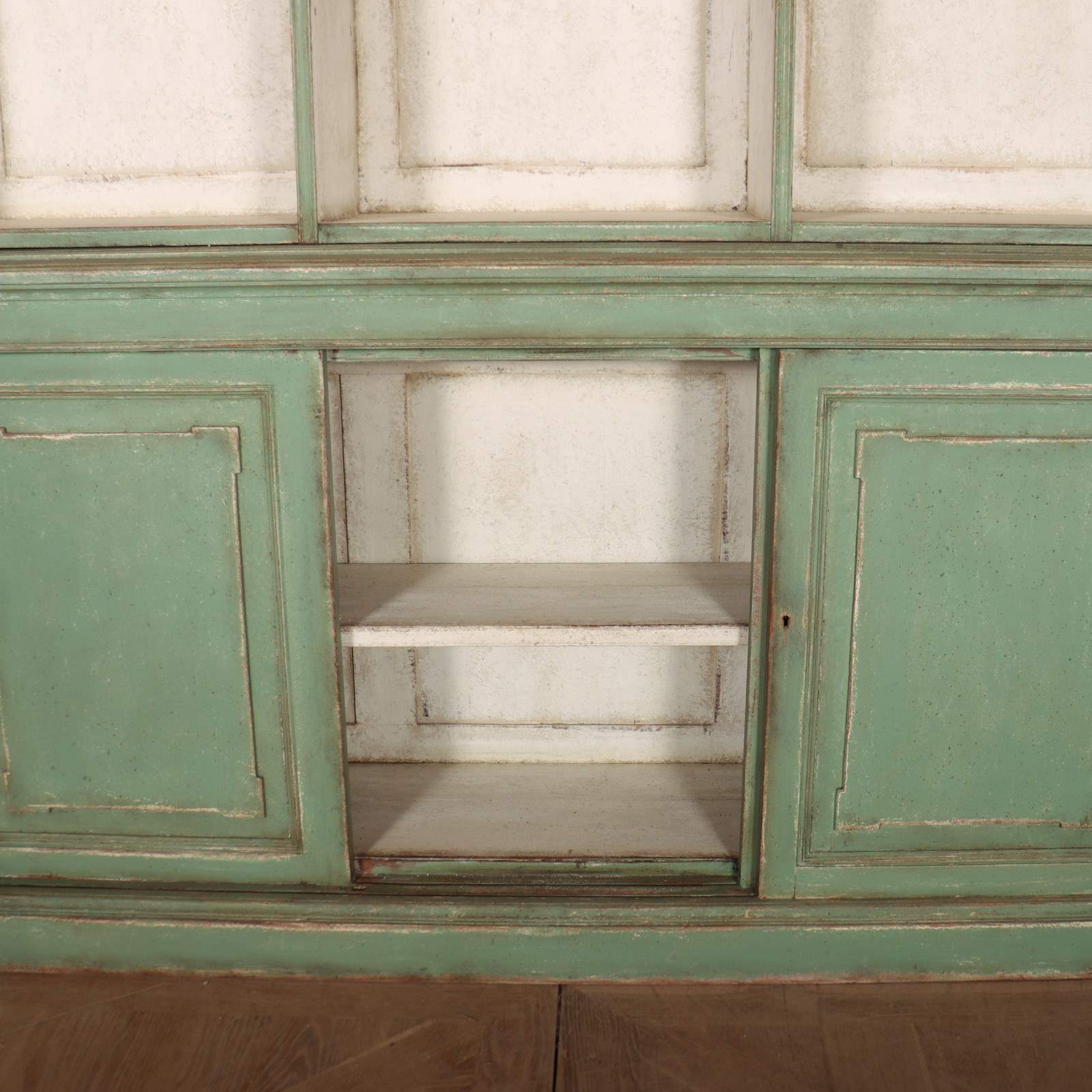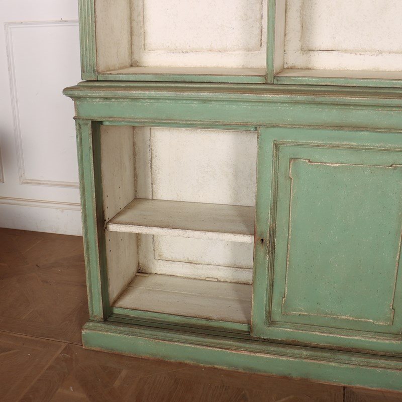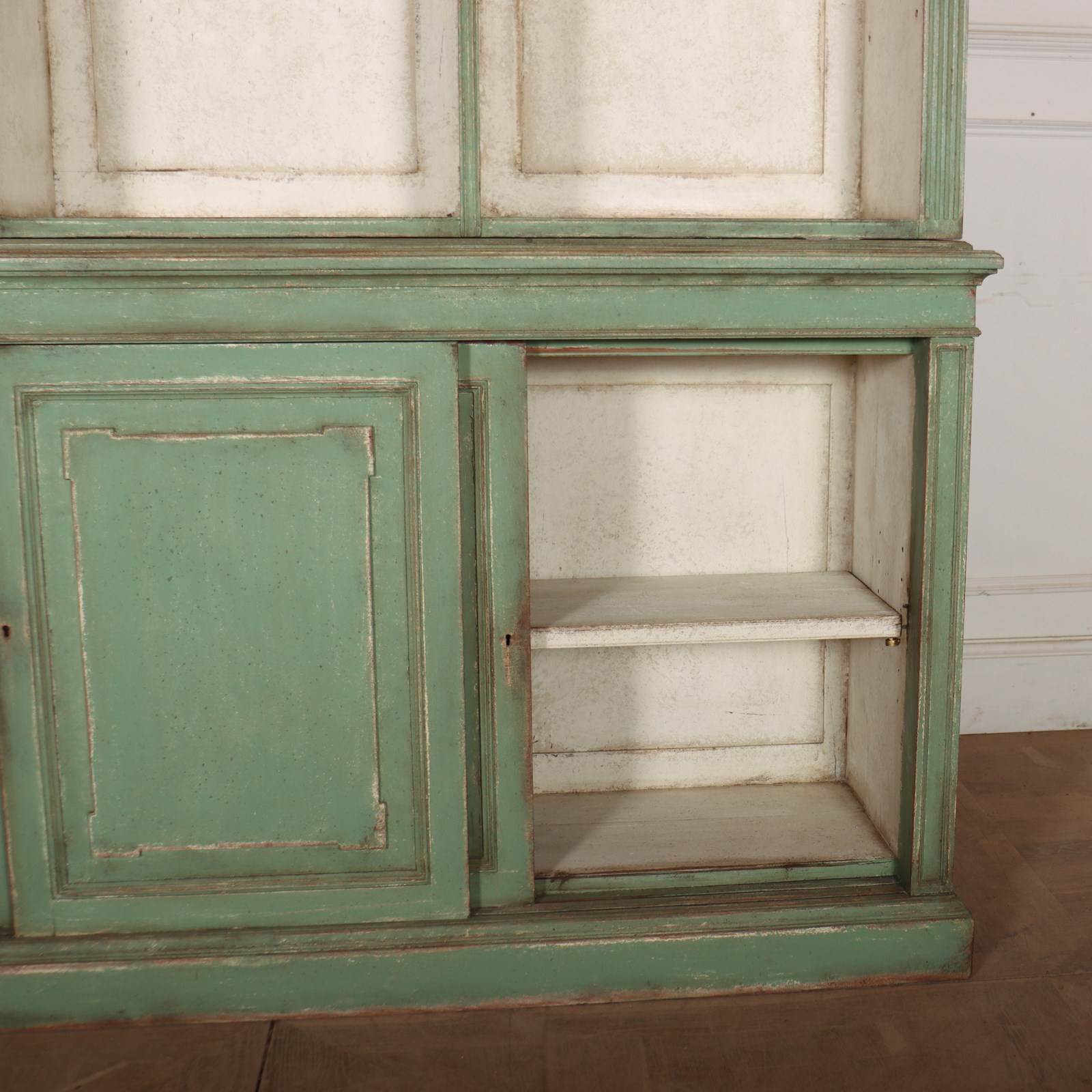 Very good 19th century English painted pine open bookcase with adjustable shelving and sliding doors. 1840.