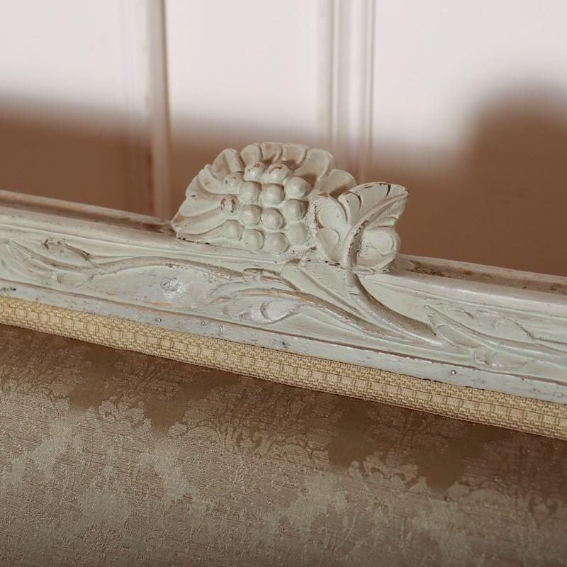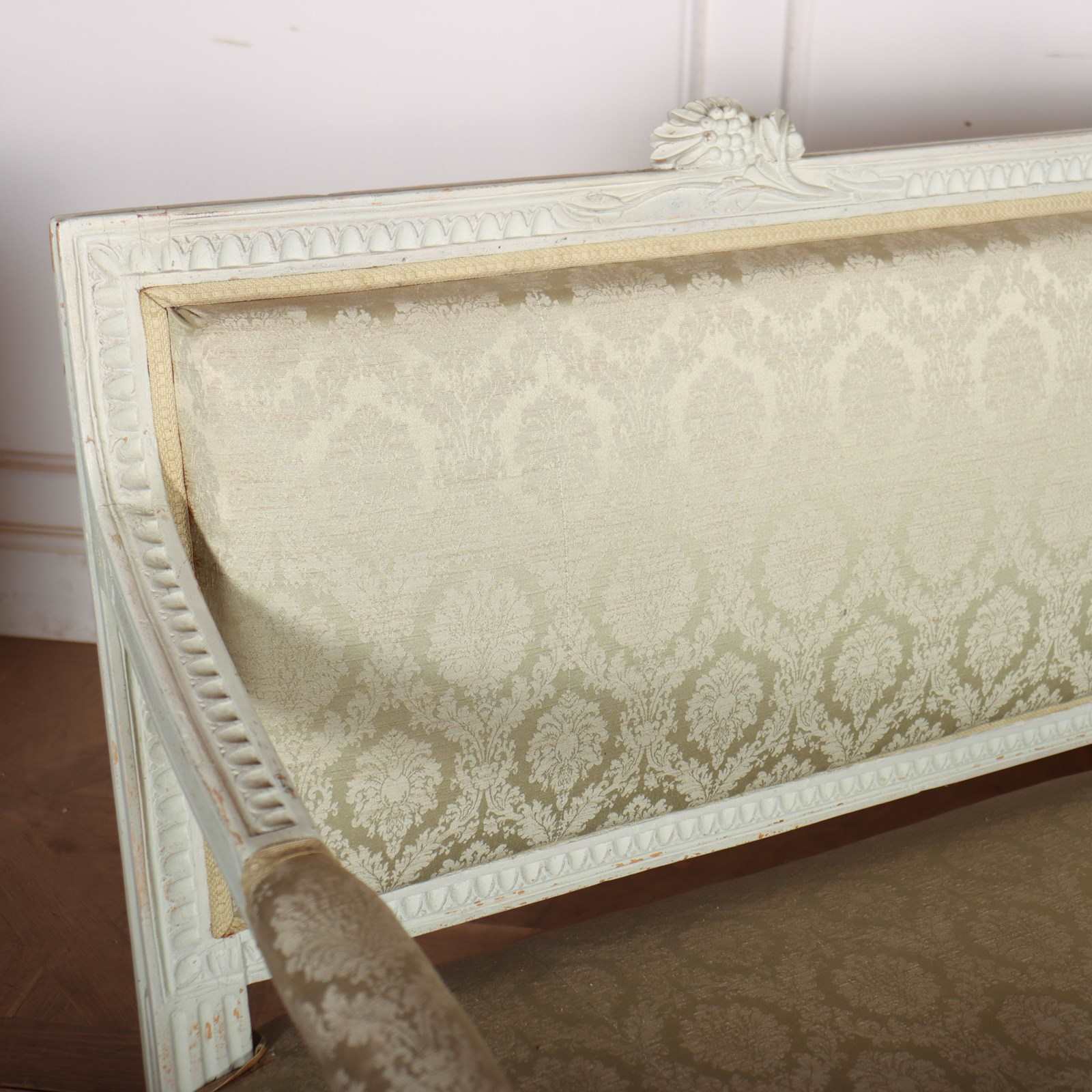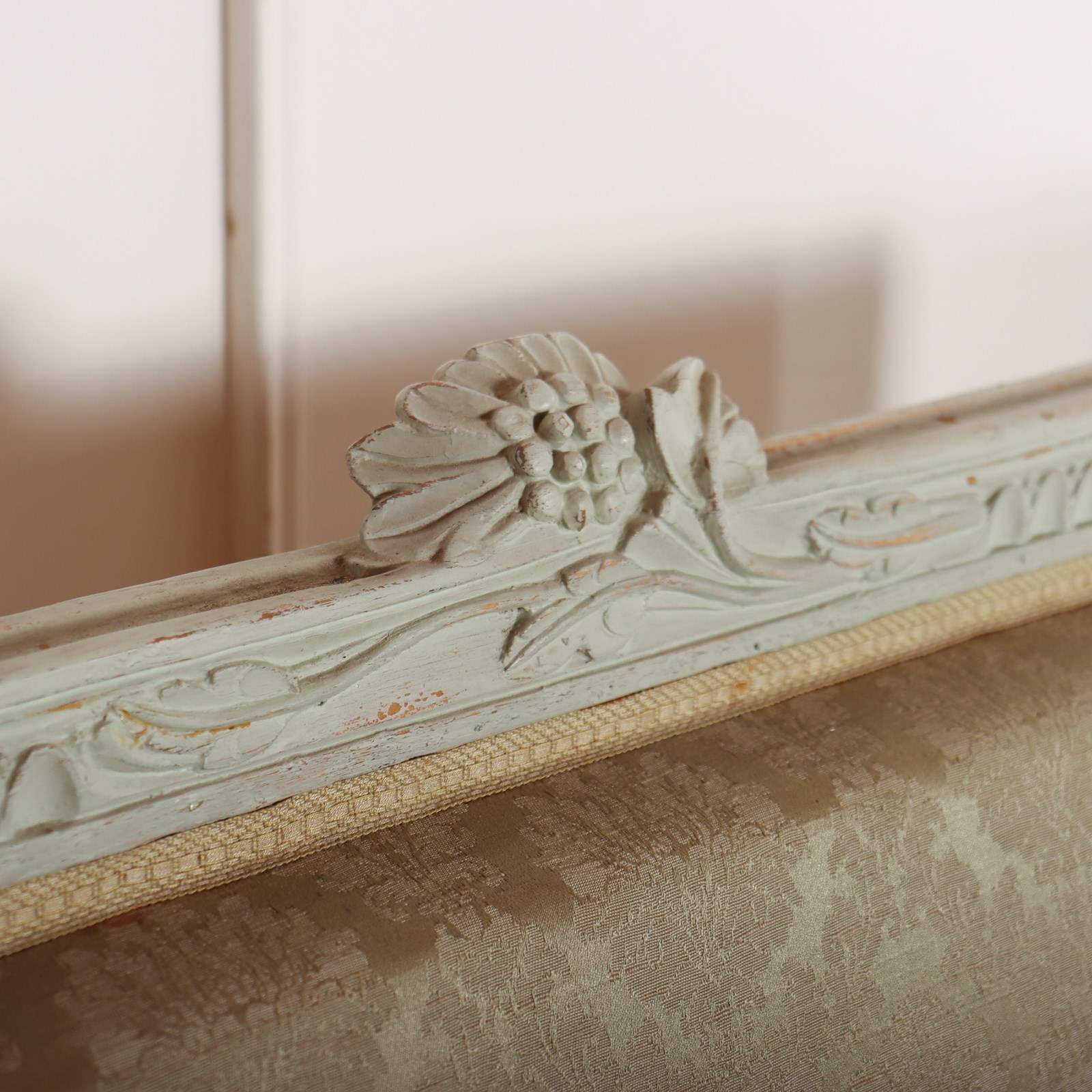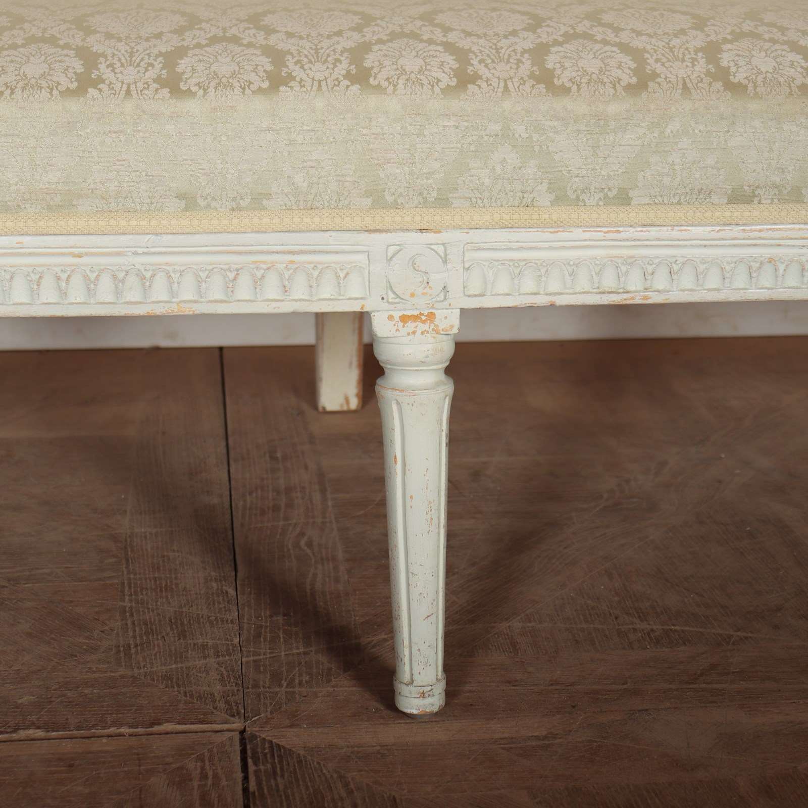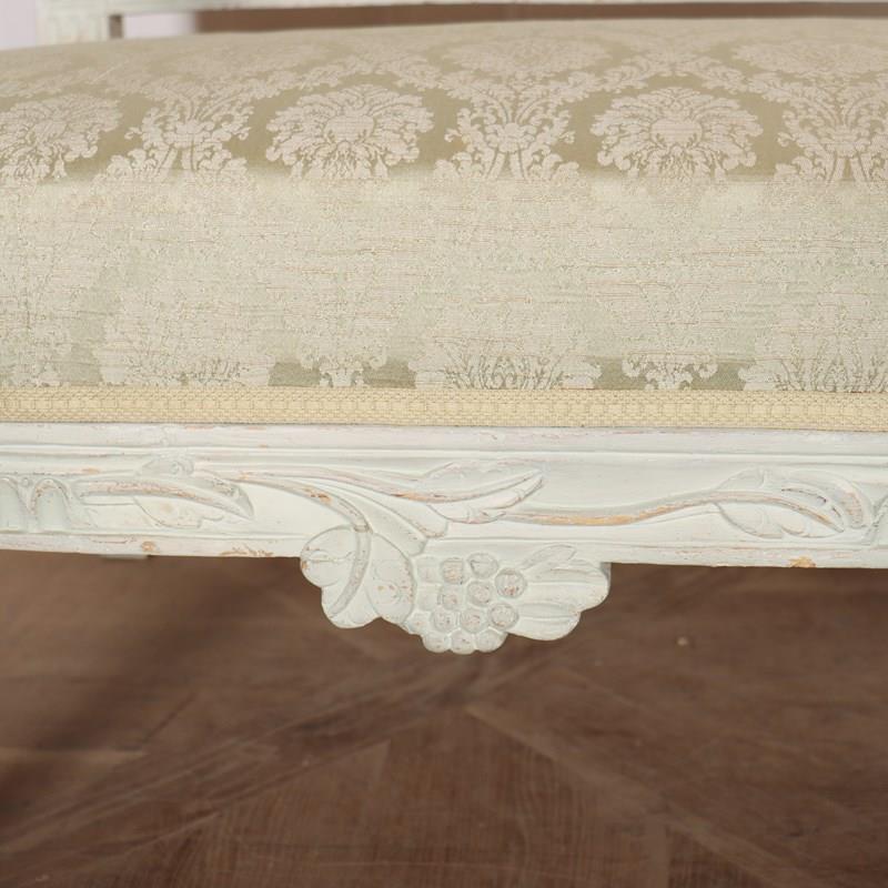 19th century Swedish carved and upholstered pine bench in worn, old grey paint. 1840.