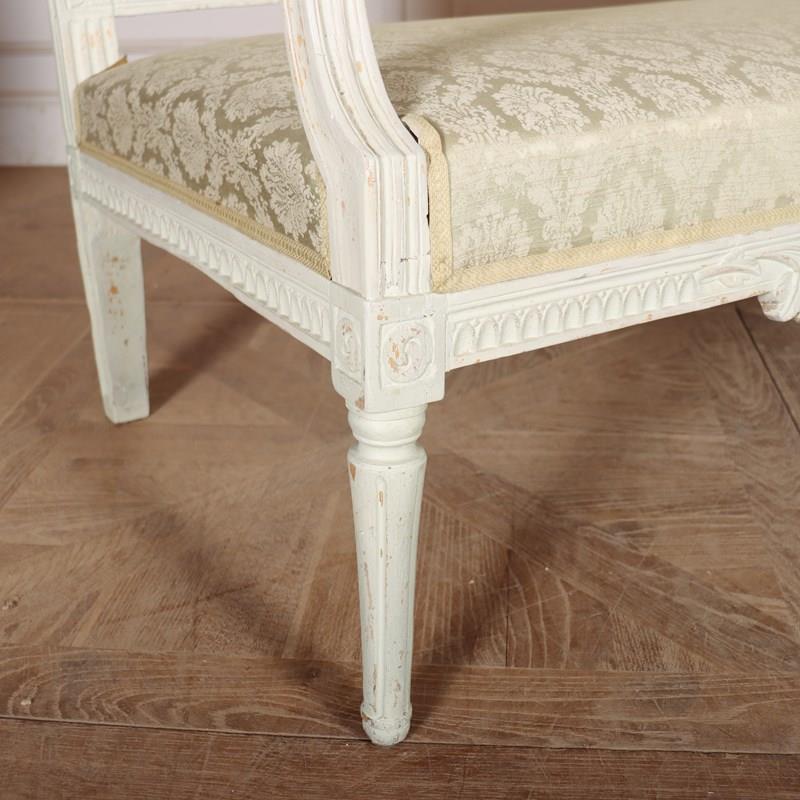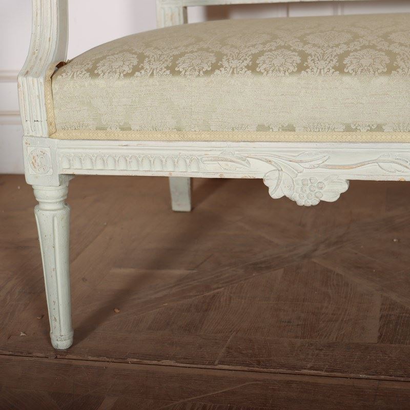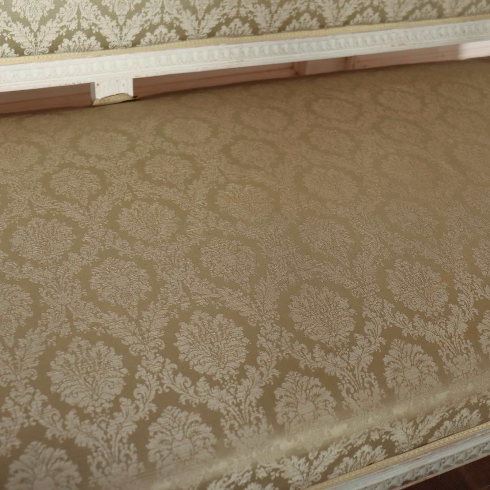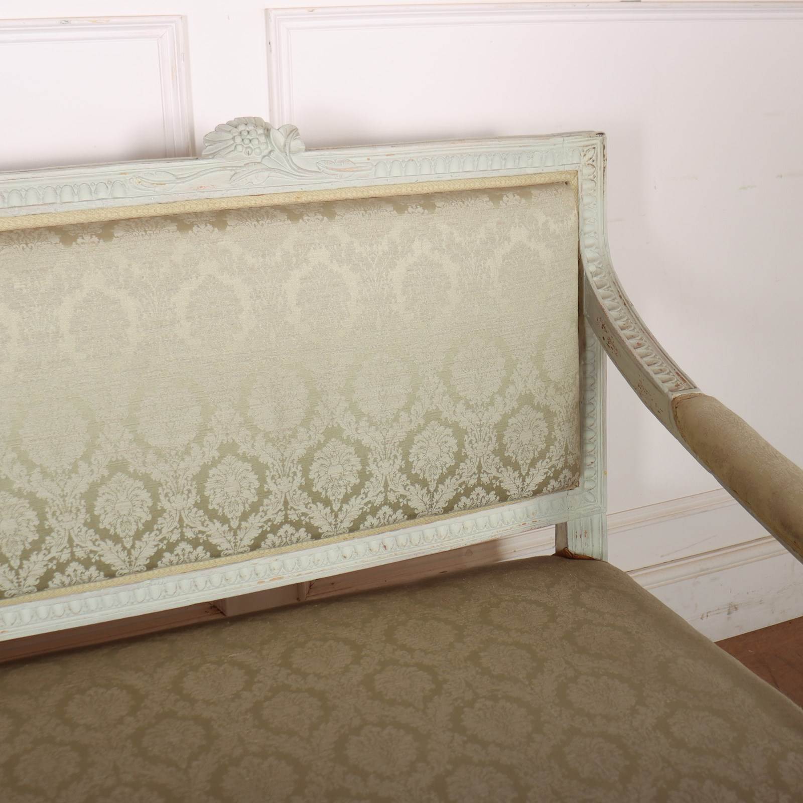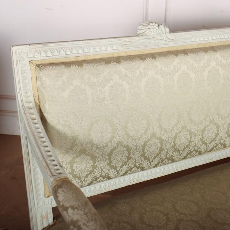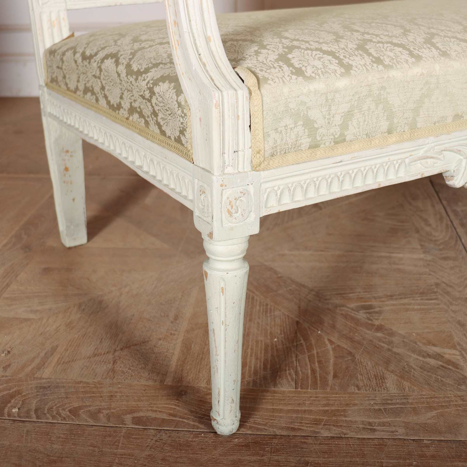 19th century Swedish carved and upholstered pine bench in worn, old grey paint. 1840.