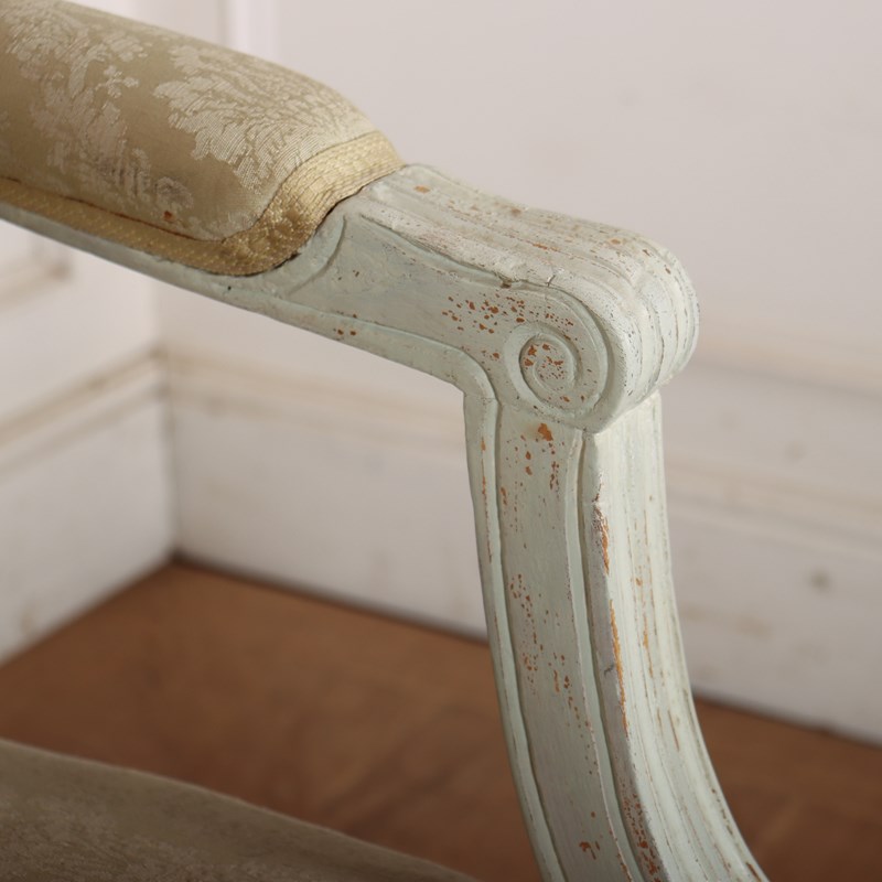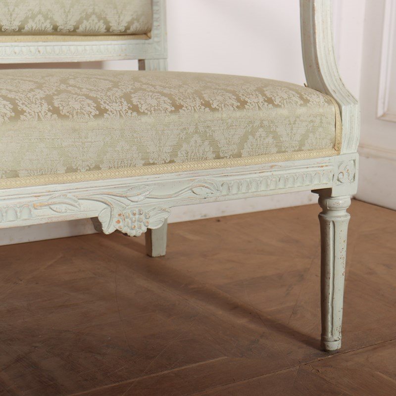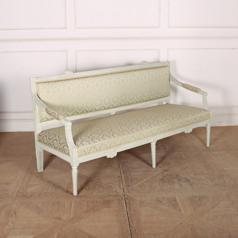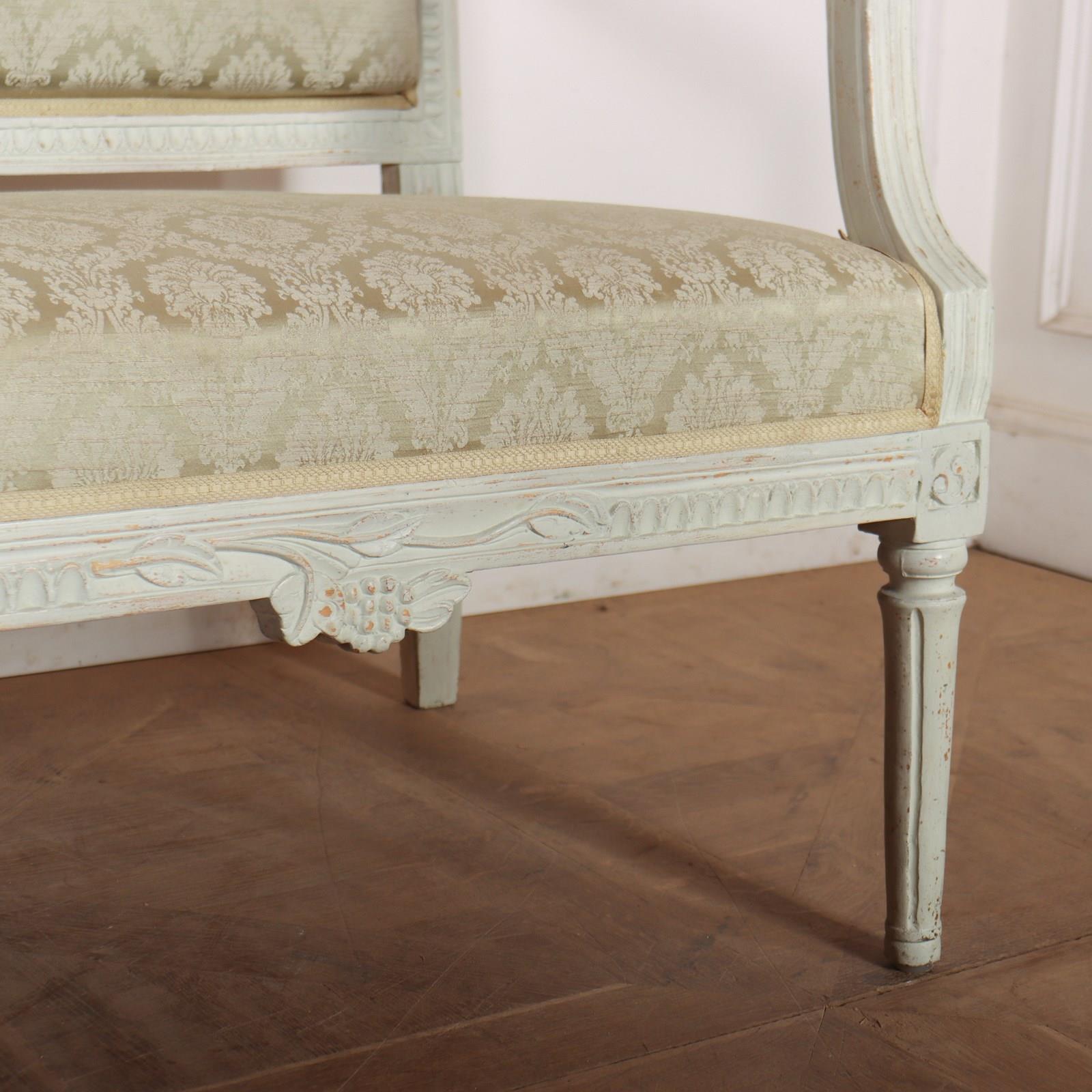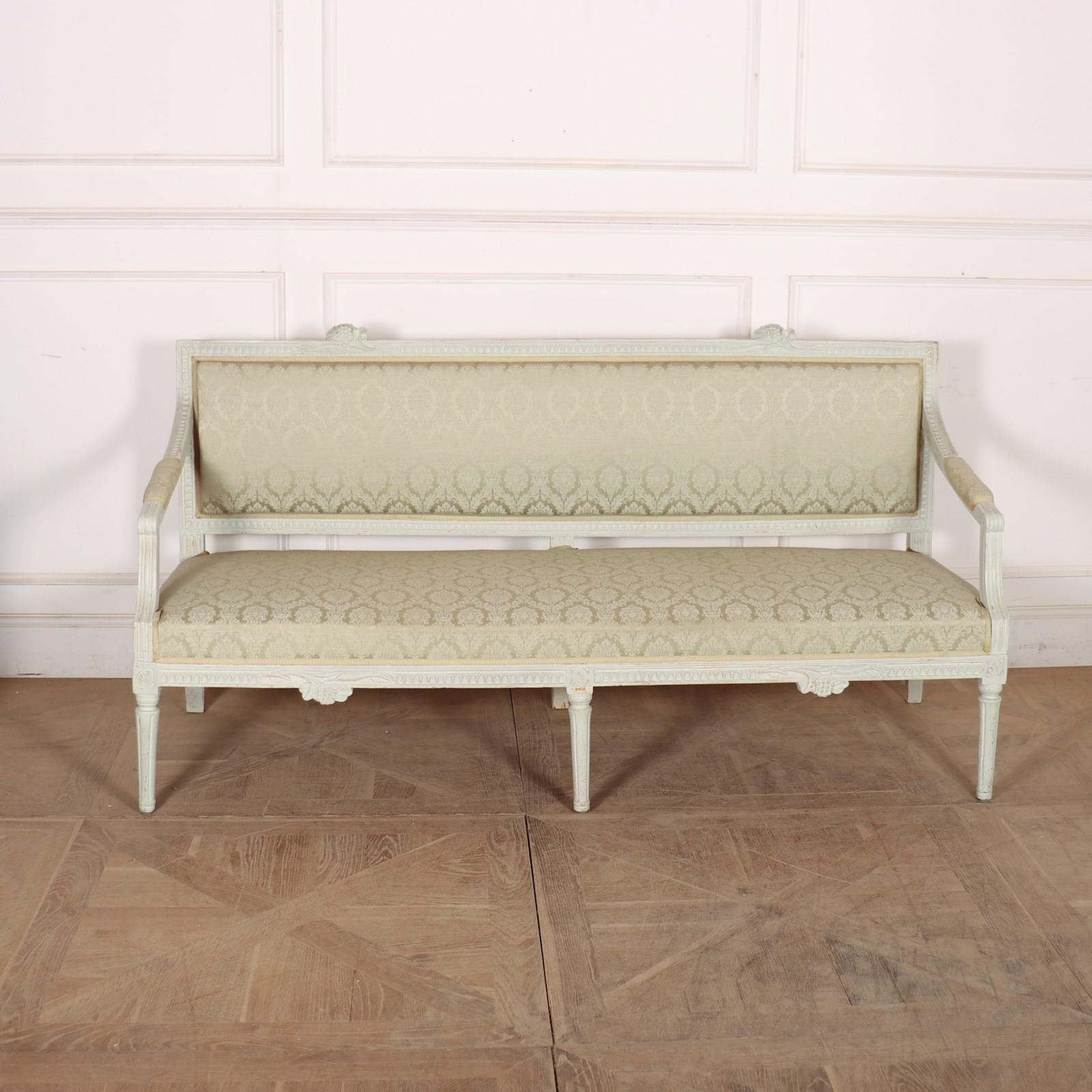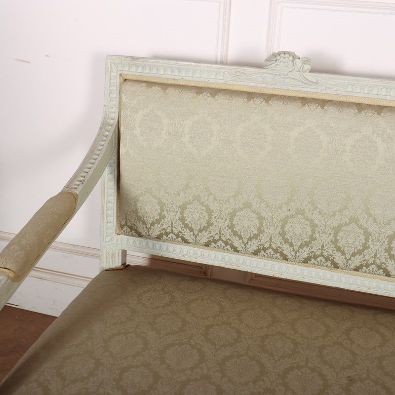 19th century Swedish carved and upholstered pine bench in worn, old grey paint. 1840.