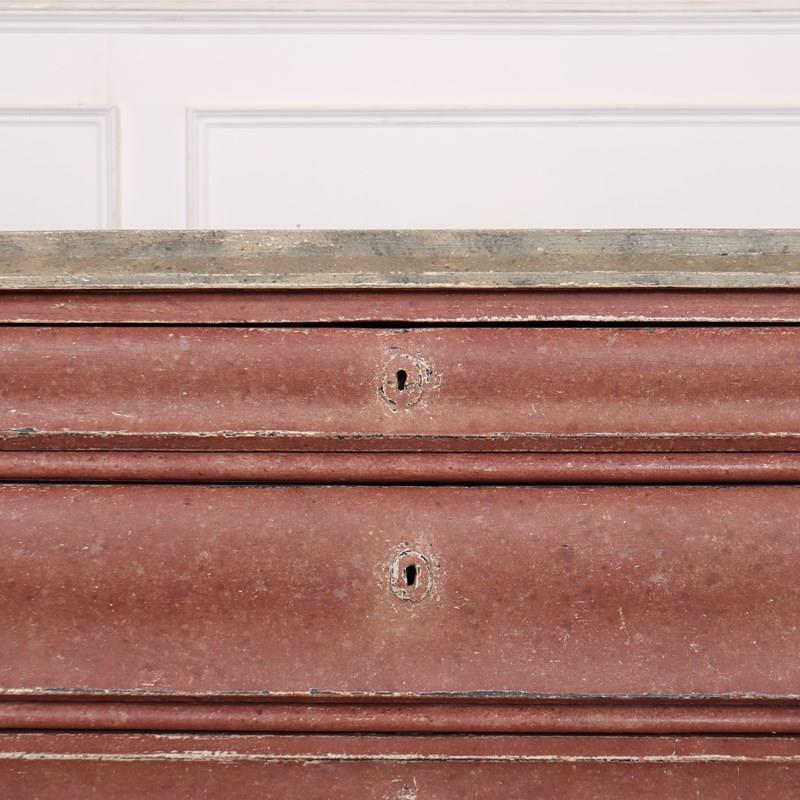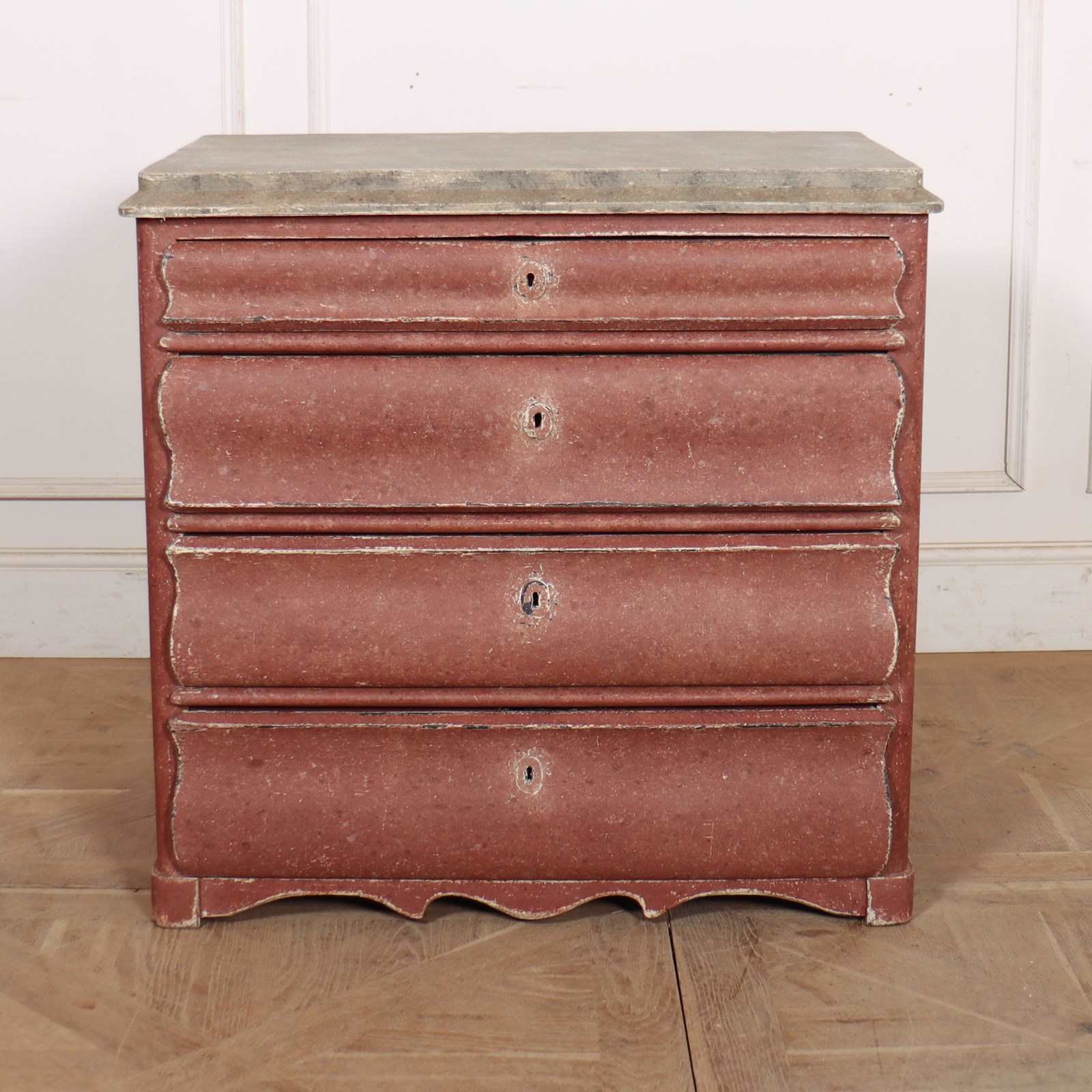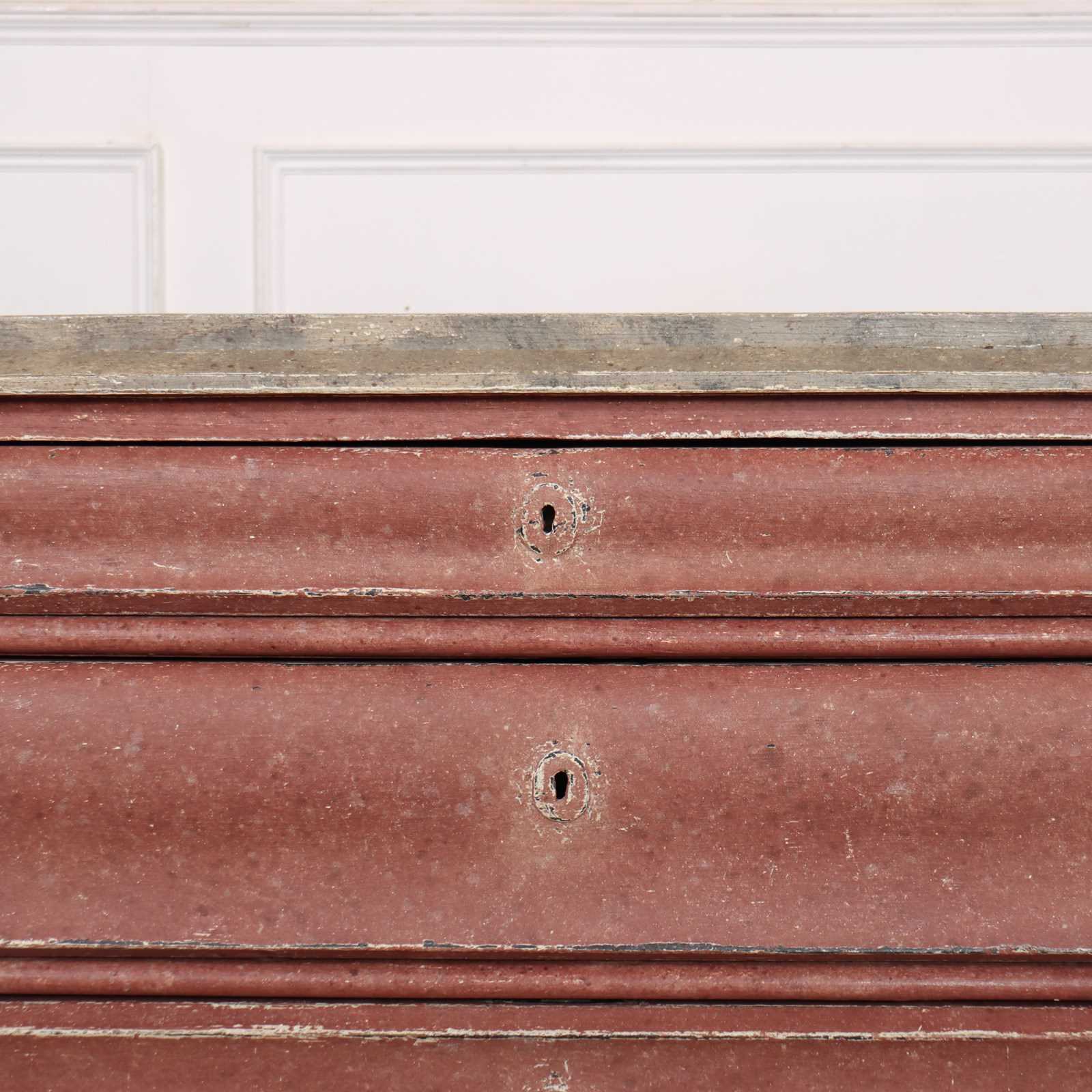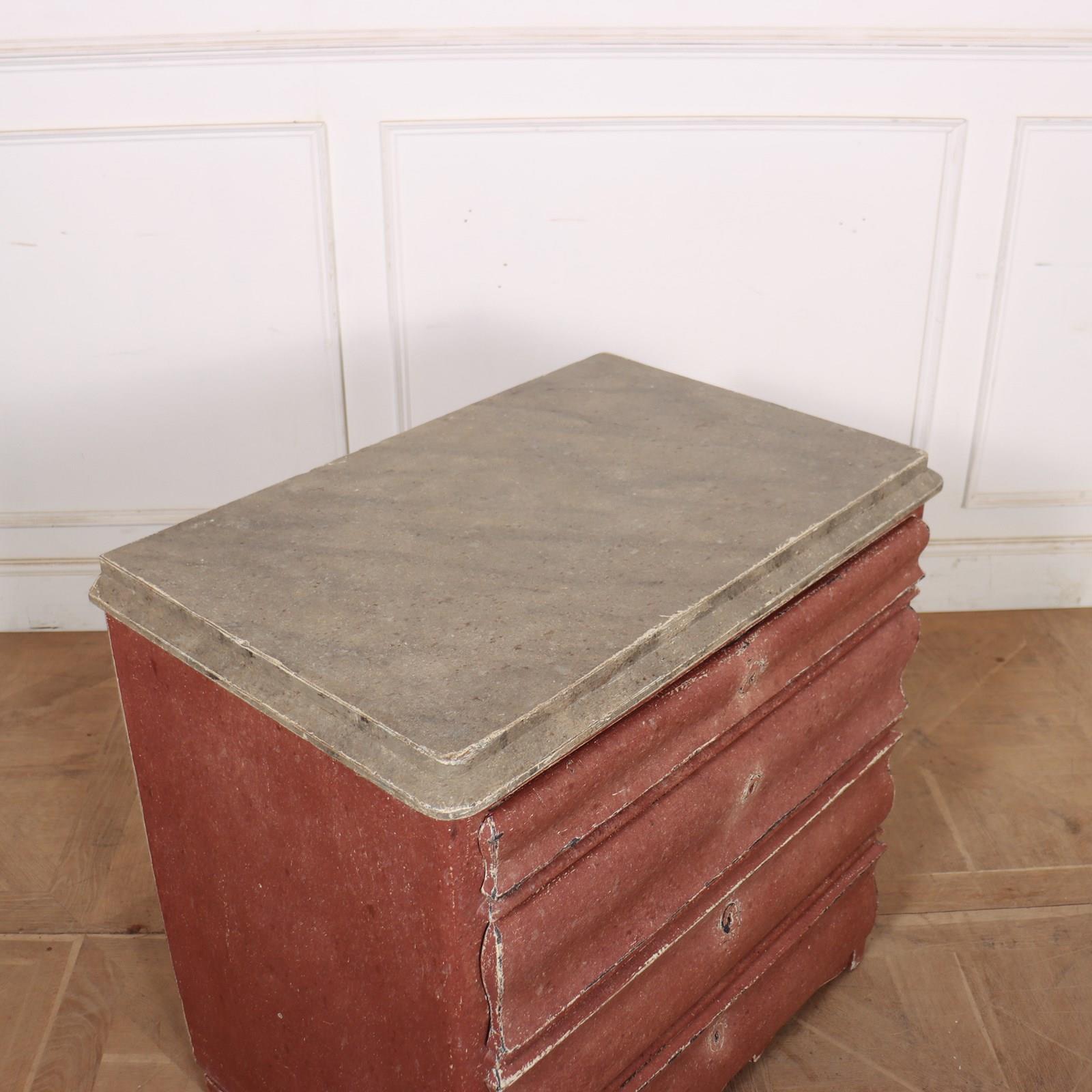 Interesting 19th C Danish painted 4 drawer commode with a painted faux marble top. The drawers do open but if you'd like handles then we can send you a photo of handles we stock or you can supply your own handles that we can fit. 1840