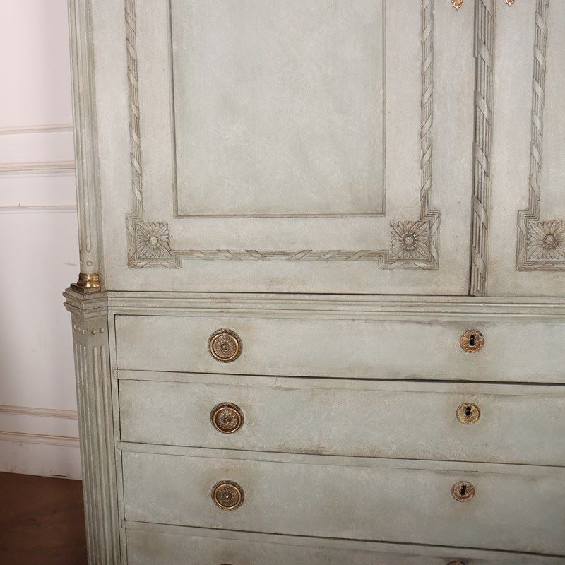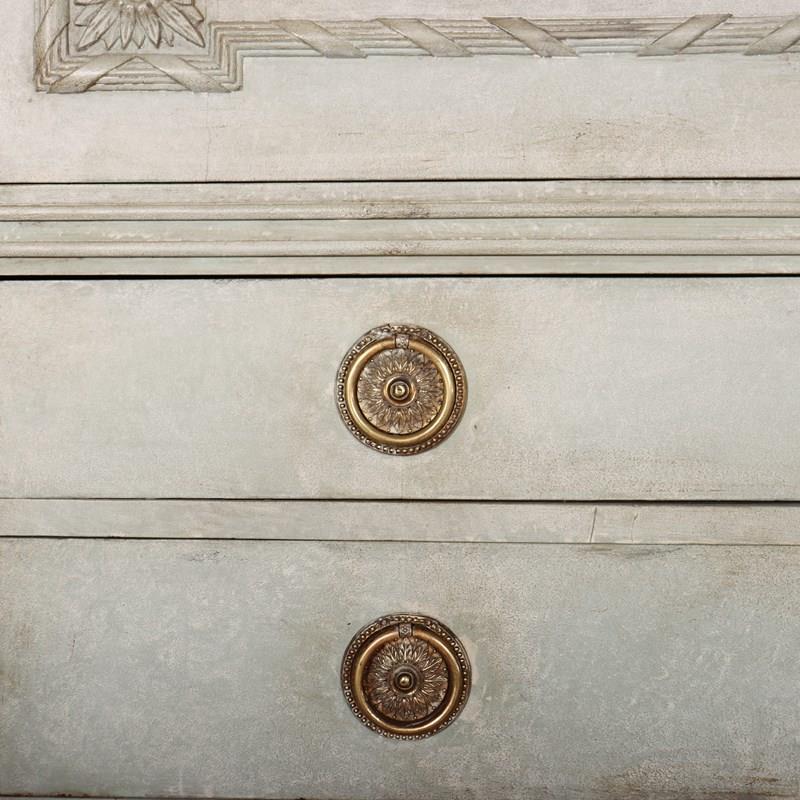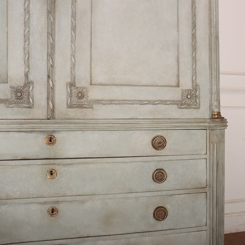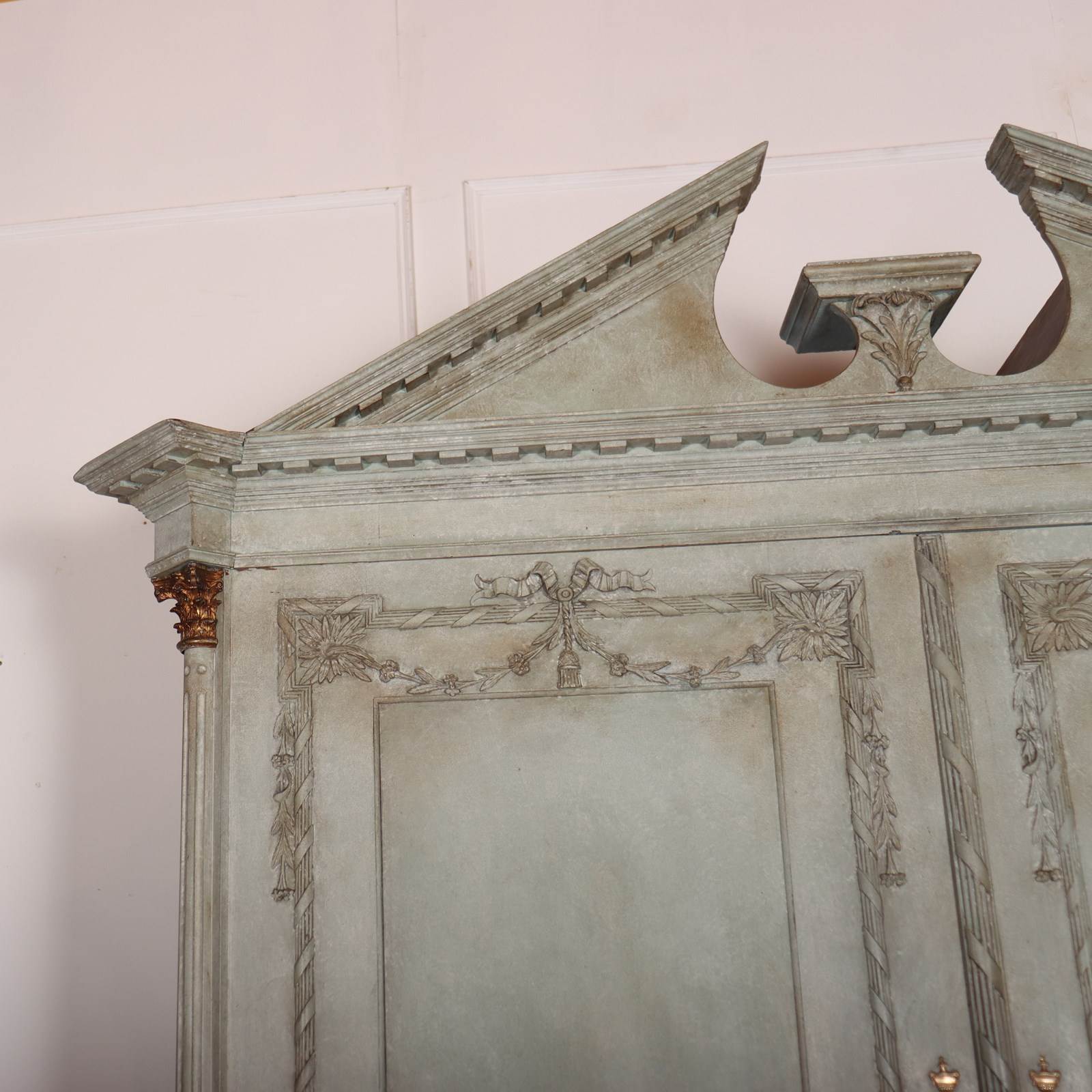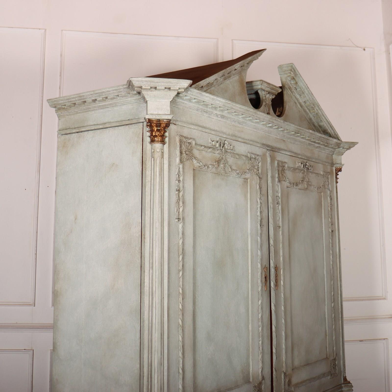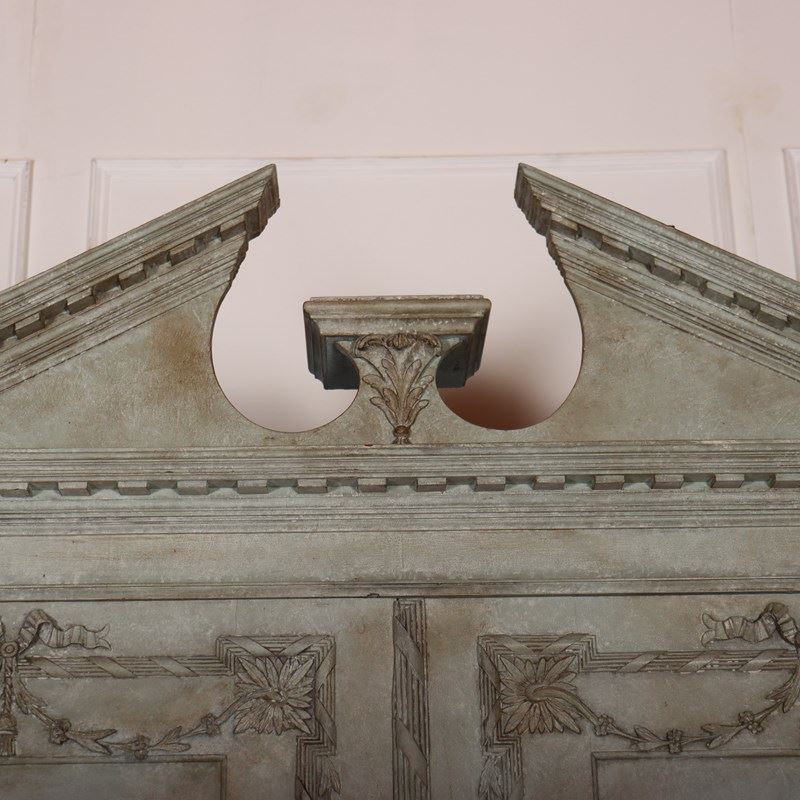 Stunning 18th century Dutch painted oak linen cupboard with lovely carved decoration and original brass hardware. 1780.
