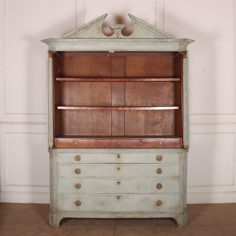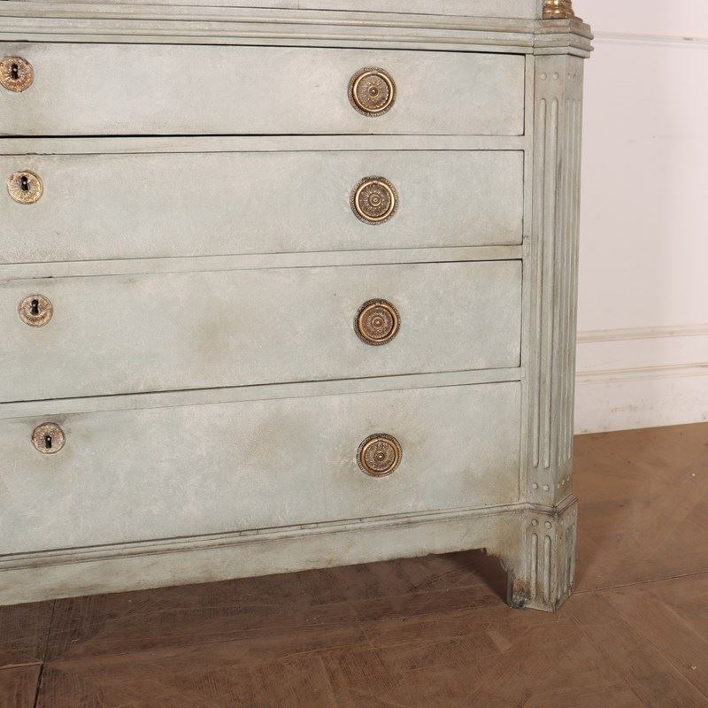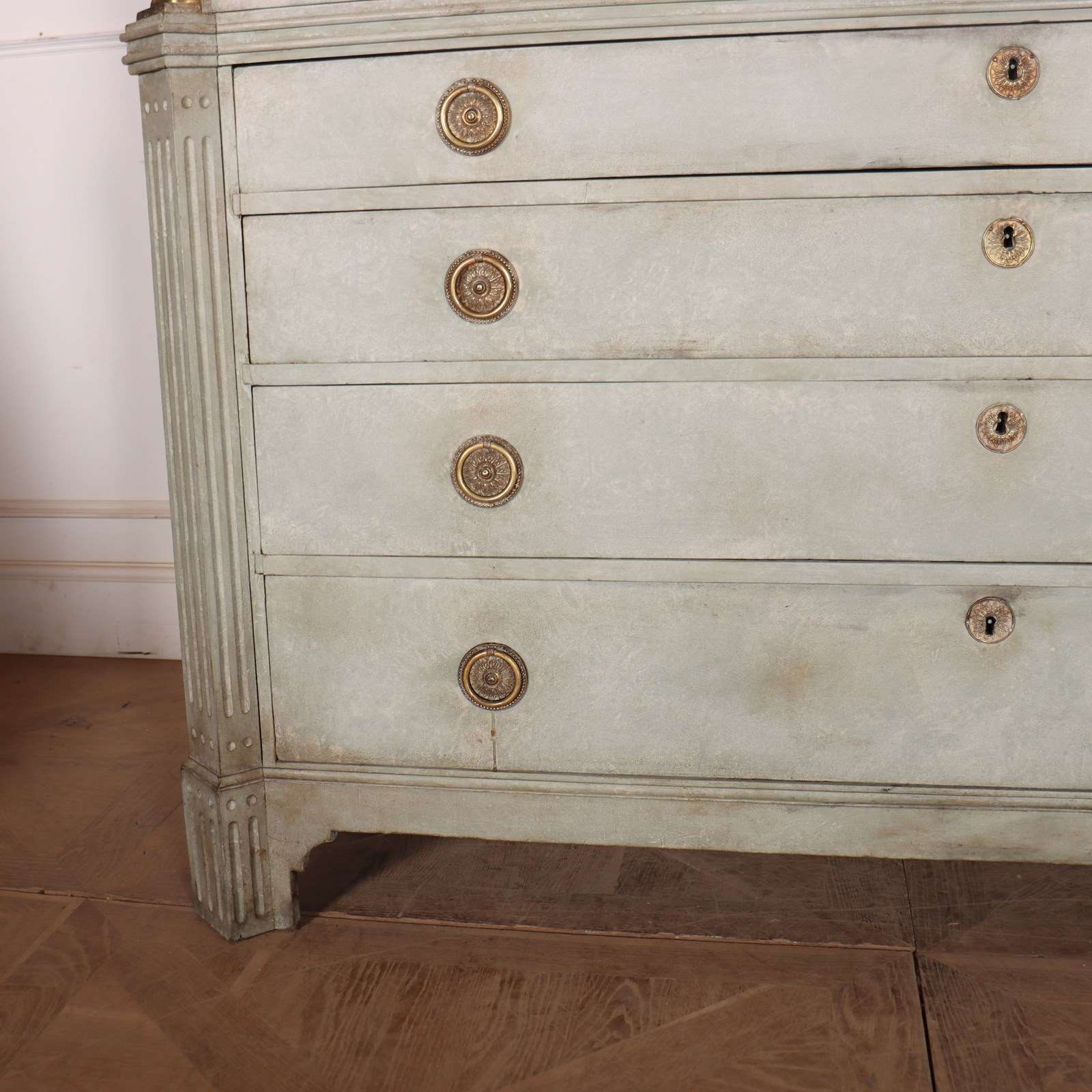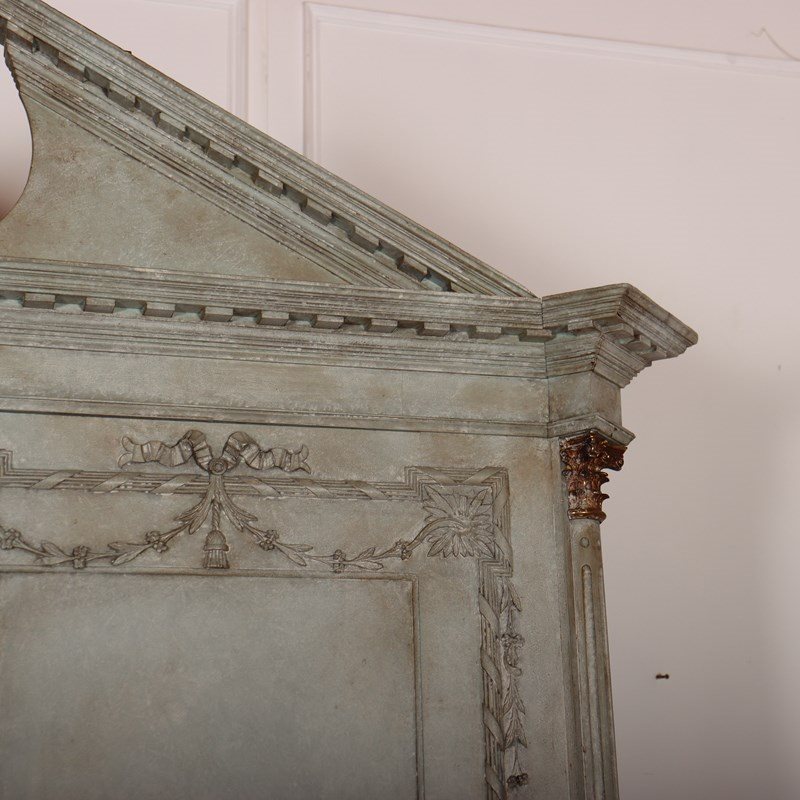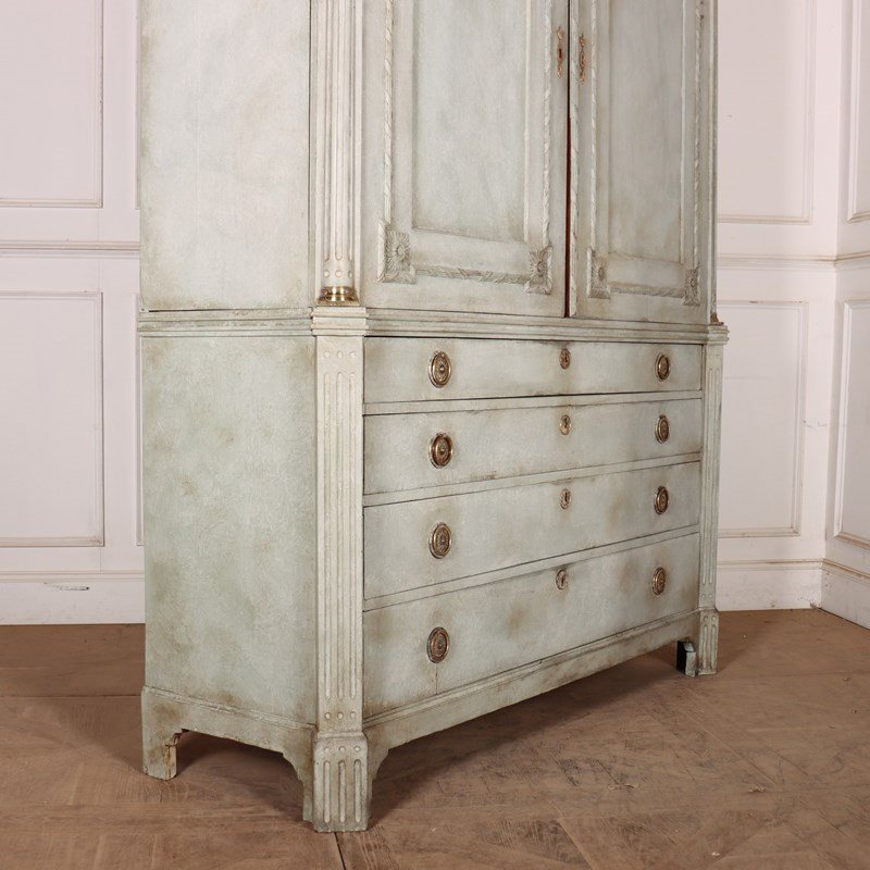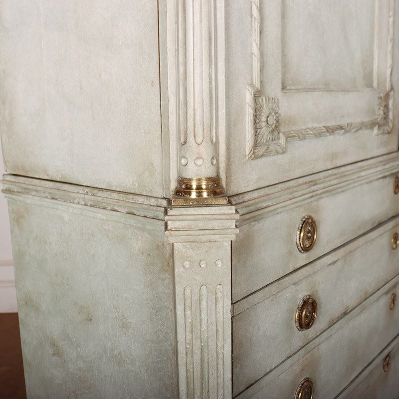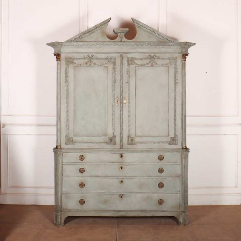 Stunning 18th century Dutch painted oak linen cupboard with lovely carved decoration and original brass hardware. 1780.