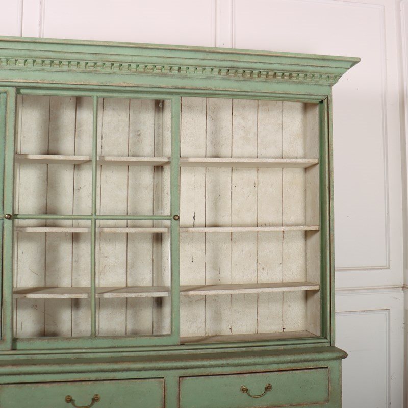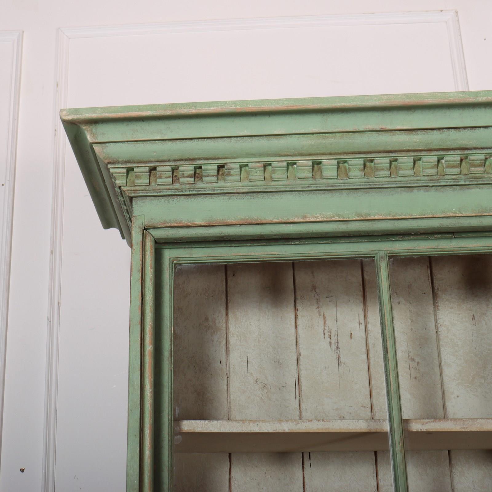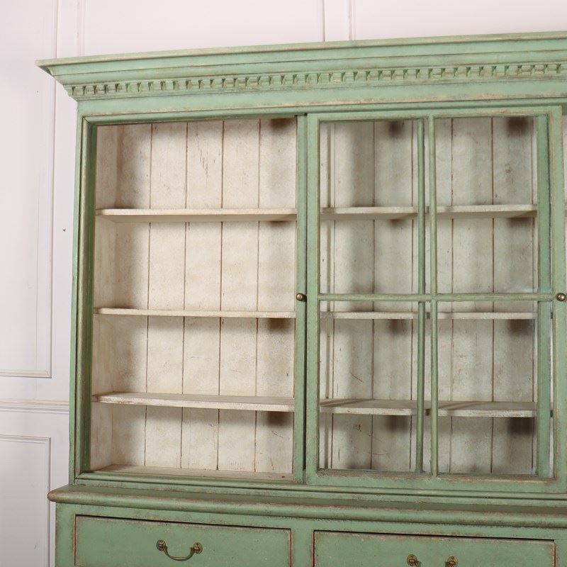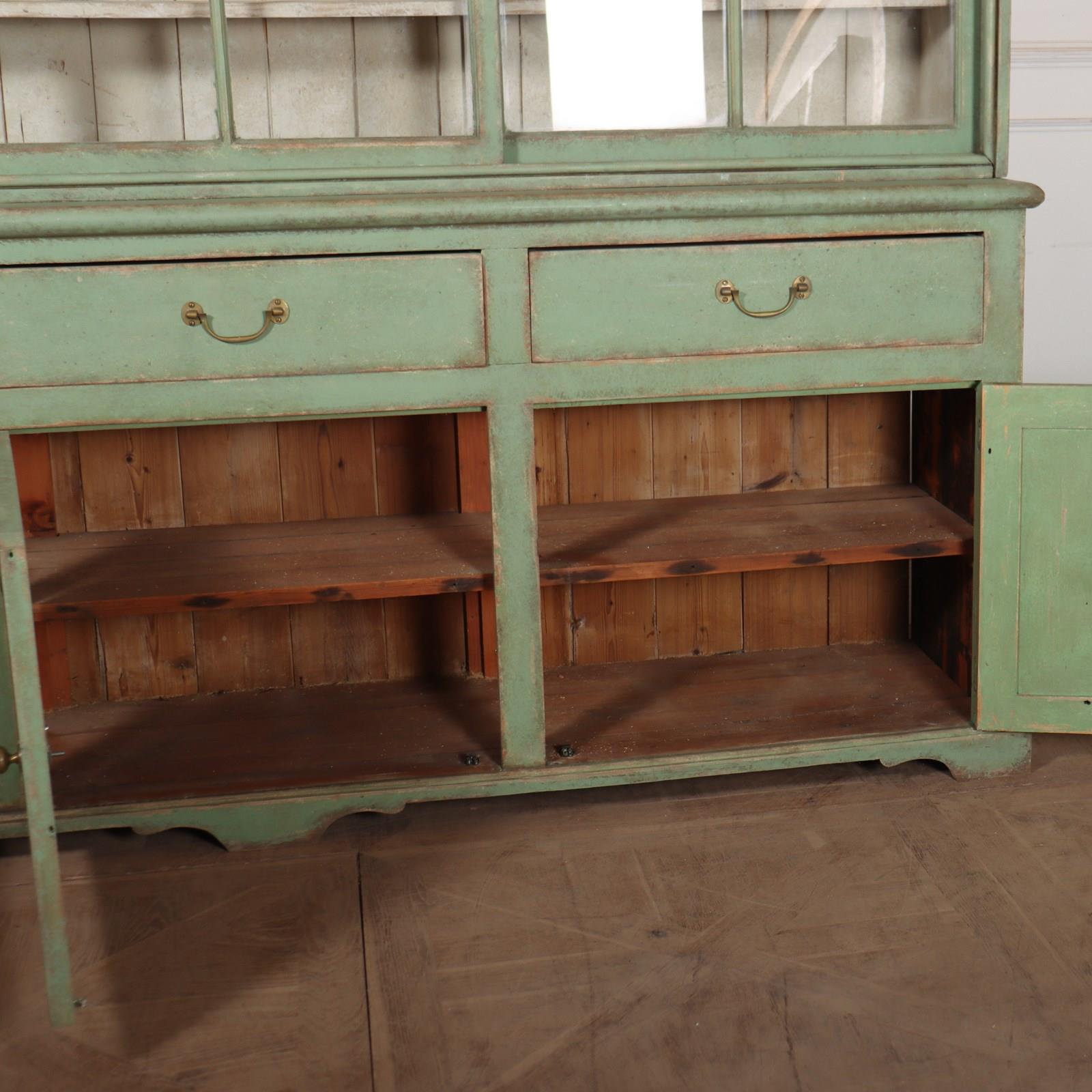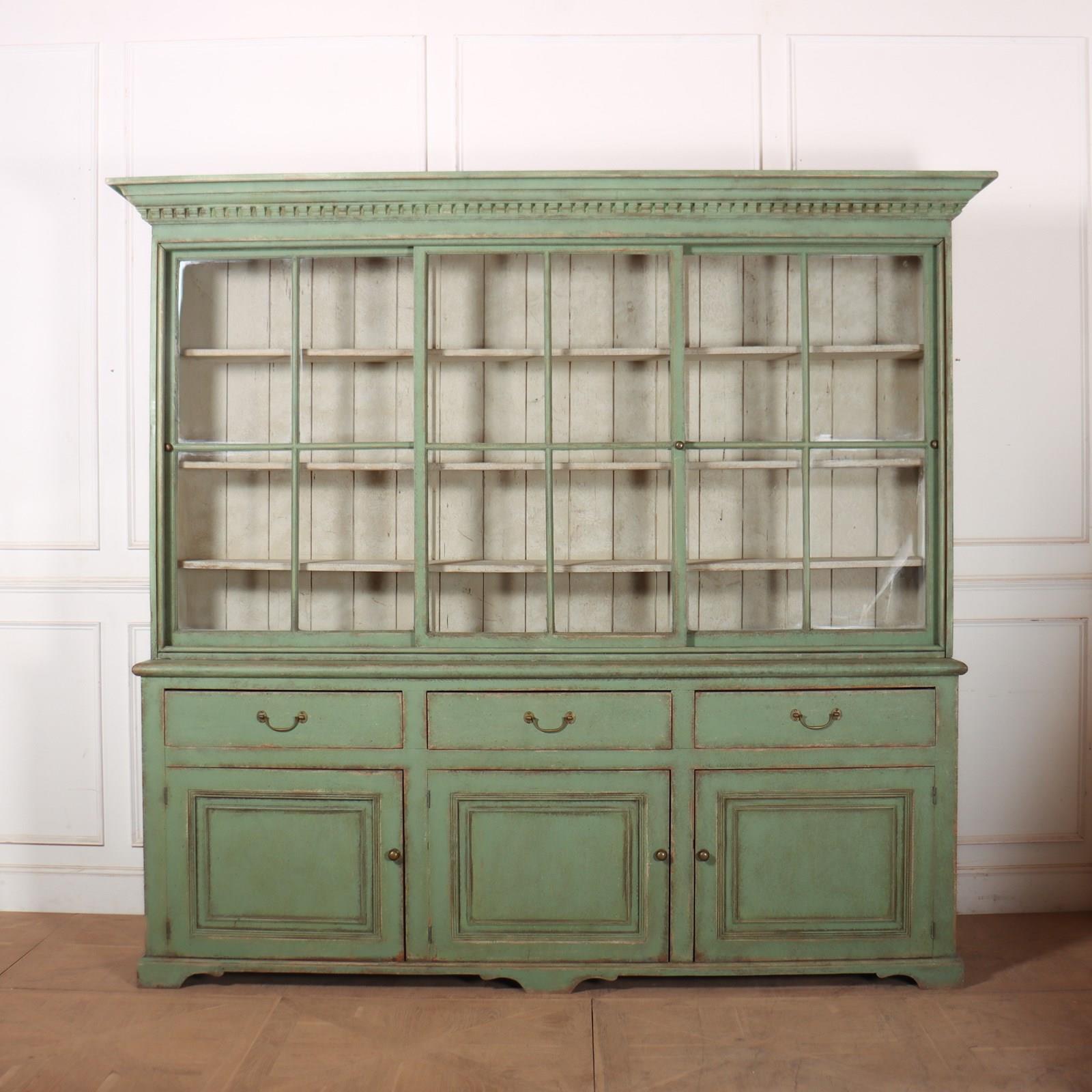 Fabulous English country house painted pine dresser with sliding glazed doors to the top. 1840.