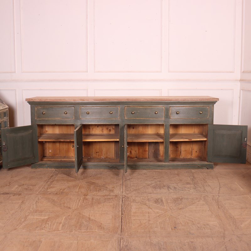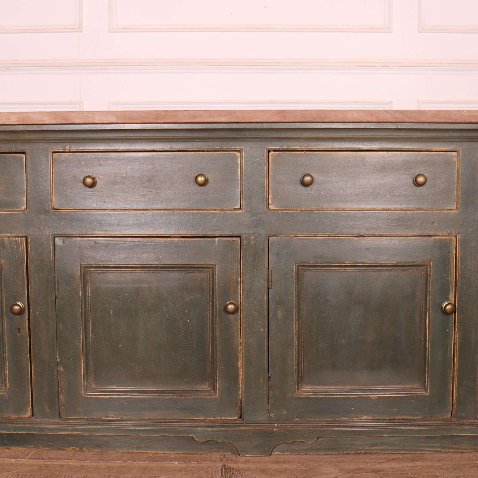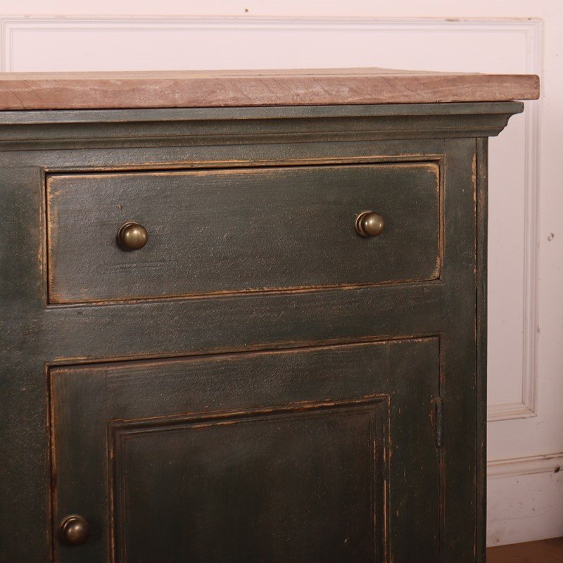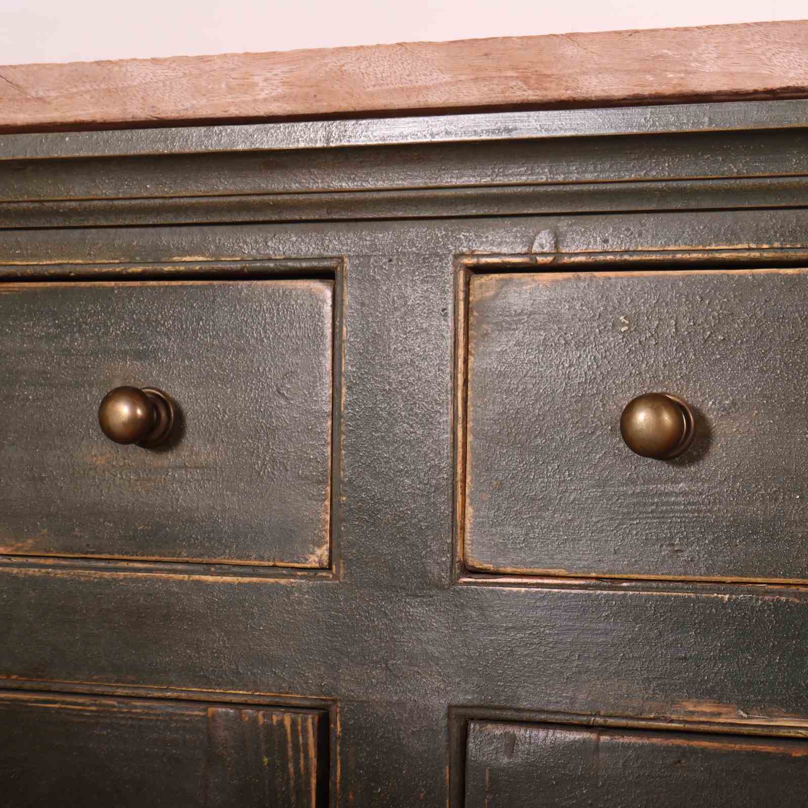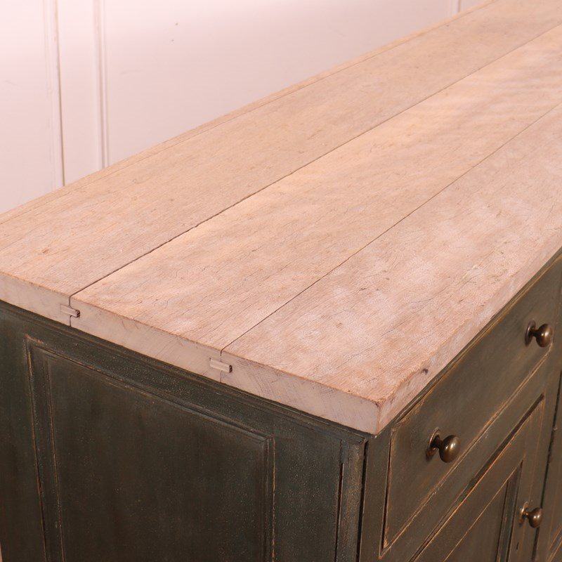 Very good early 19th C painted country house dresser base, with a thick scrubbed painted oak top. 1830