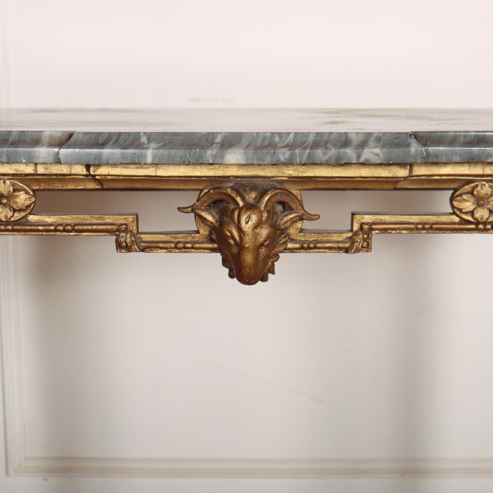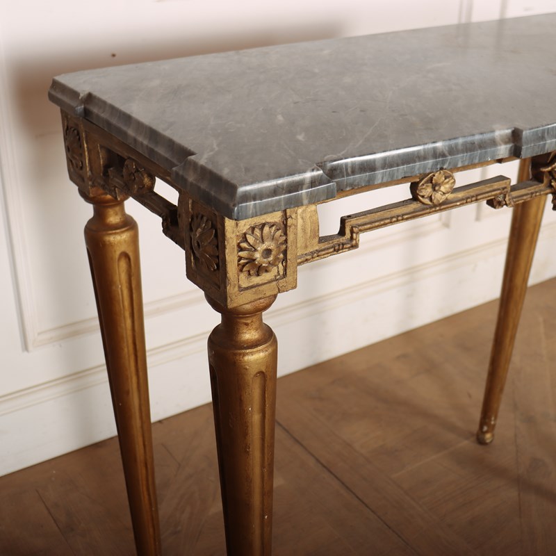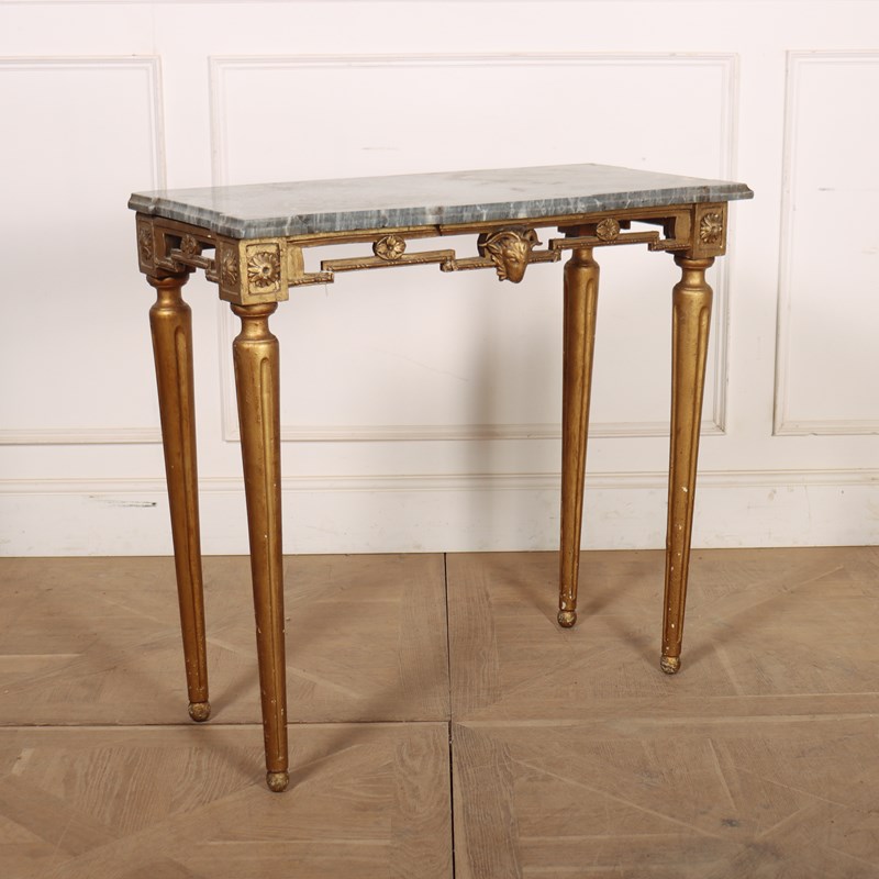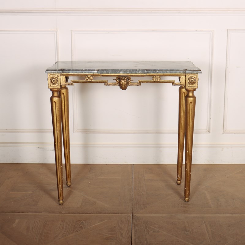 Small 19th century English guilt and marble topped pine console table. 1860.