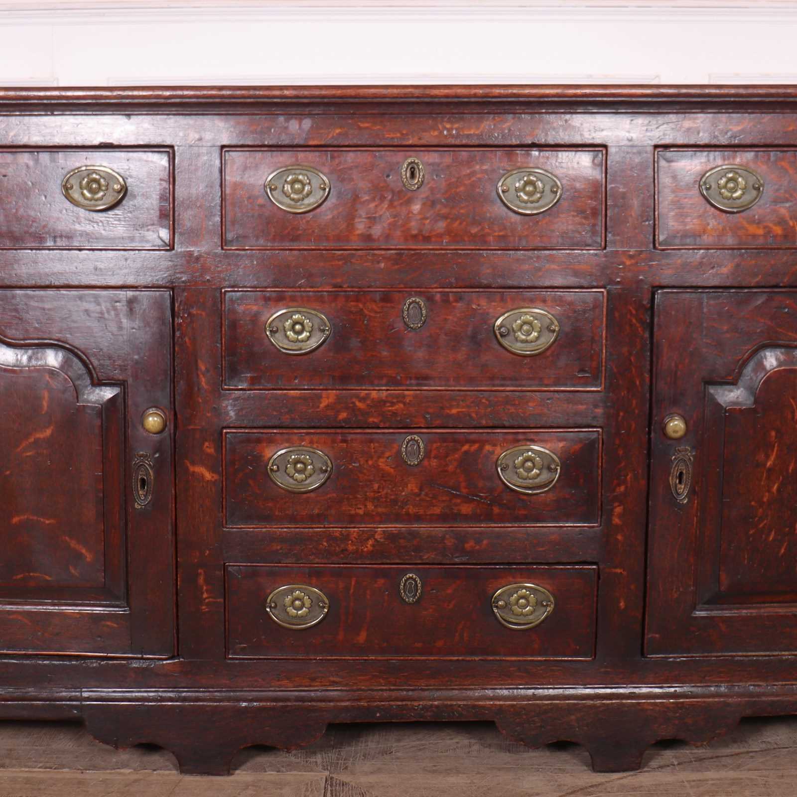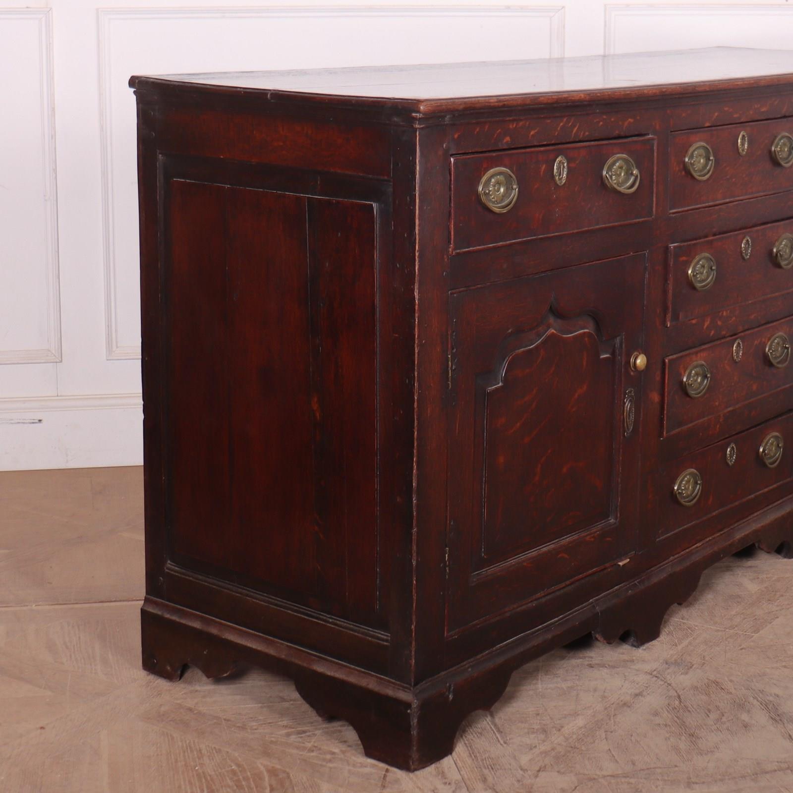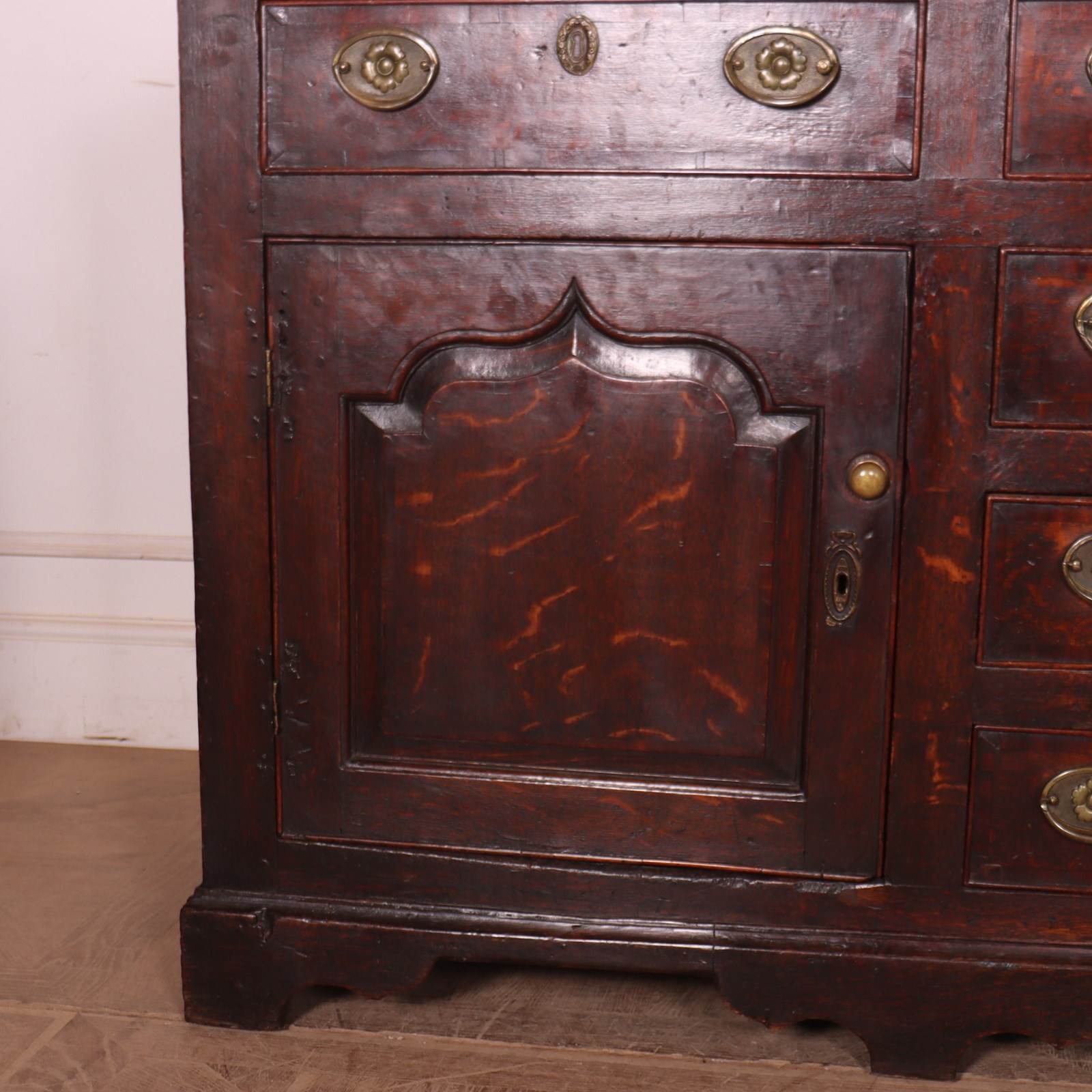 Stunning late 18th C English oak dresser base with carved fielded panels and a wonderful colour. 1790