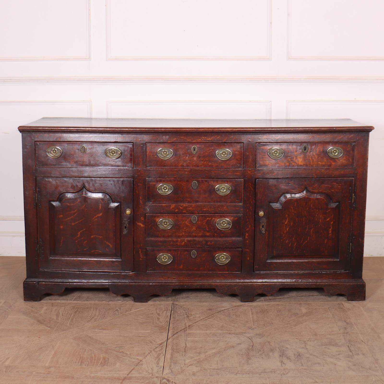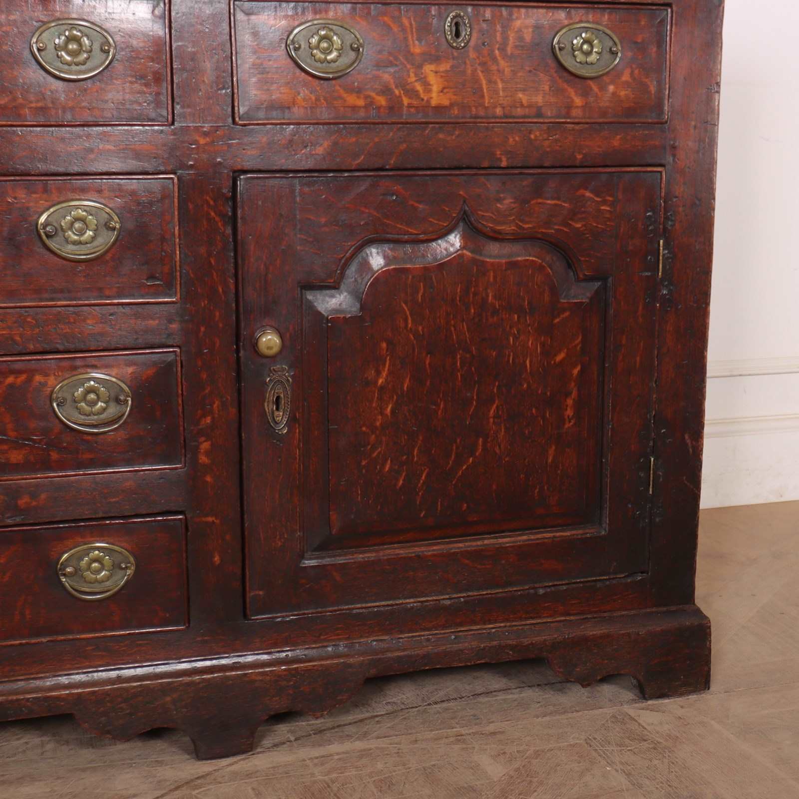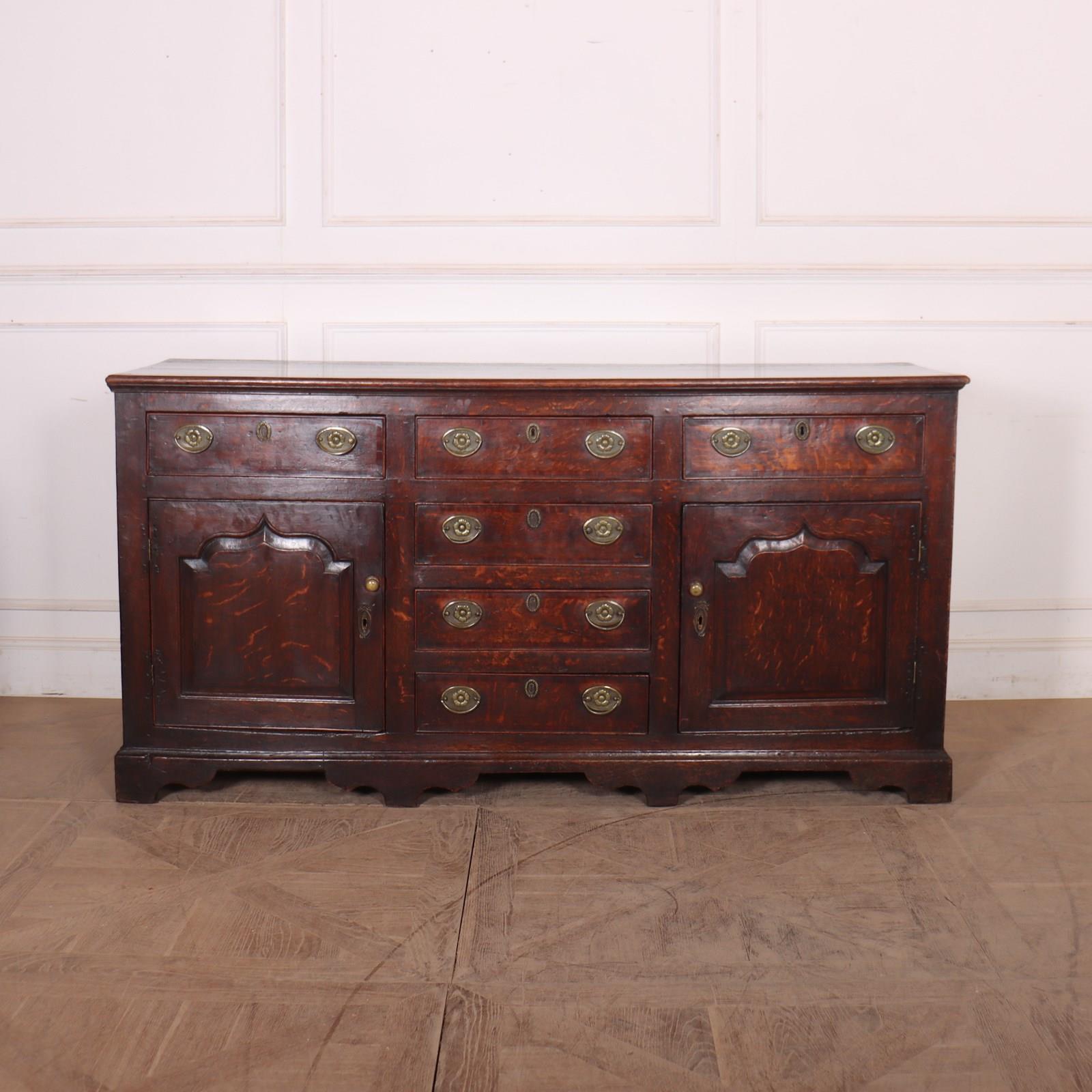 Stunning late 18th C English oak dresser base with carved fielded panels and a wonderful colour. 1790