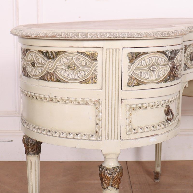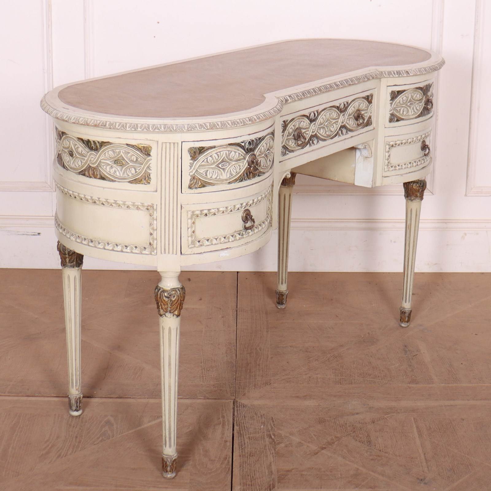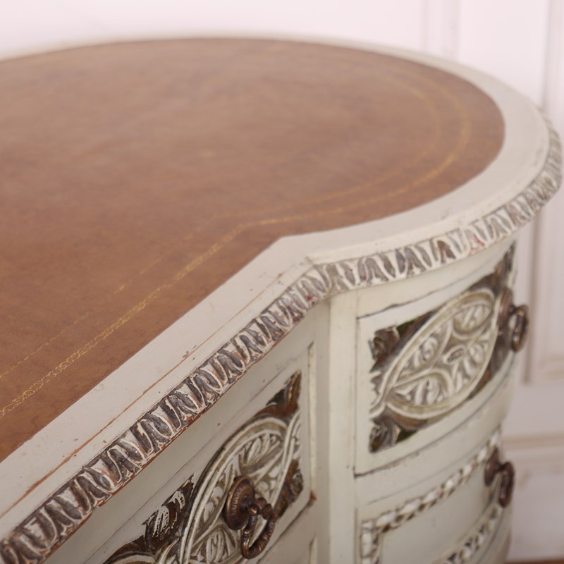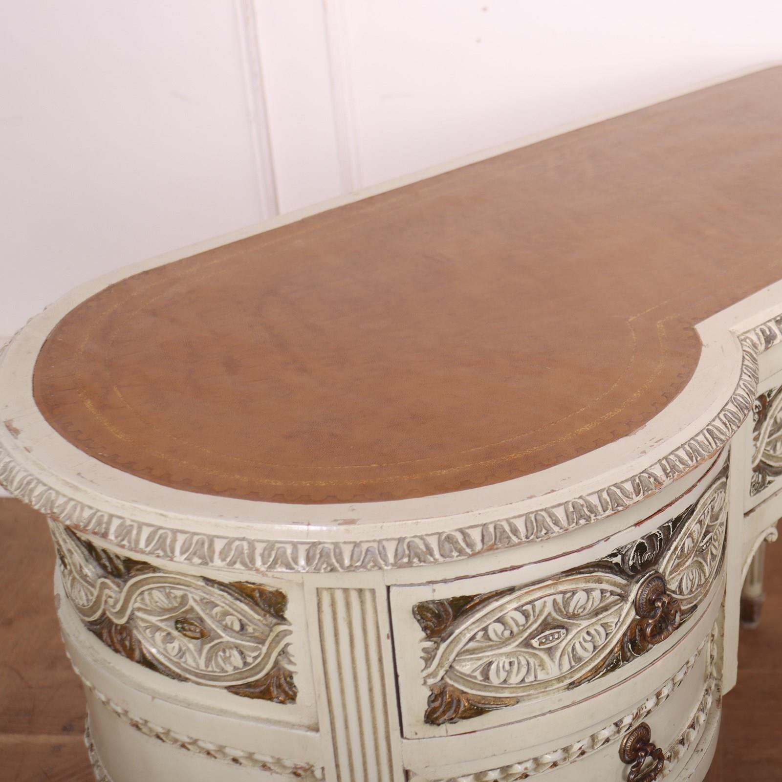 19th C English painted and carved pine kidney shaped desk with inset leather. 1880