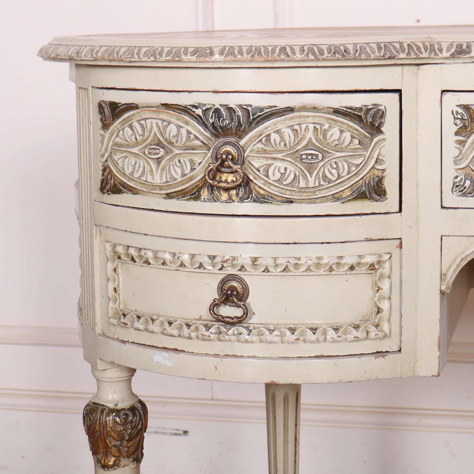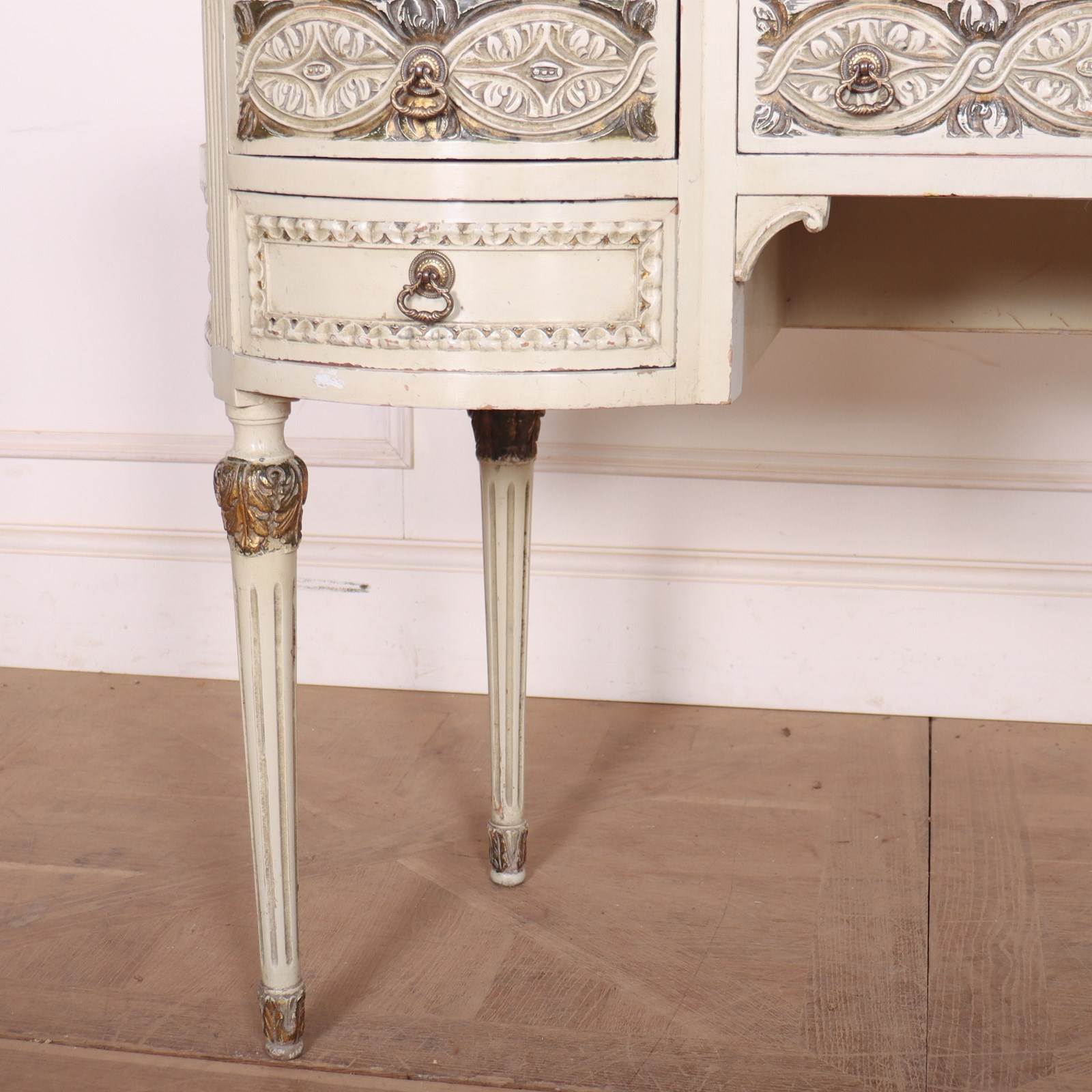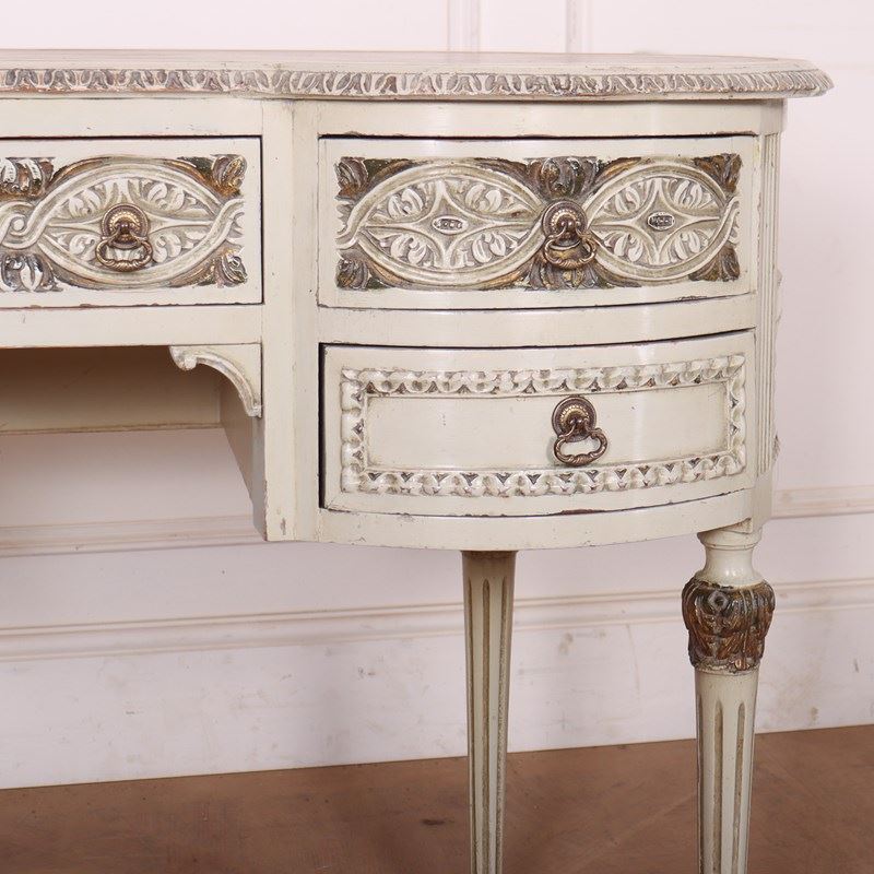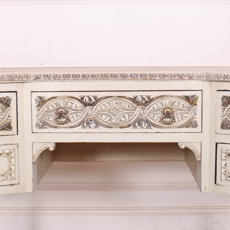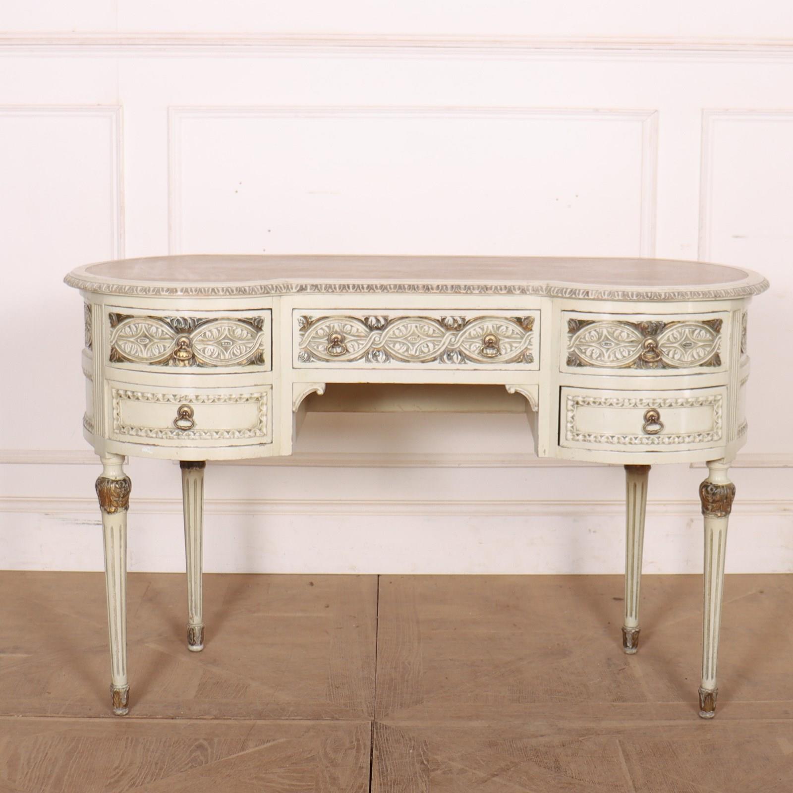 19th C English painted and carved pine kidney shaped desk with inset leather. 1880