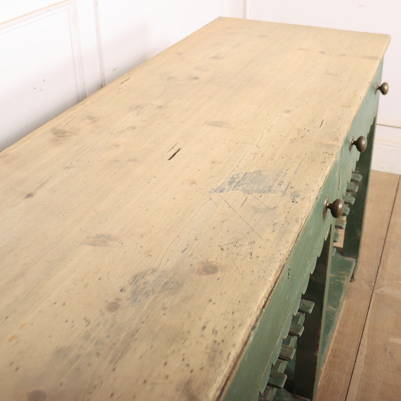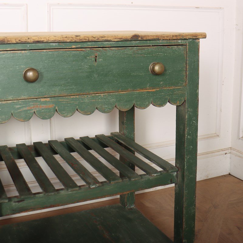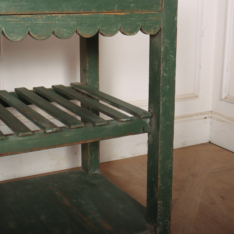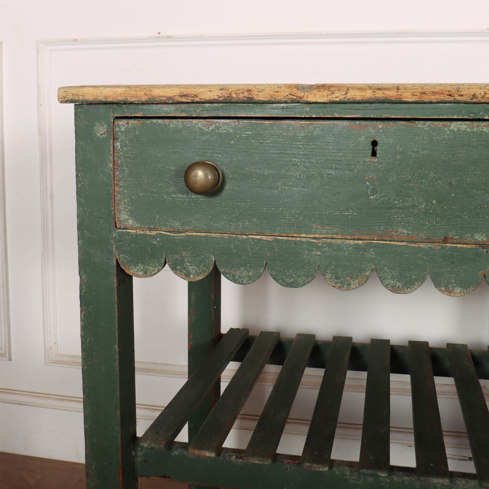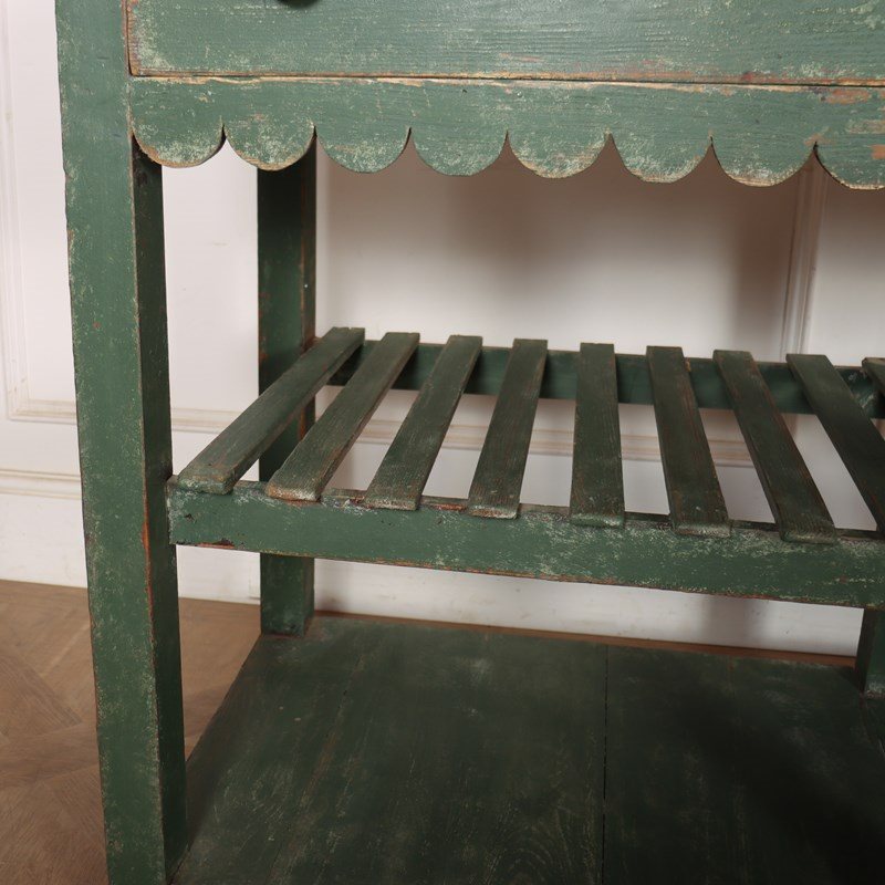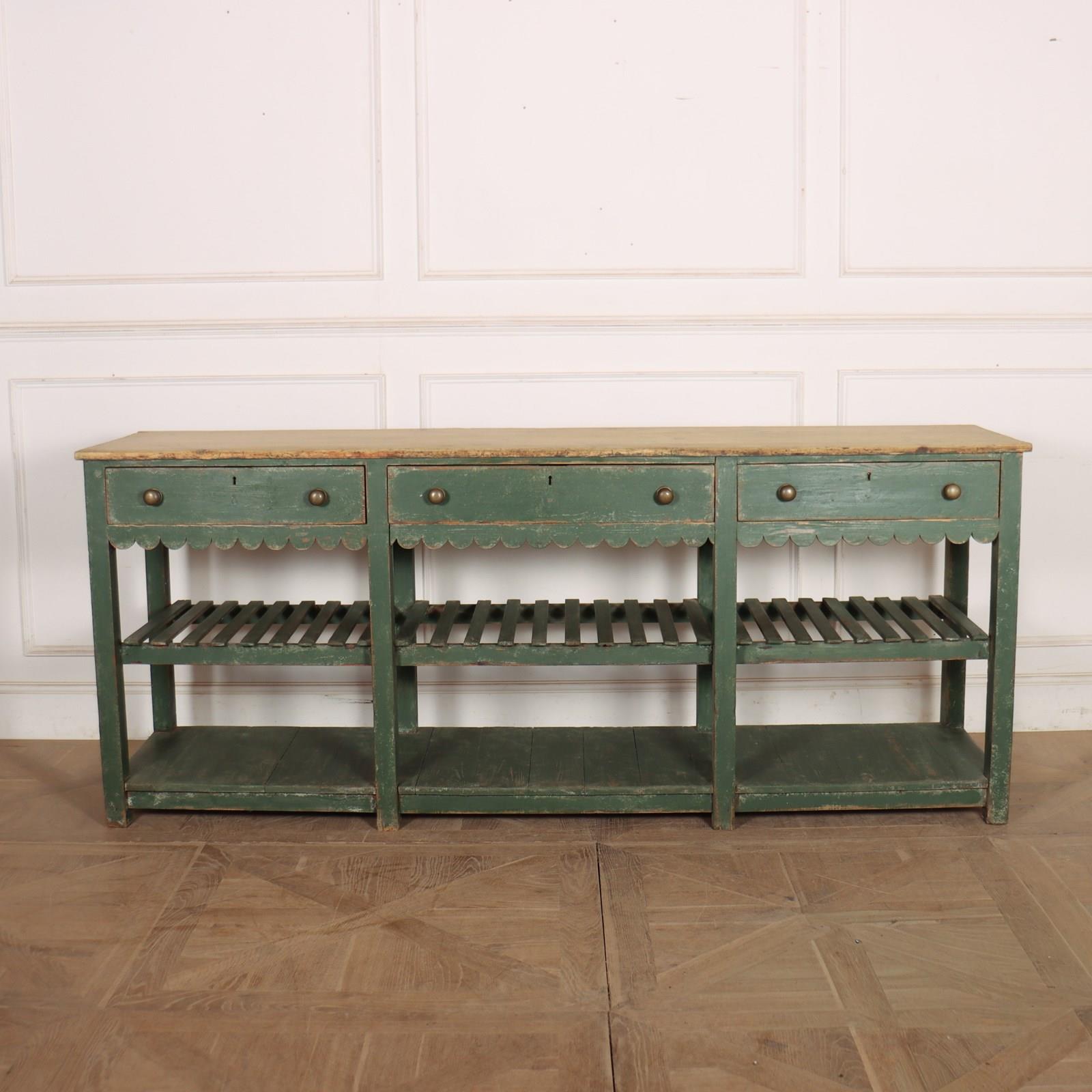 Wonderful 19th century English painted pine dresser base with a slatted shelf and potboard. 1820.