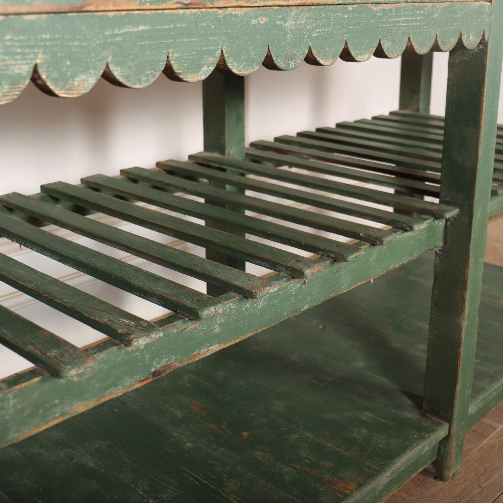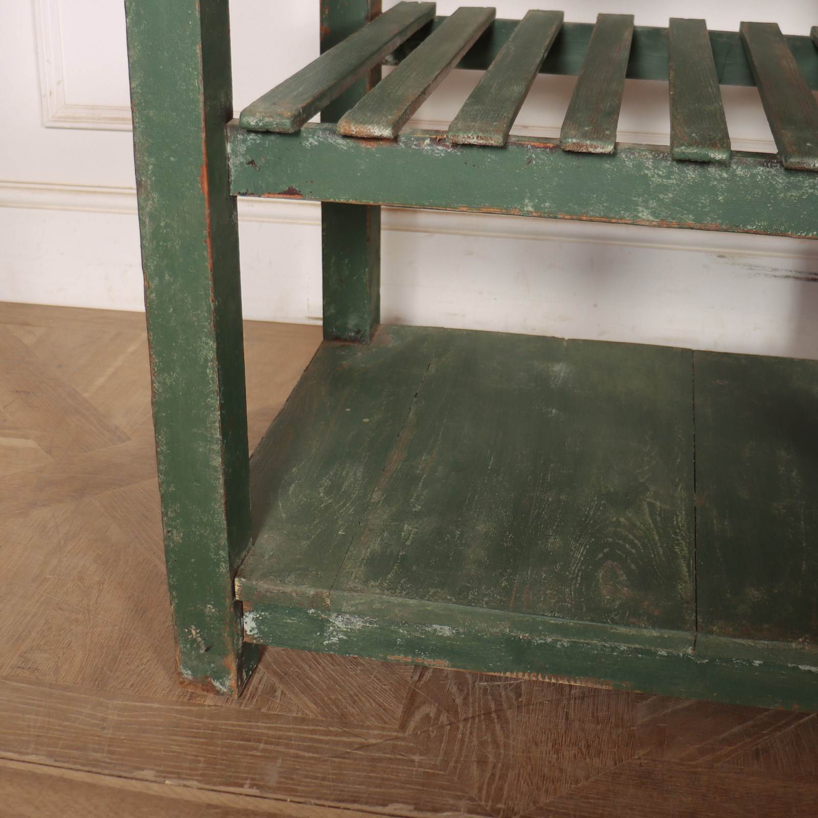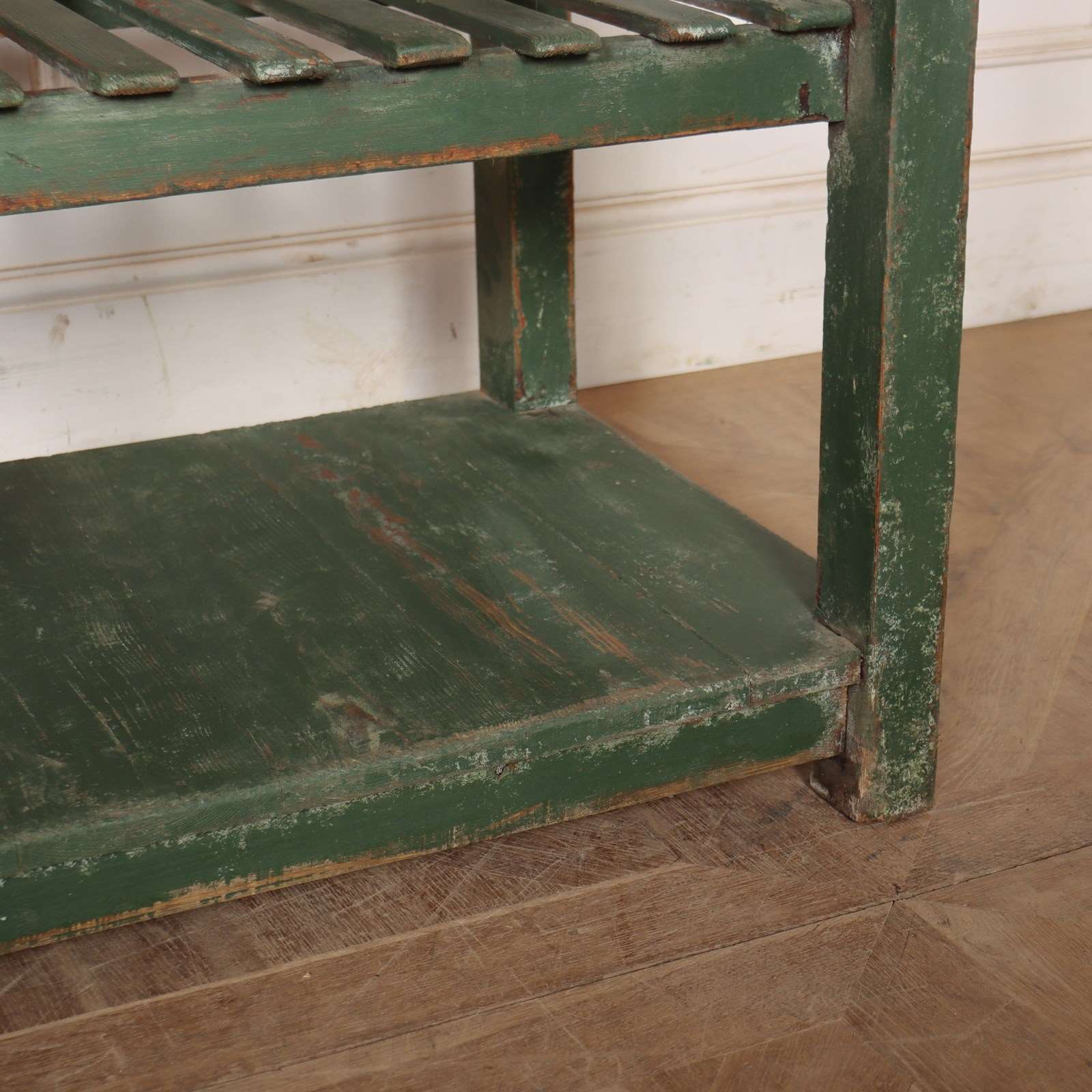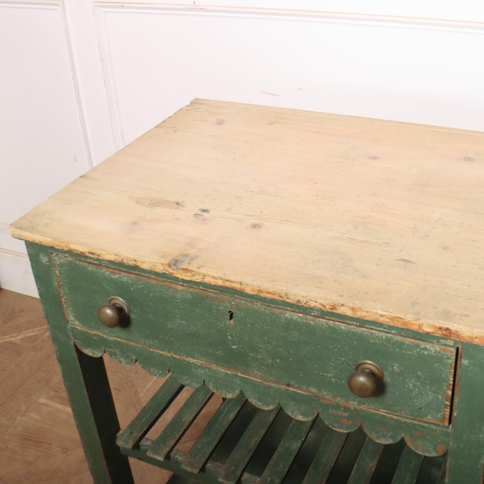 Wonderful 19th century English painted pine dresser base with a slatted shelf and potboard. 1820.