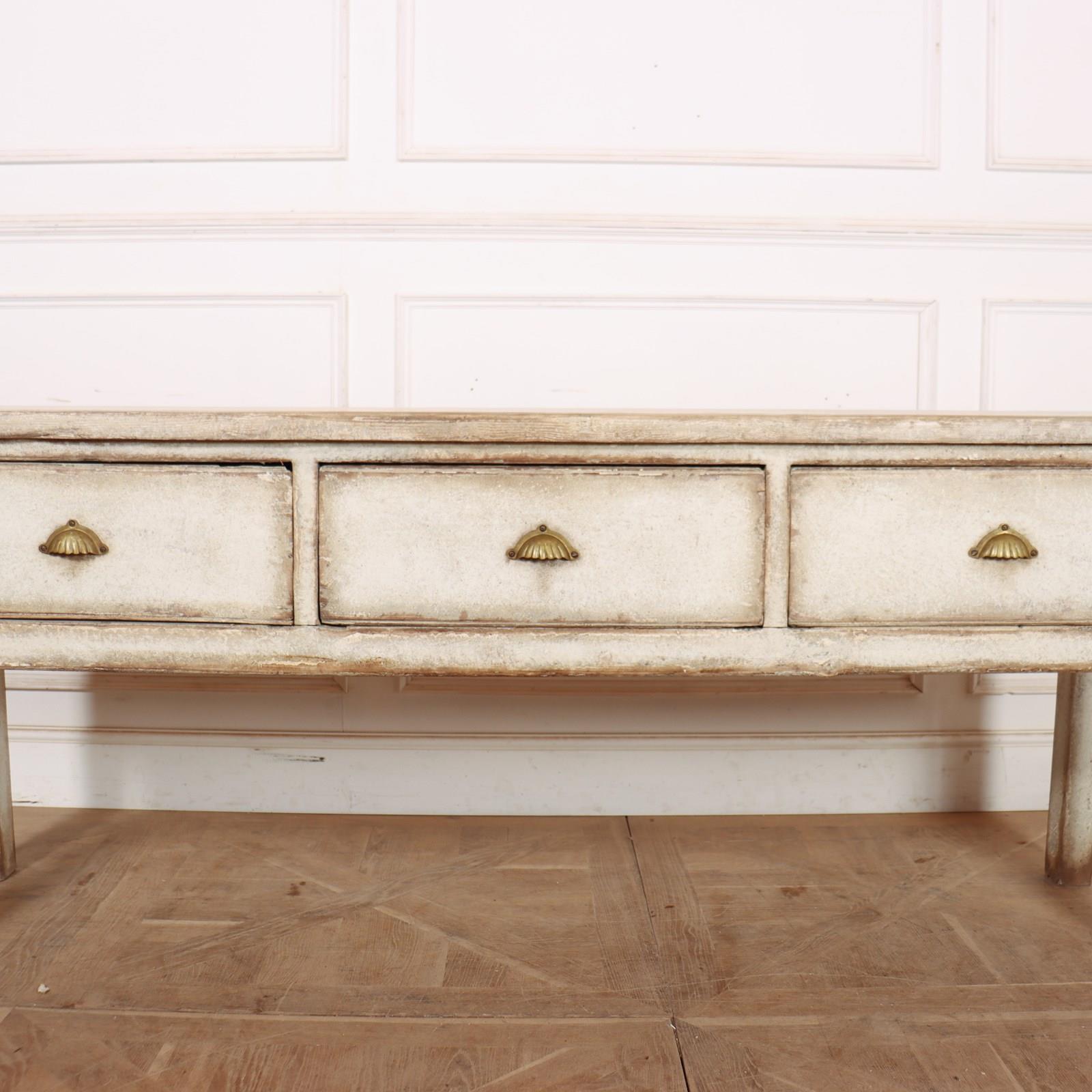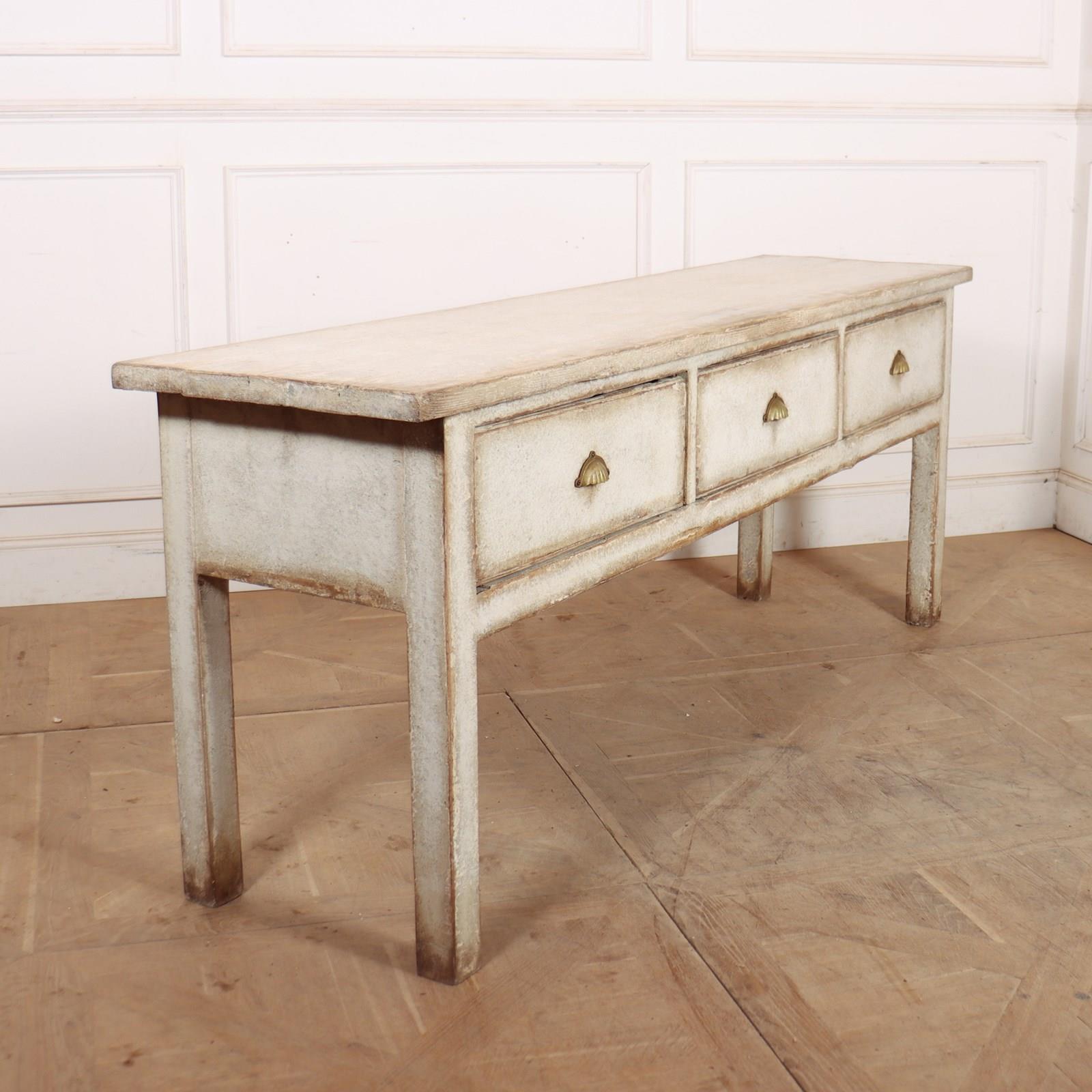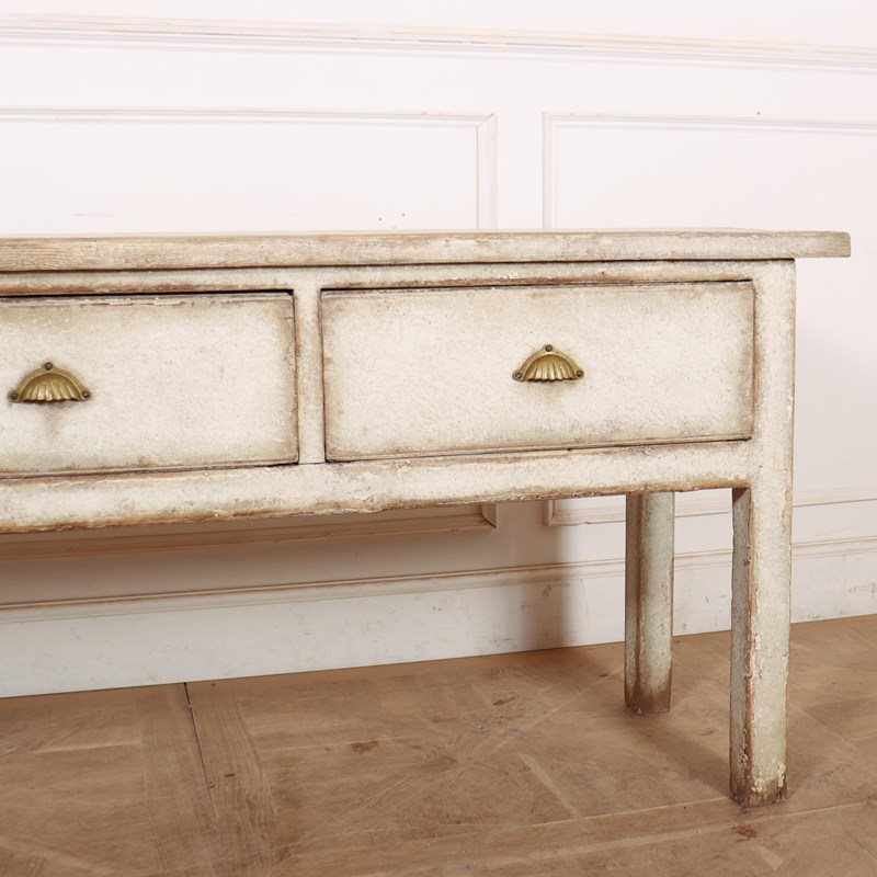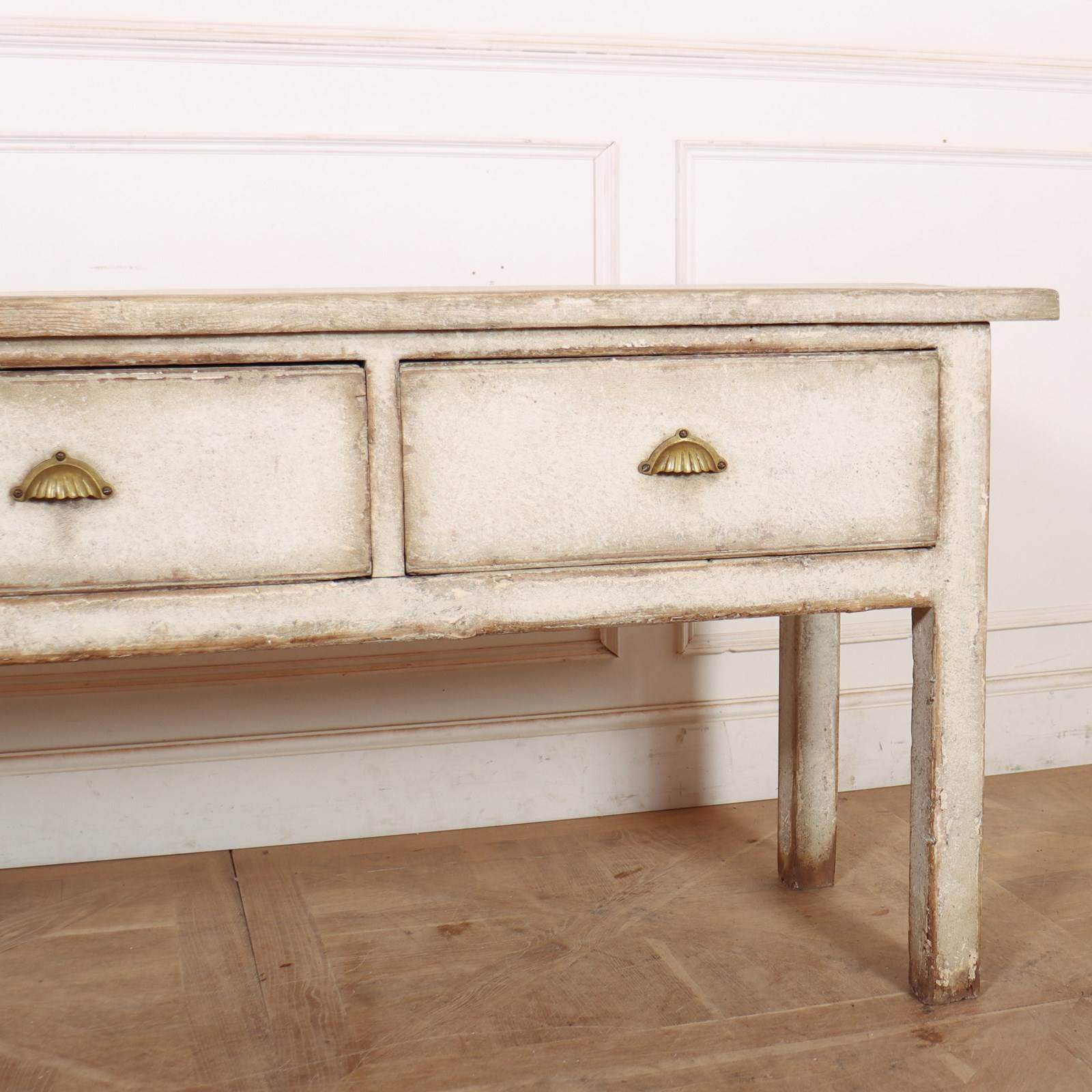 Early 19th C English painted three drawer dresser base with a thick worn top. 1840