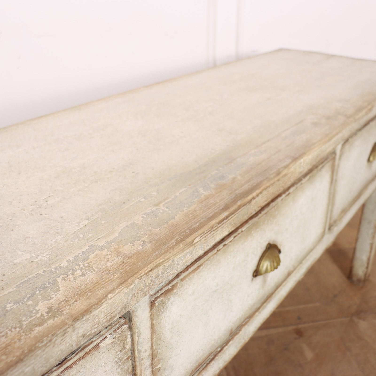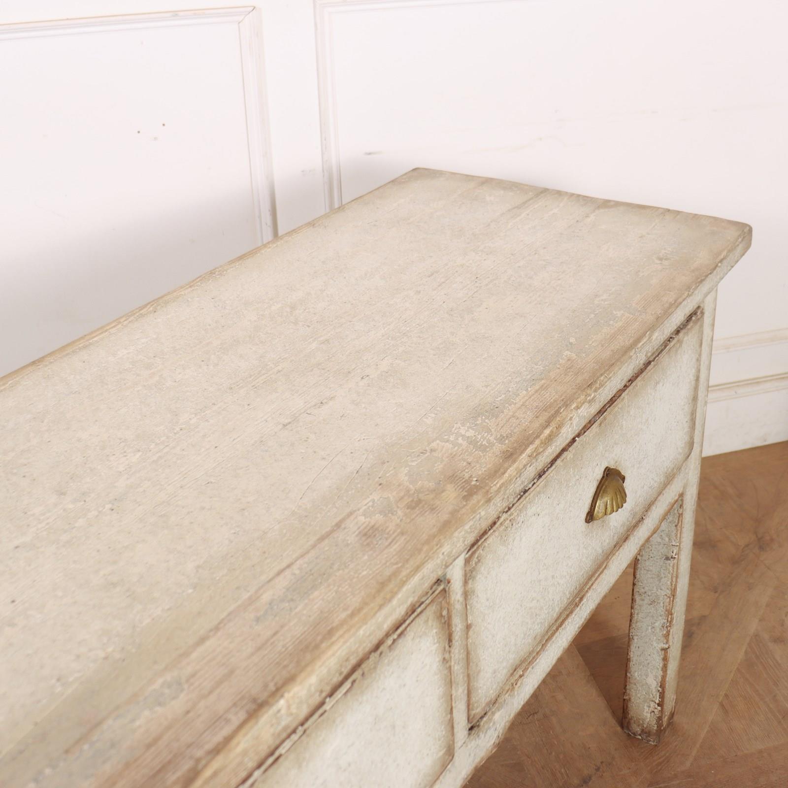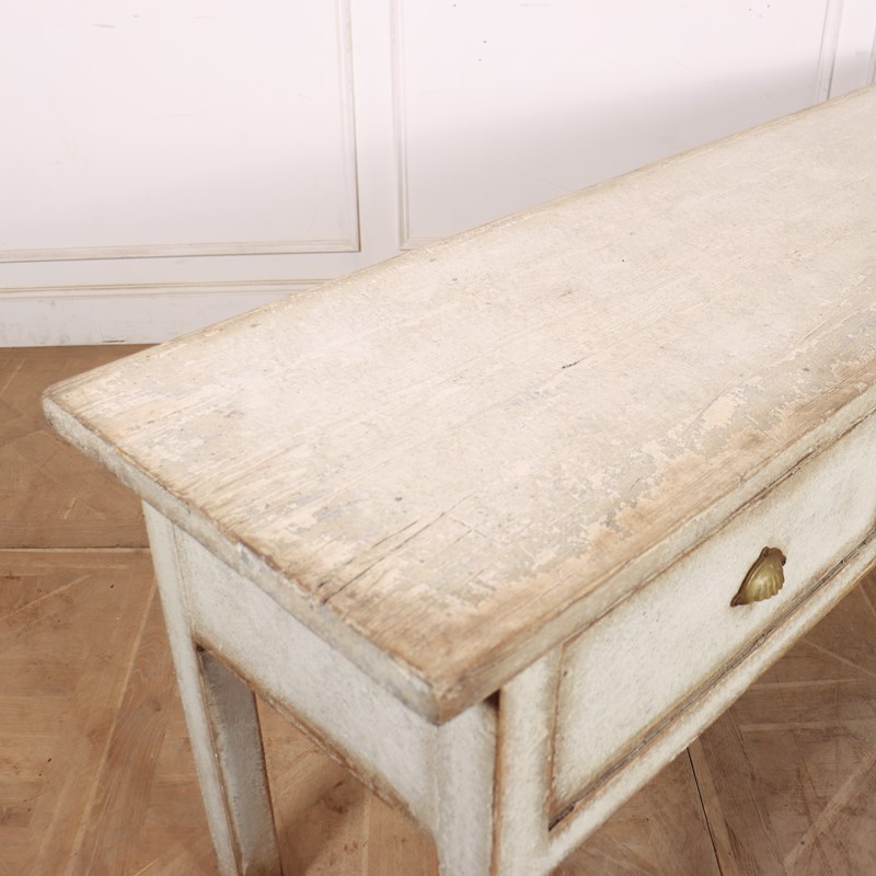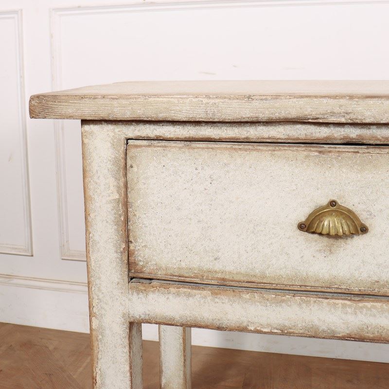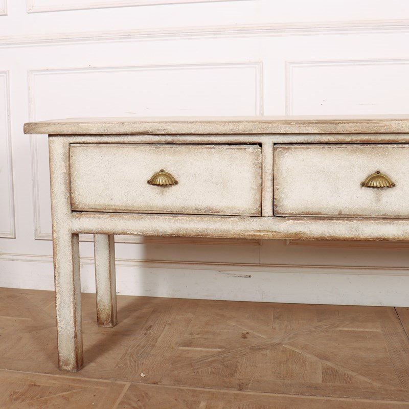 Early 19th C English painted three drawer dresser base with a thick worn top. 1840