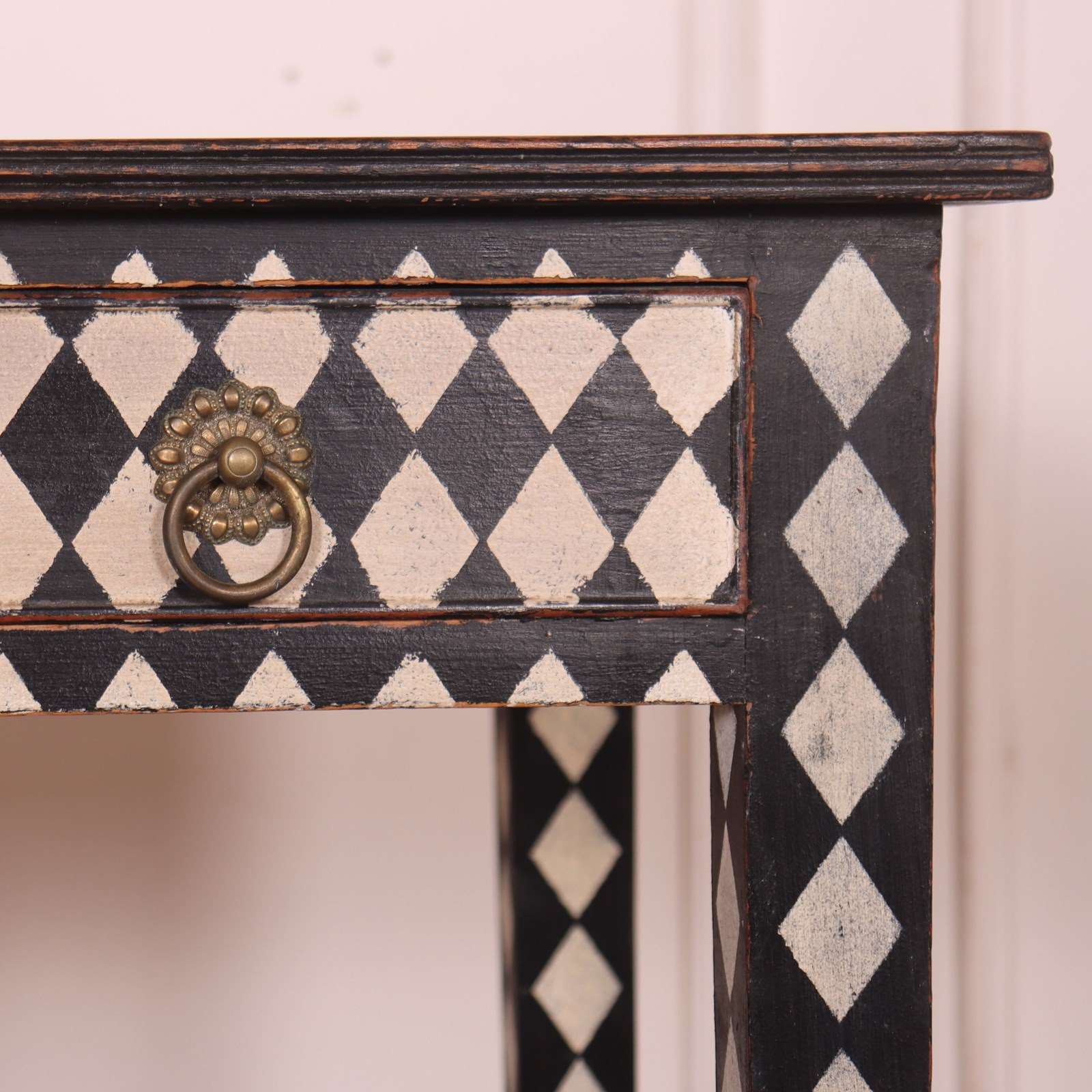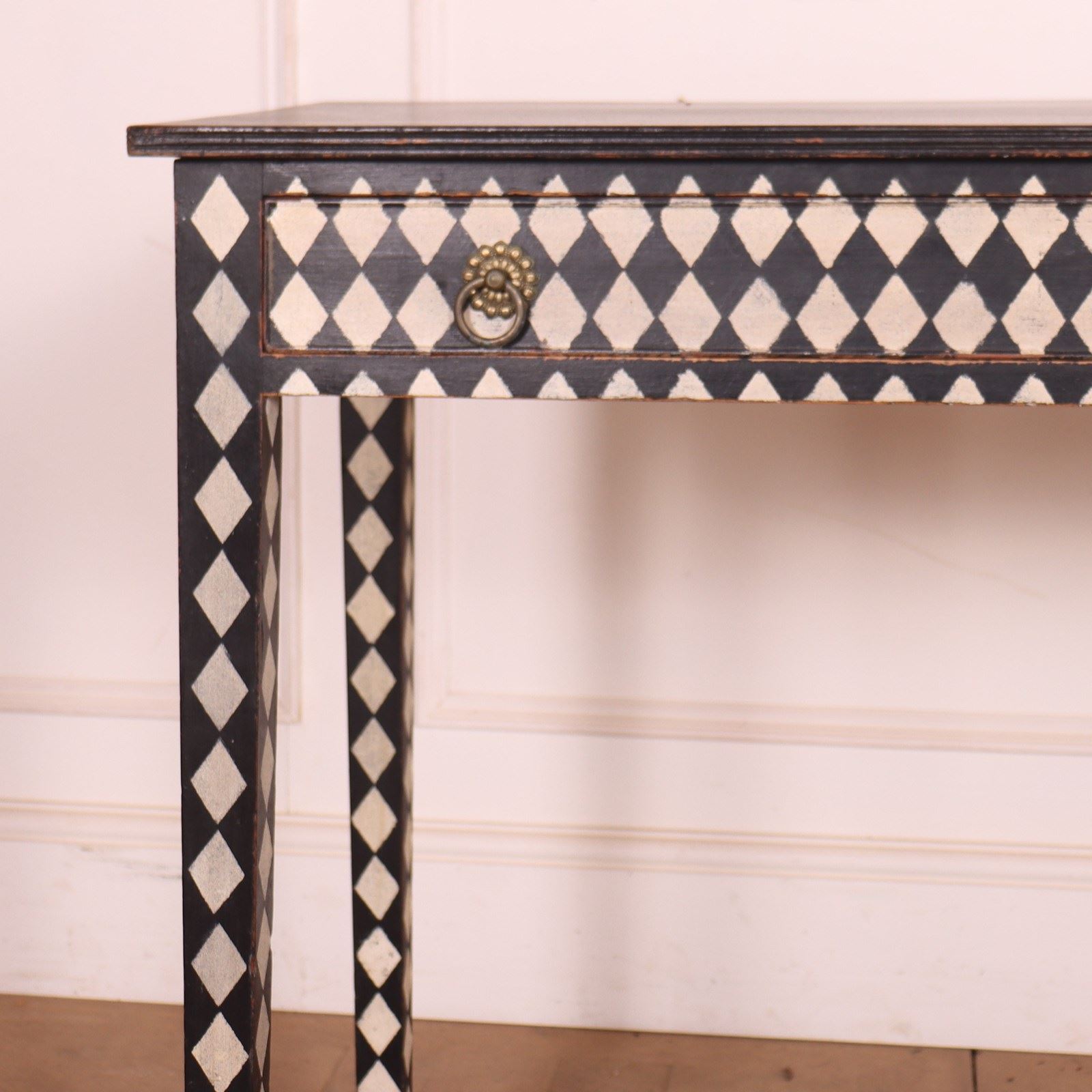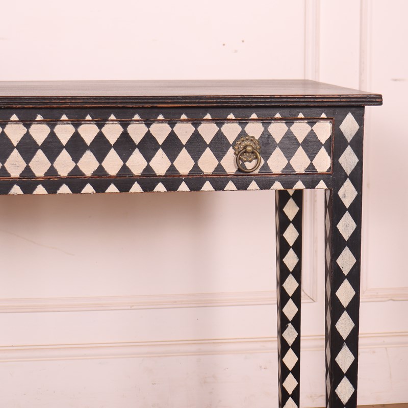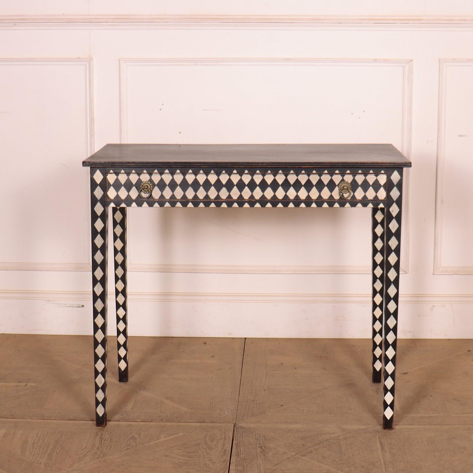 Late 19th C English painted one drawer harlequin decorated pine lamp table. 1890