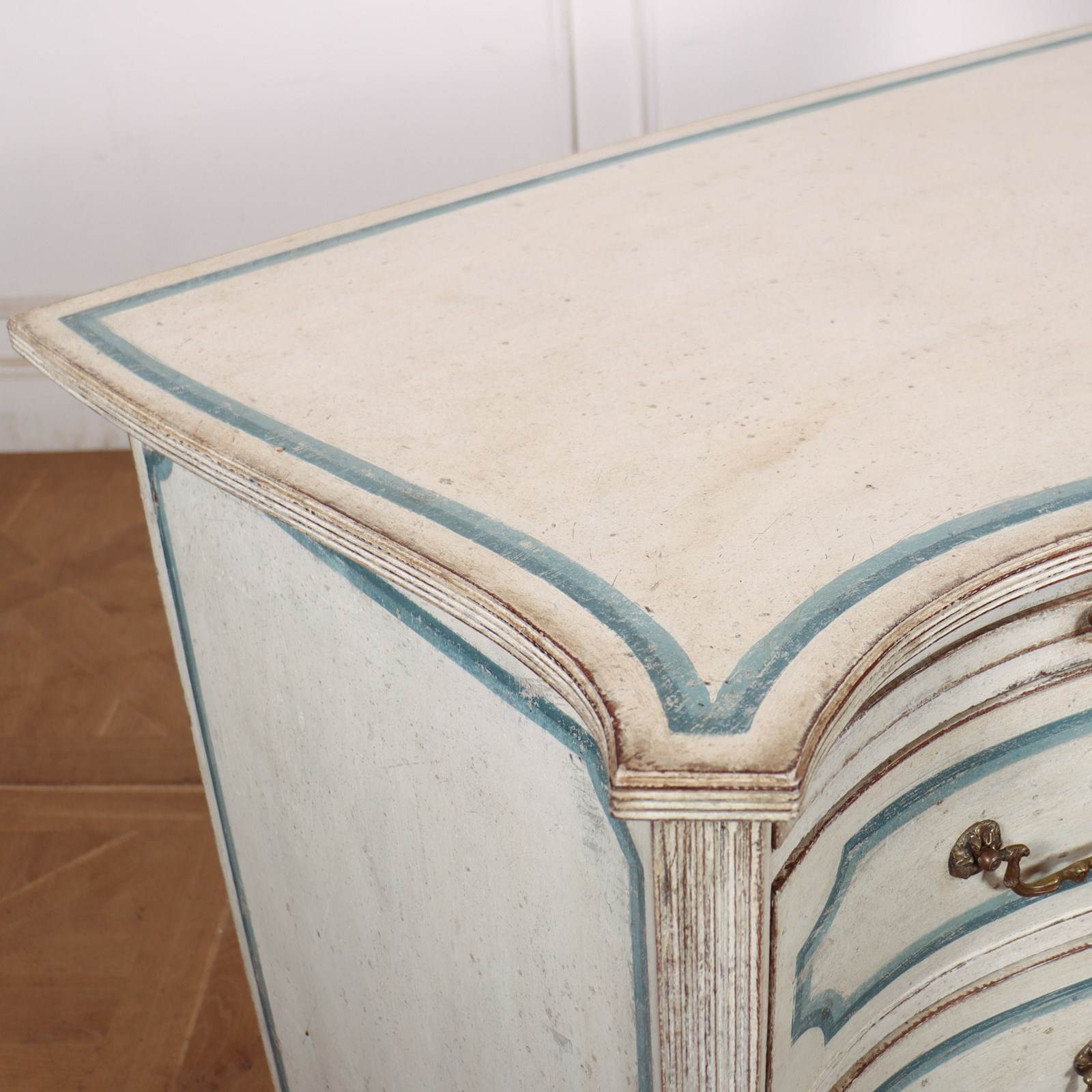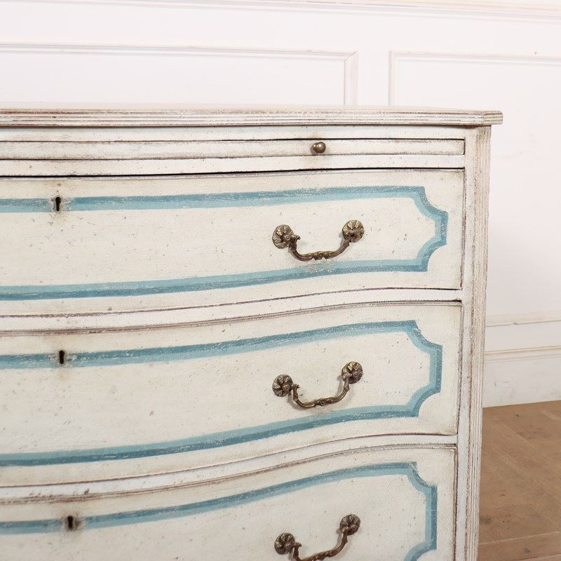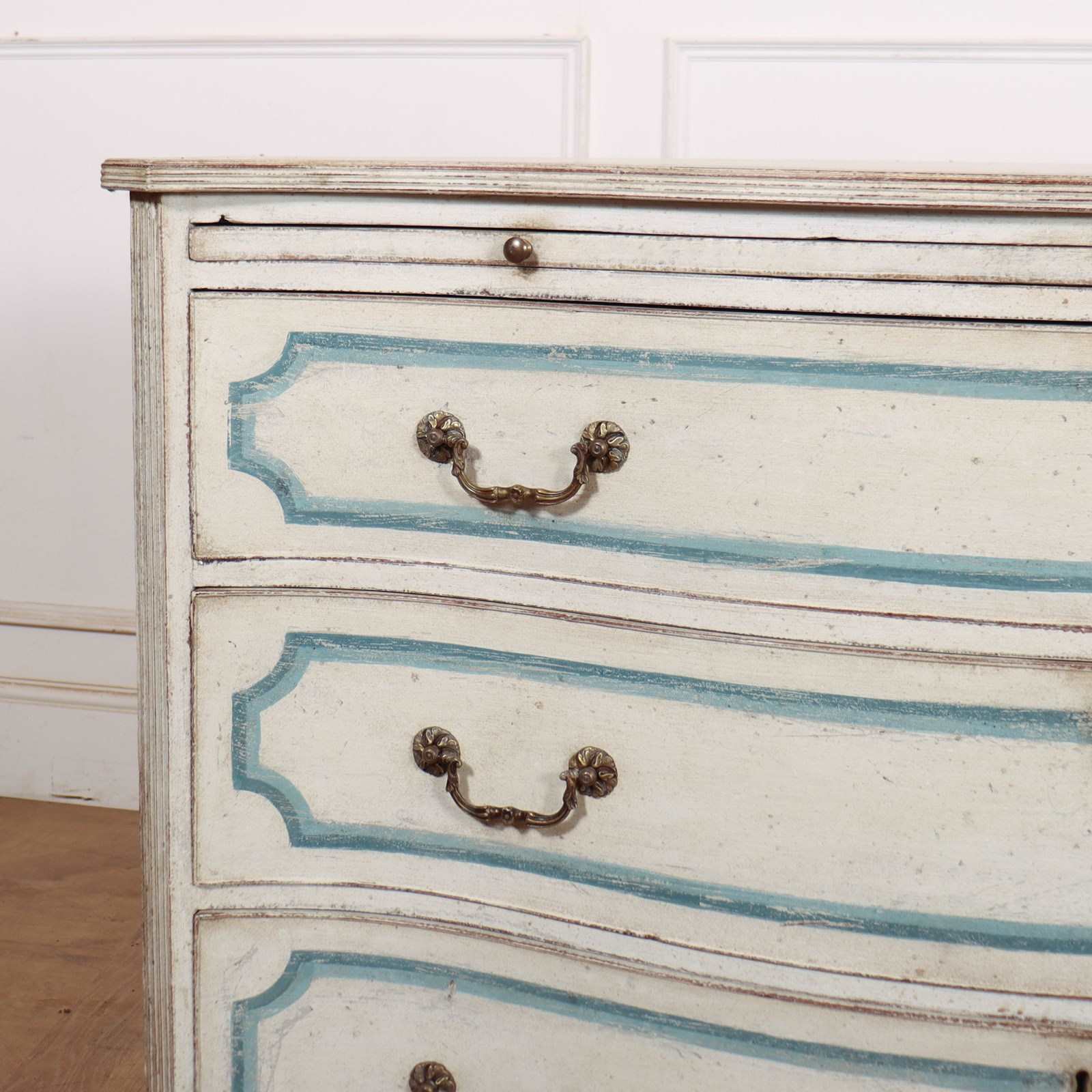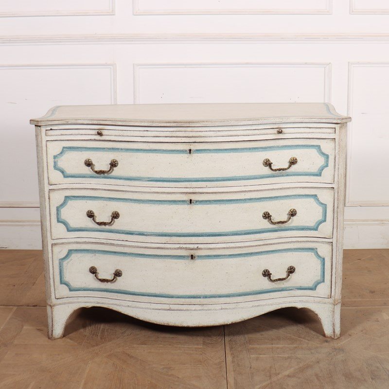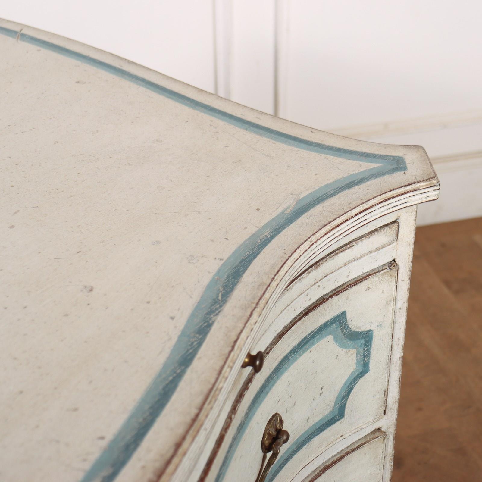 Pretty early 19th C English painted serpentine 3 drawer commode with a brushing slide and later decorative paint. 1820