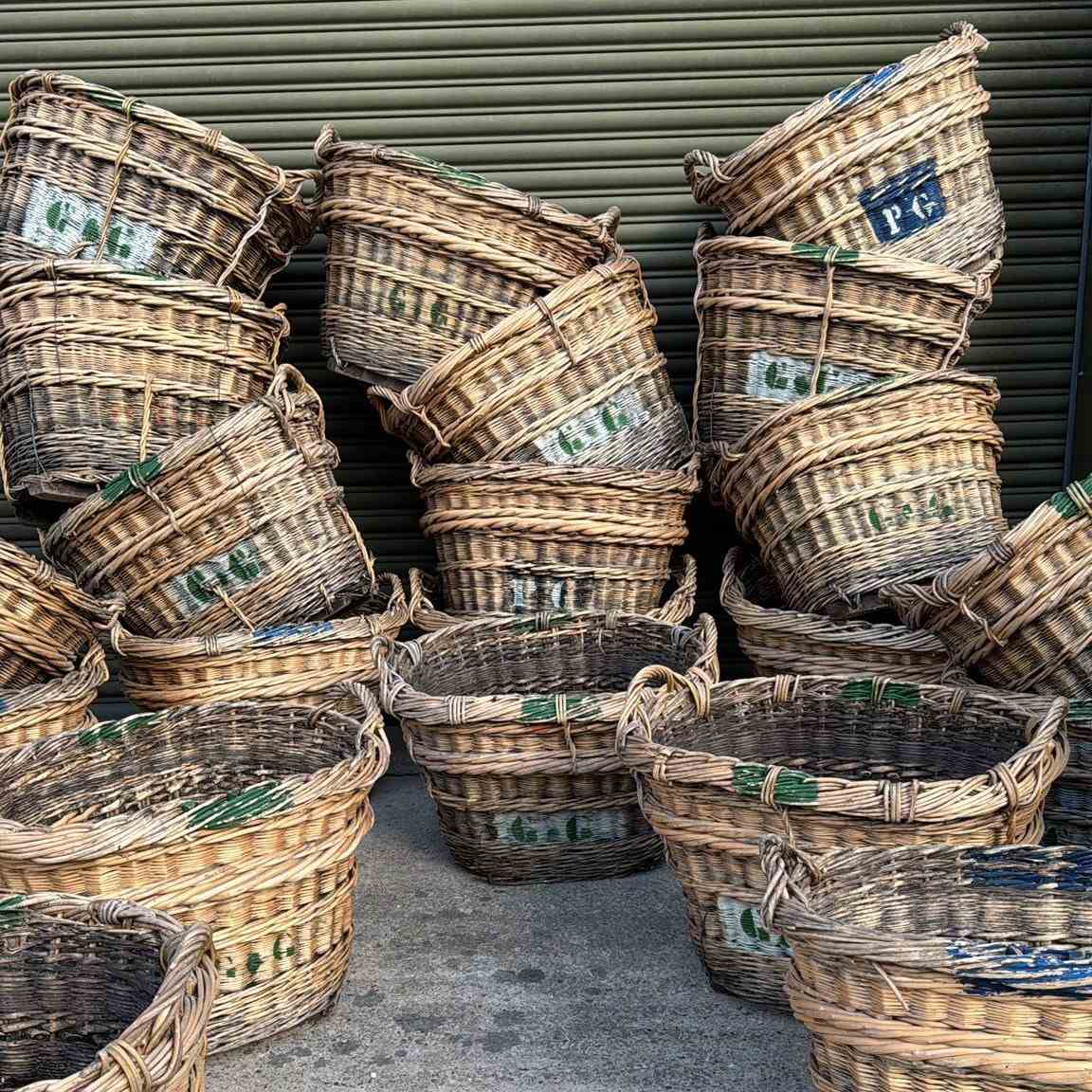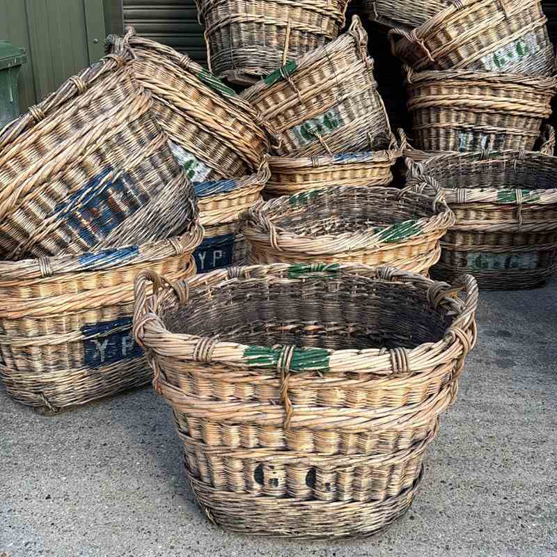 Early 20th Century French wicker champagne grape baskets. Would make wonderful log baskets due to their heavy quality. 1920.