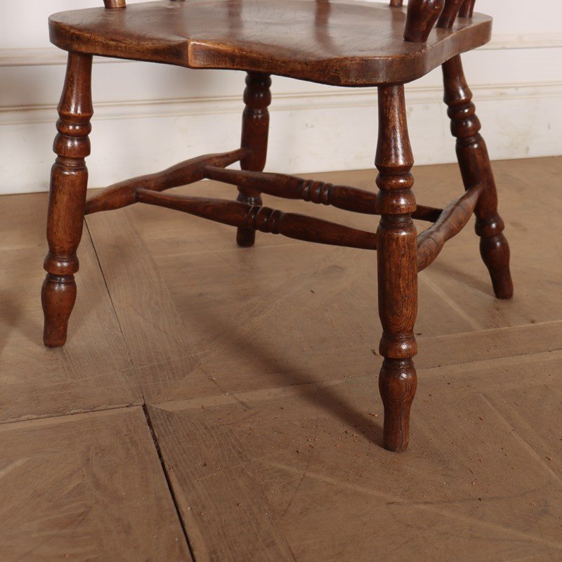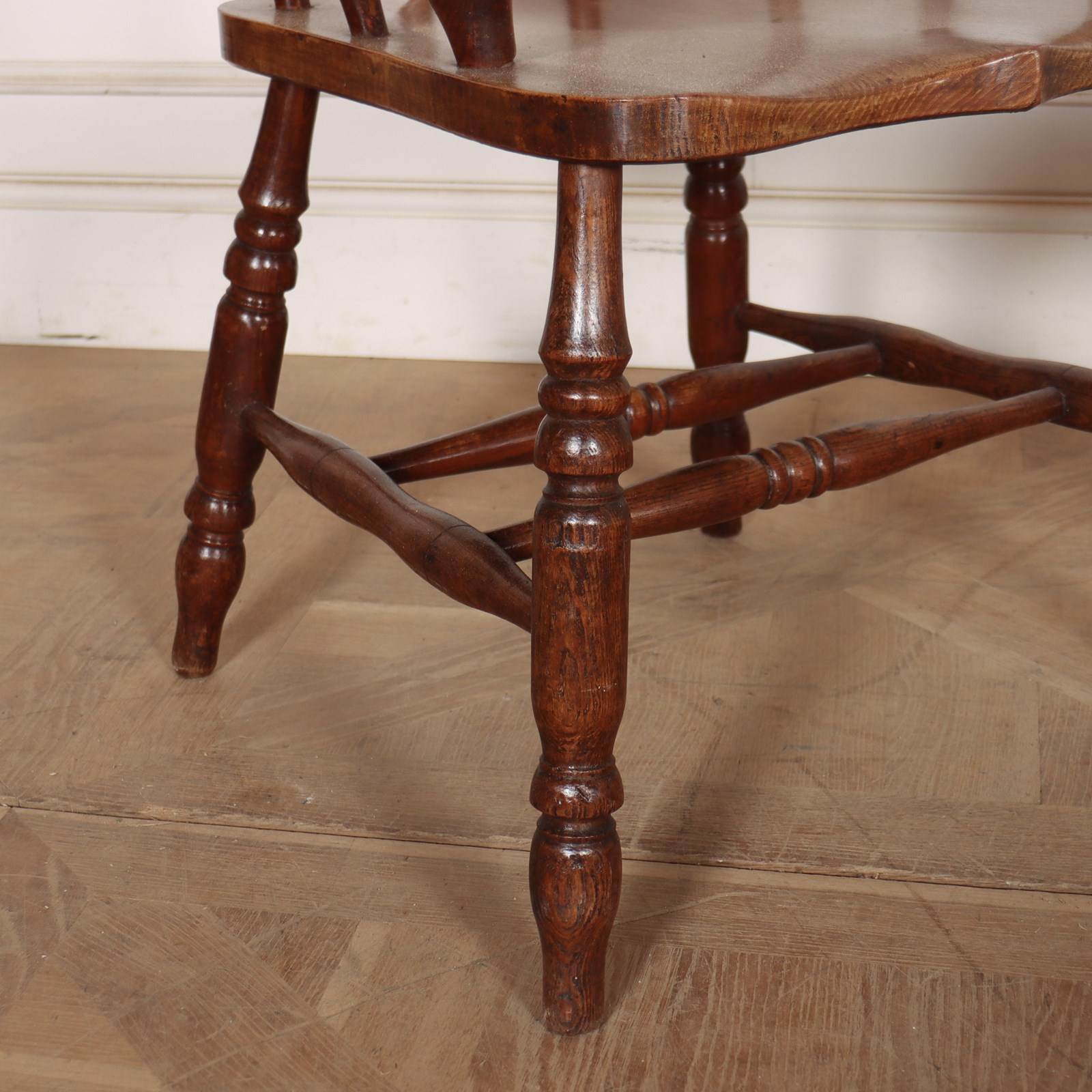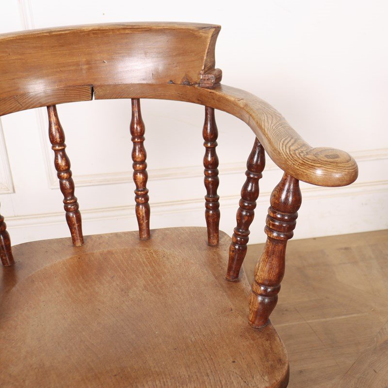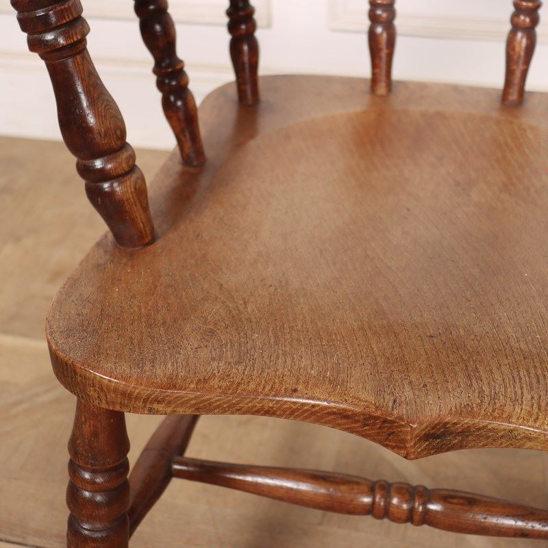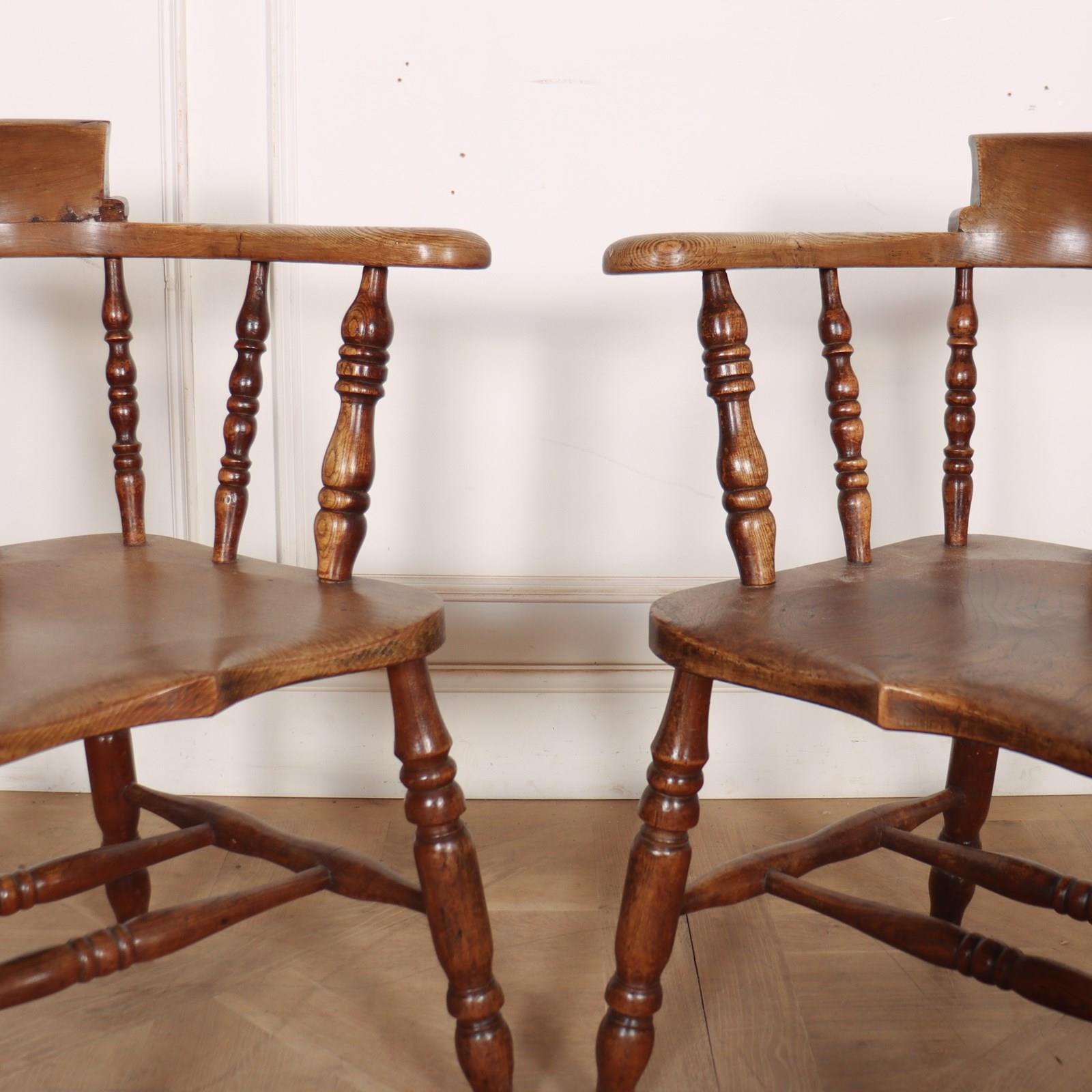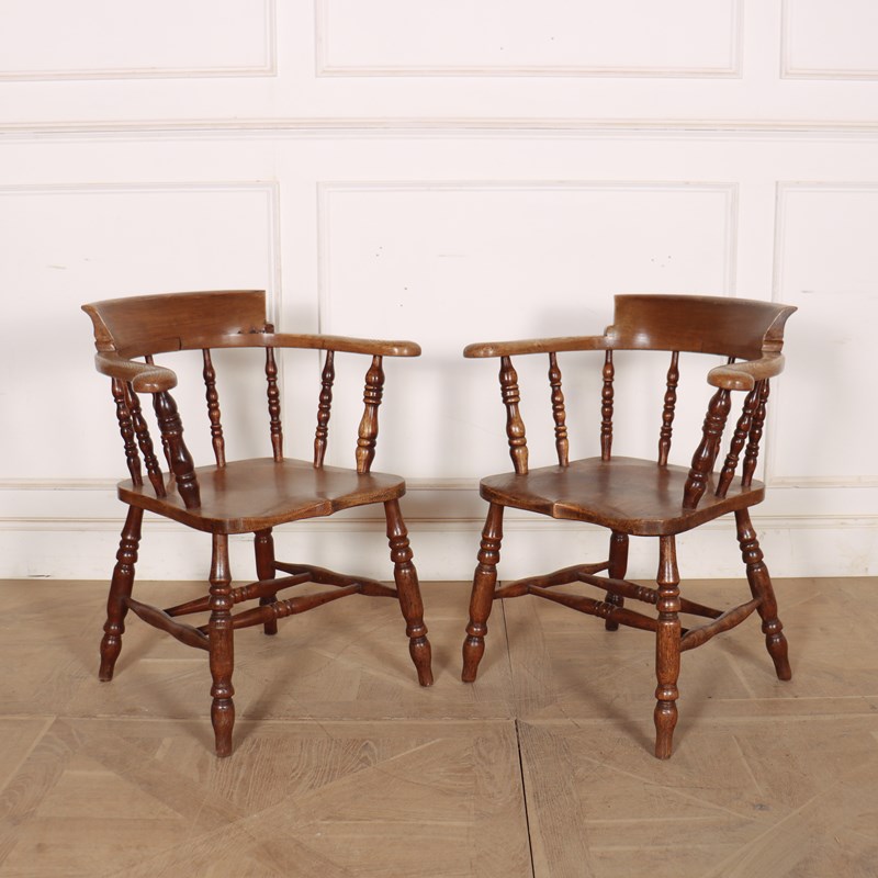 Interesting pair of 19th century English elm smokers bow arm chairs with a shaped seat front. 1880.