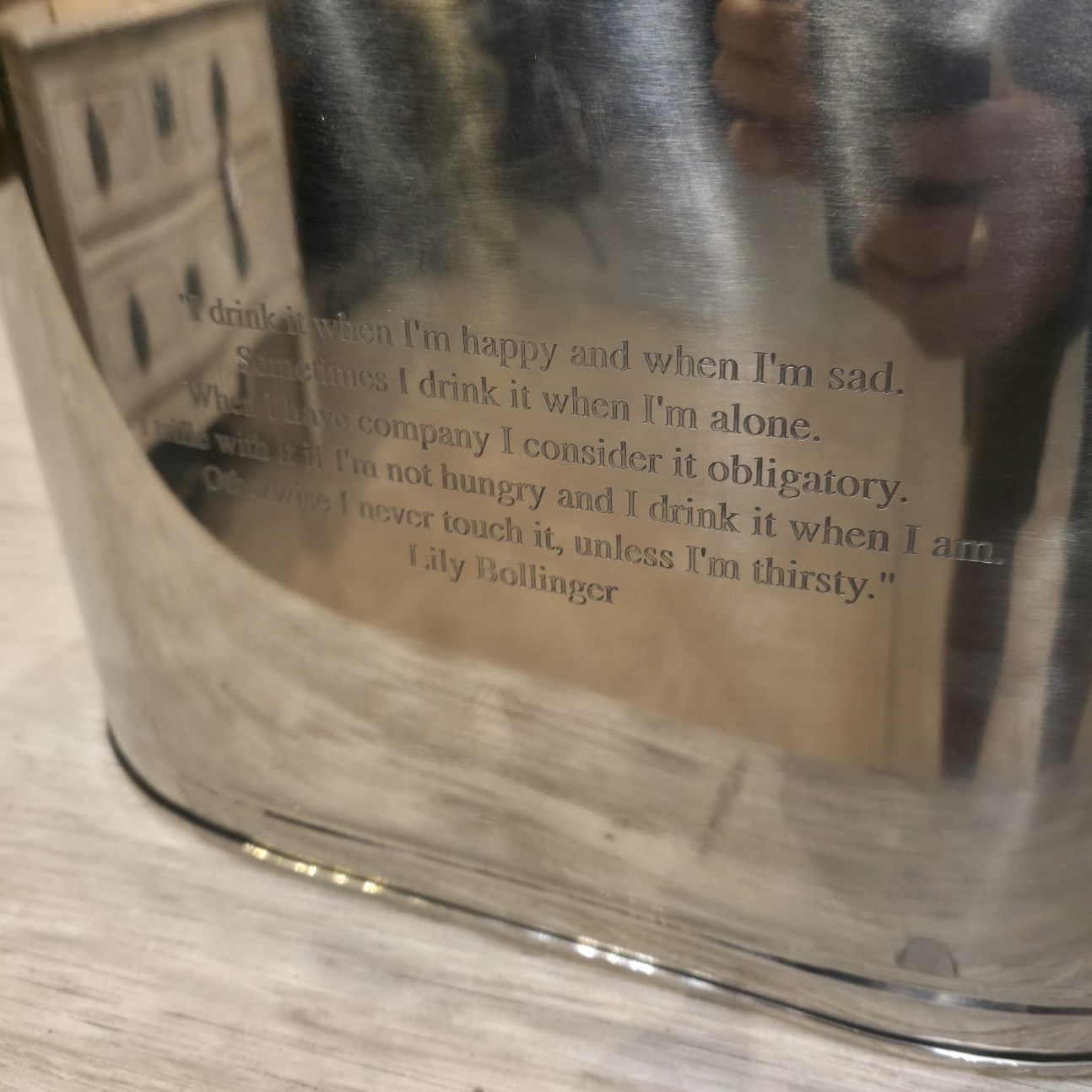 The other side is inscribed with a Lily Bollinger quote: 'I drink it when I'm happy and when I'm sad. Sometimes I drink it when I'm alone. When I have company I consider it obligatory. I trifle with it if I'm not hungry and I drink it when I am. Otherwise I never touch it unless I'm thirsty.