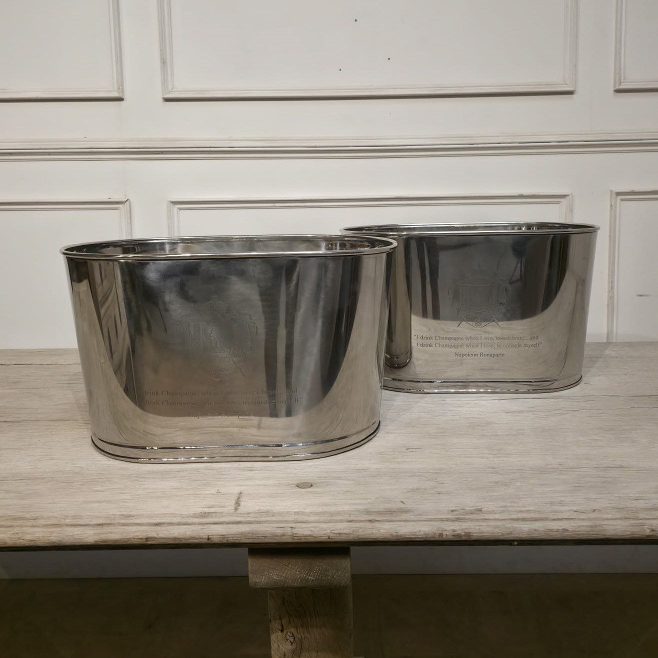 Pair of Napoleon Bonaparte stainless steel champagne buckets with 'Lily Bollinger' quotations.