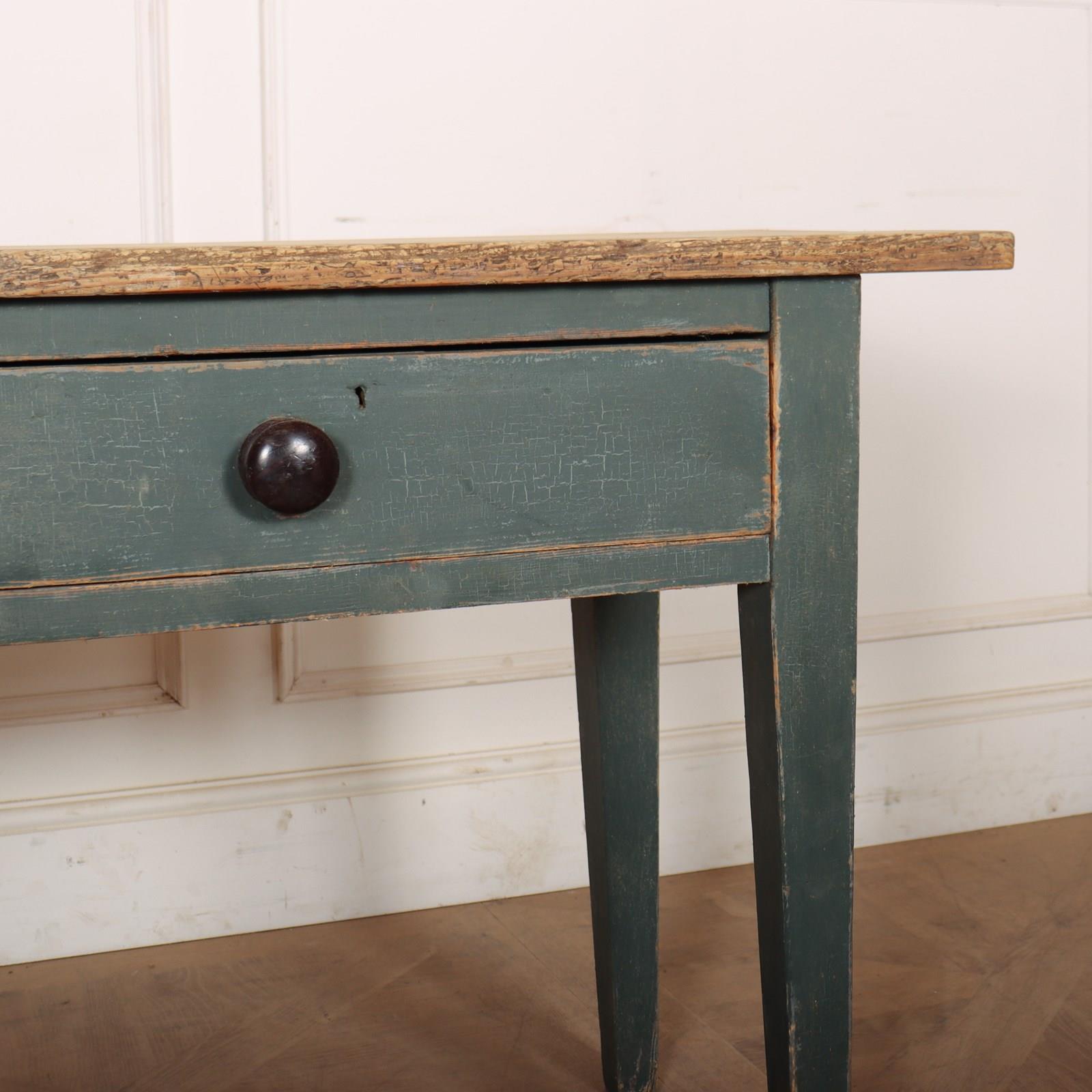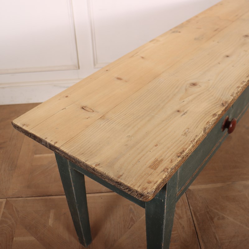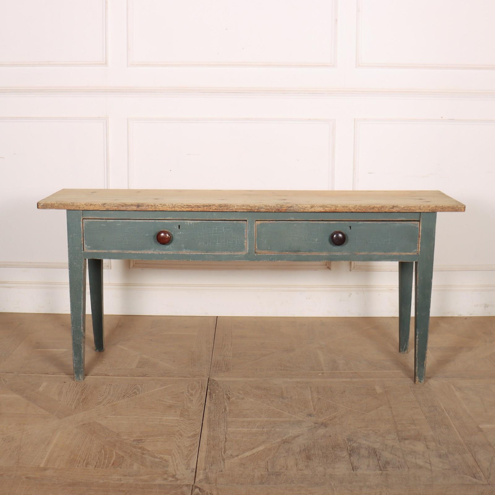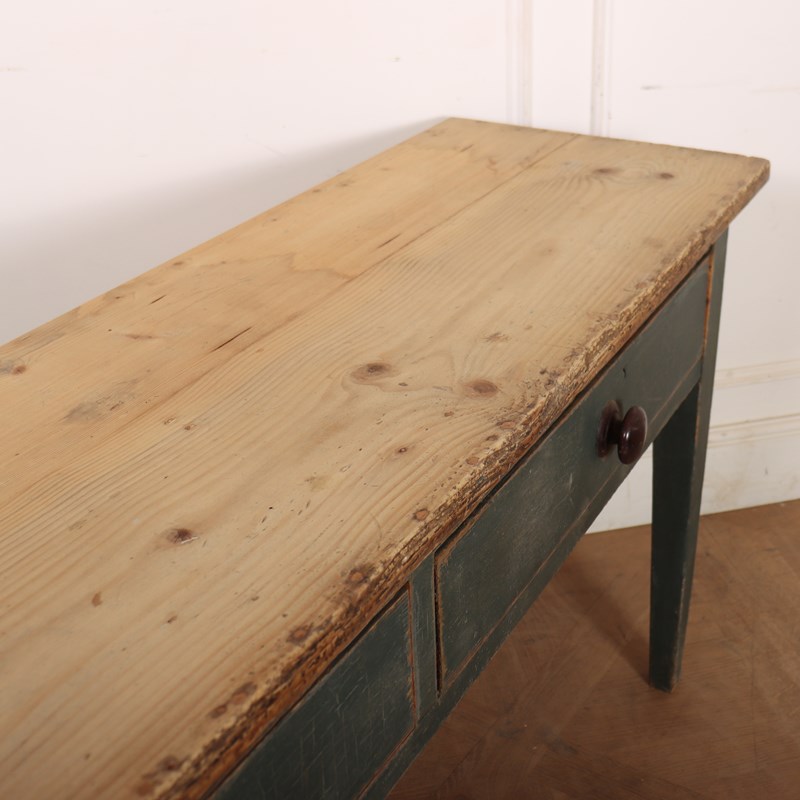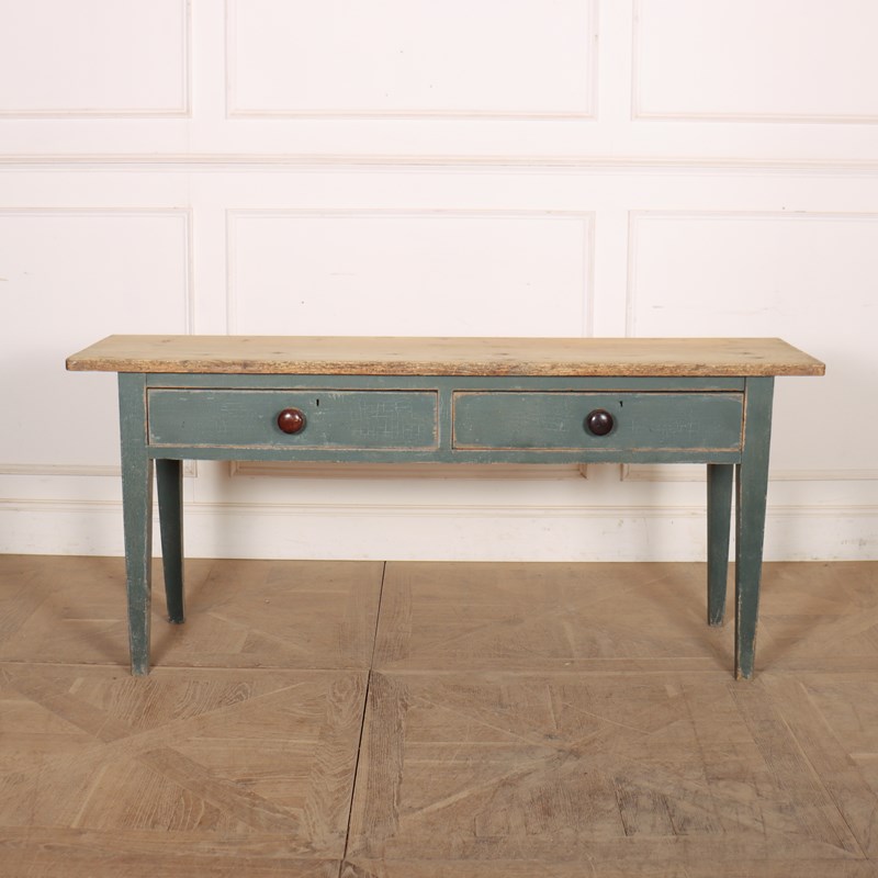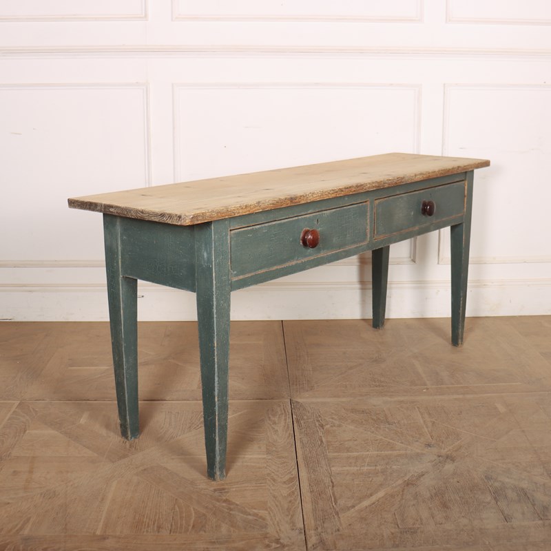 Early 19th century Scottish two drawer painted console table with a scrubbed pine top. 1860.