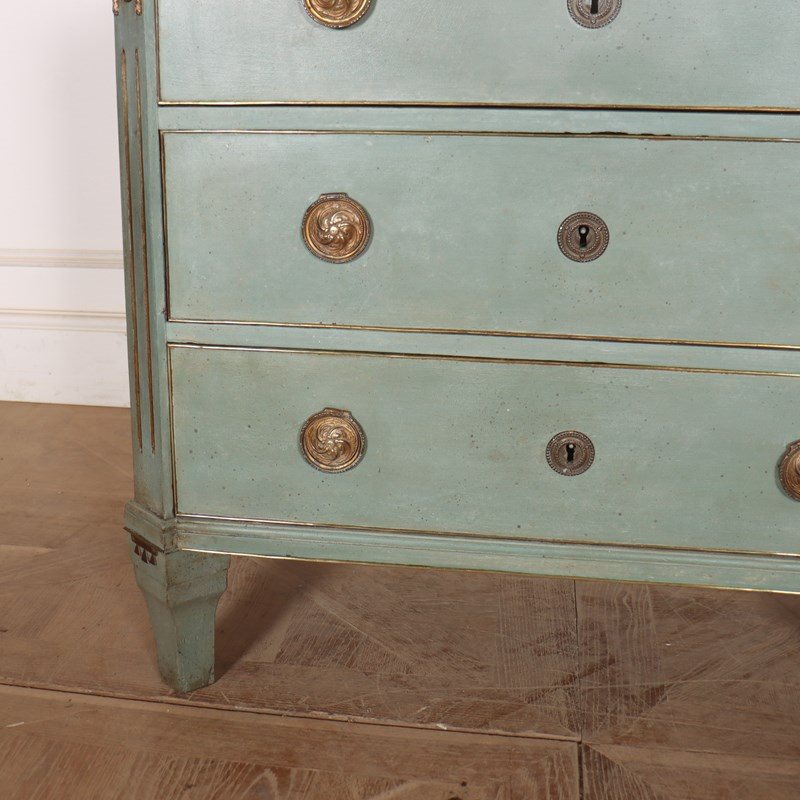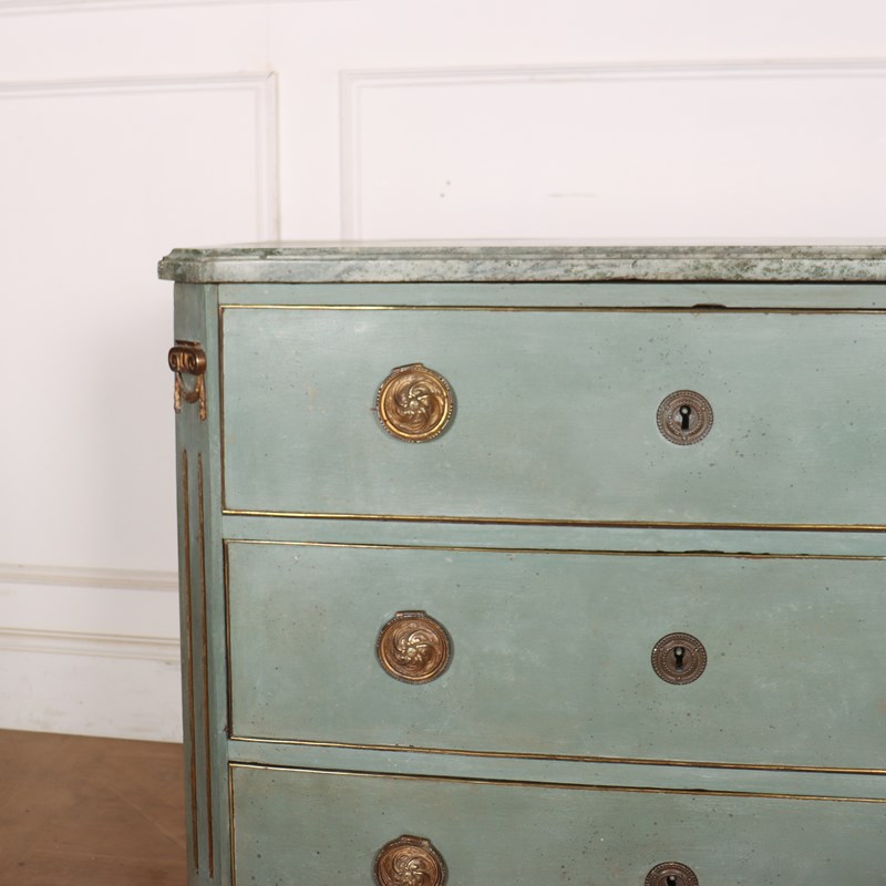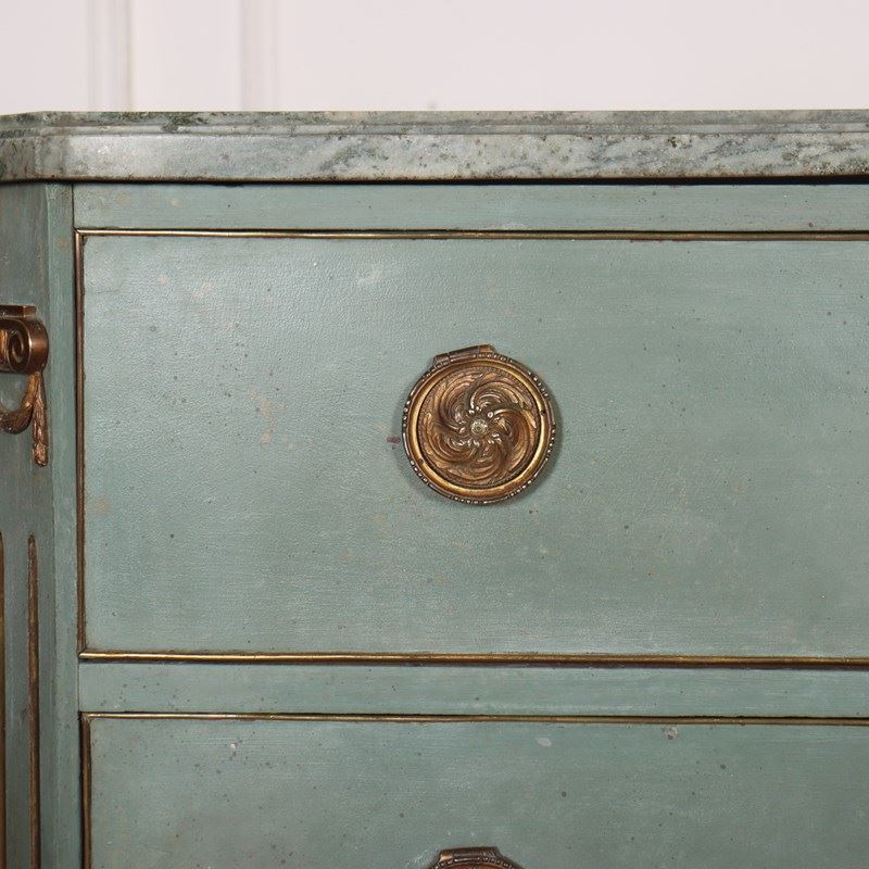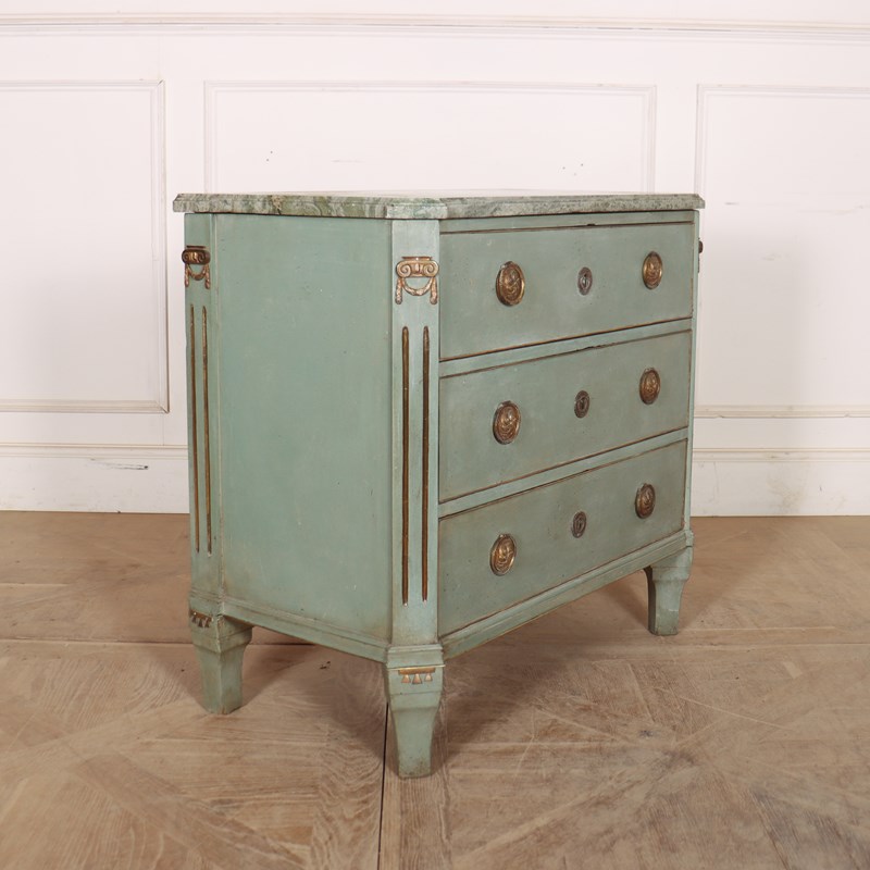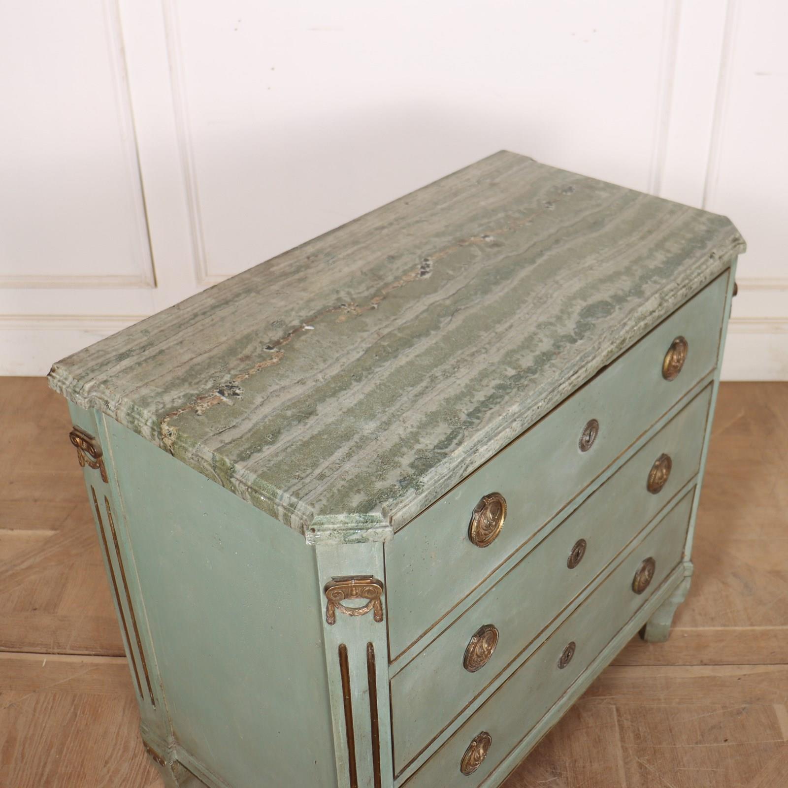 Small early 19th century Swedish three drawer pine commode with an interesting marble top. 1830.