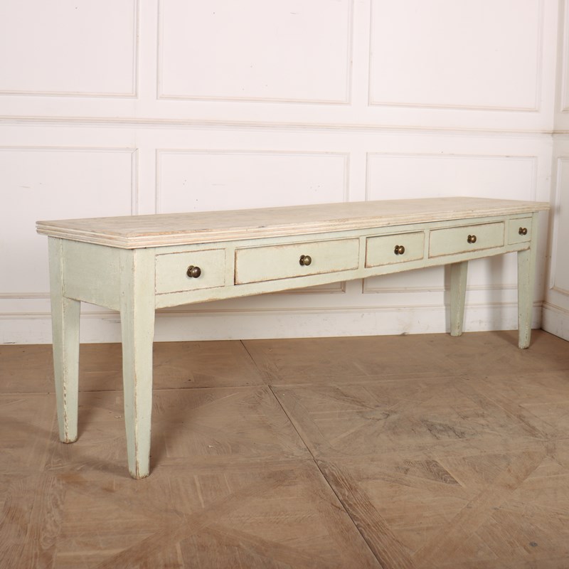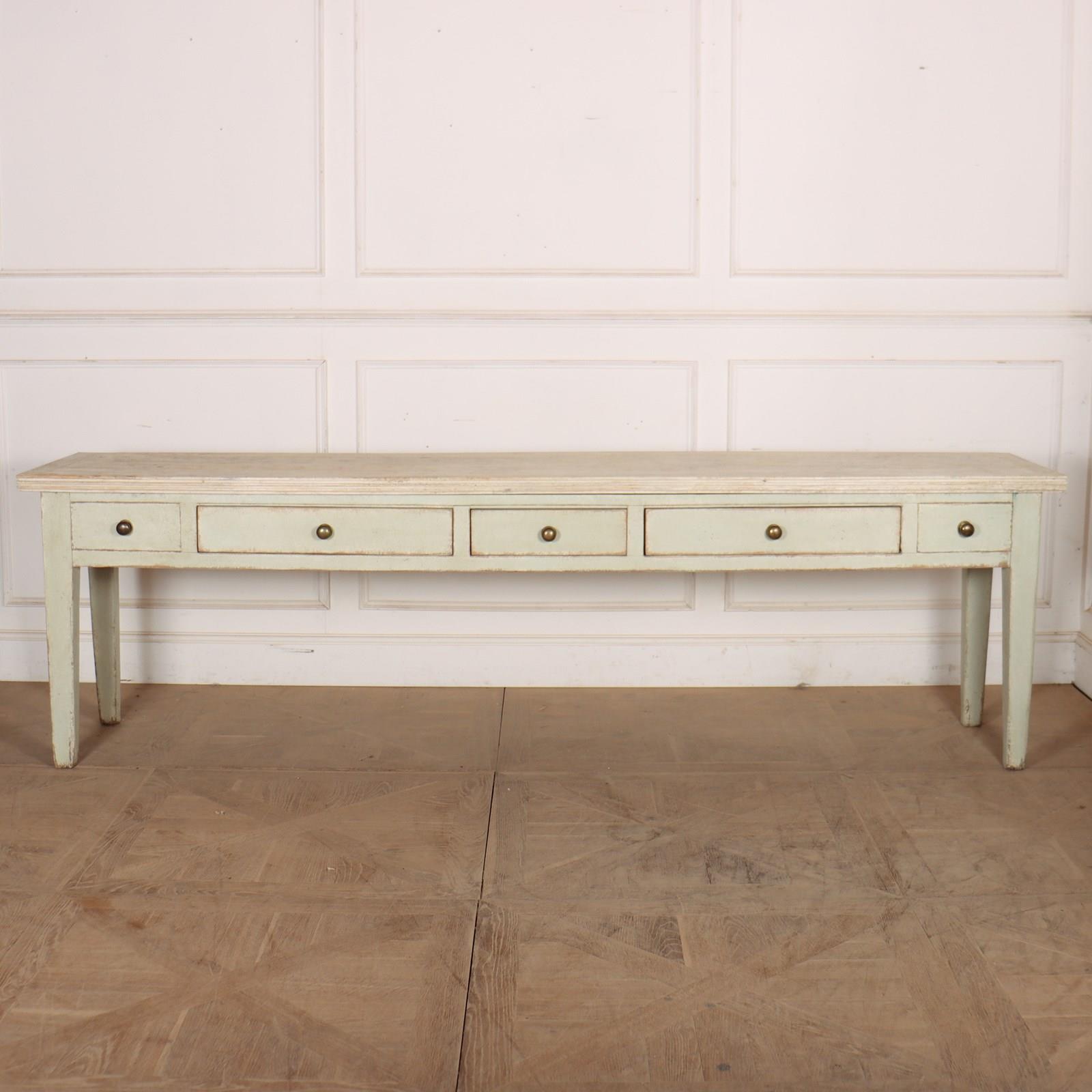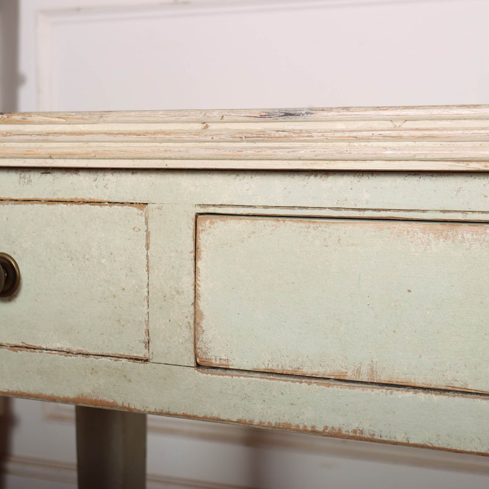 Good 19th century West Country painted three drawer serving table with two faux outer drawers and a good thick washed top. 1840.