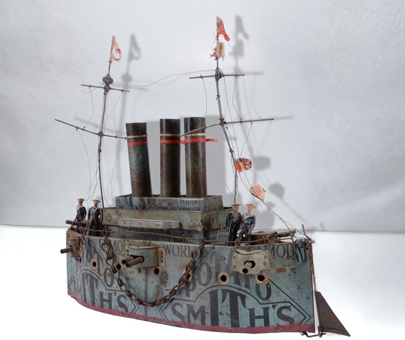 Completely one of a kind this must have been a real labour of love, and what talent to make it, an early 20th Century hand made Dreadnought battleship made from a Shop Display, circa 1920's, Smiths Crisps tin topped with Britains Ltd Hollowcast Lead sailors.