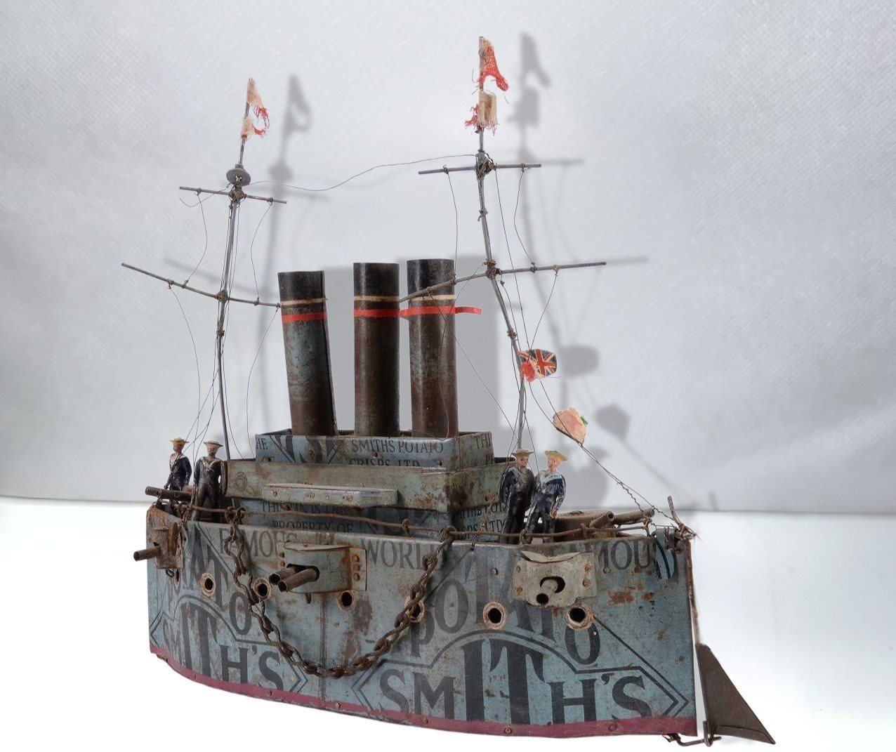 The work that has gone into this must have made K.Coulbeck of Grimsby (name stamped on the bottom) very proud, and what a great idea to make it out of the crisps tin, maybe it reminded him of the ships he could have seen with all of those wild designs, the Dazzle camouflage used by the Royal Navy in the first world war which used crazy designs painted on the ships to confuse the enemy, like the RMs Mauretania and The Dreadnought itself covered in green, blue and grey diamond shapes and triangles, the colour of this boat is very similar.