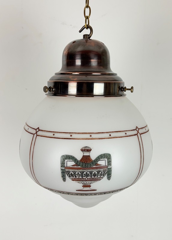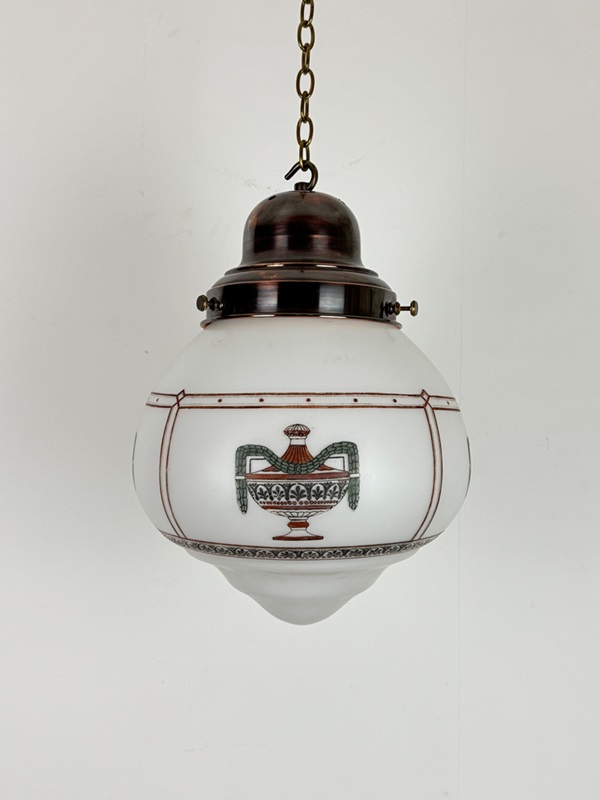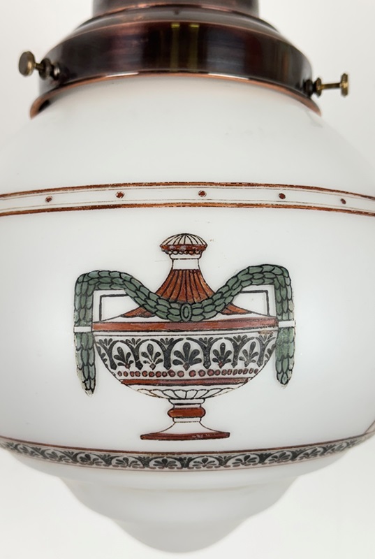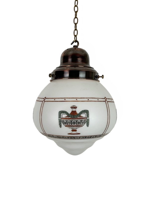 Highly unusual and eye catching style from the Art Deco era. This shade is made from satin opaline white glass which has been decorated with a Grecian style urn and swag detail.