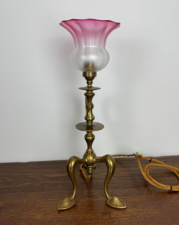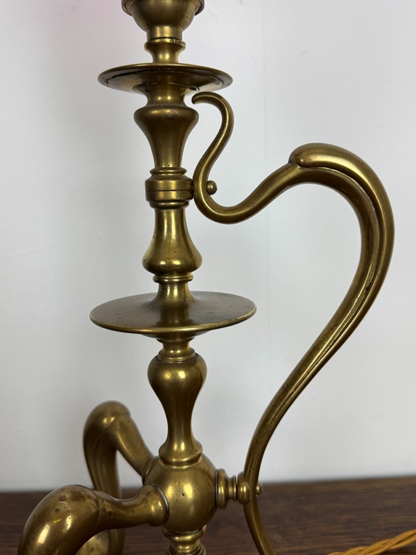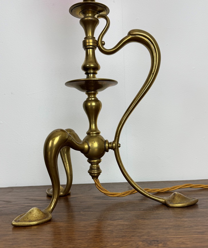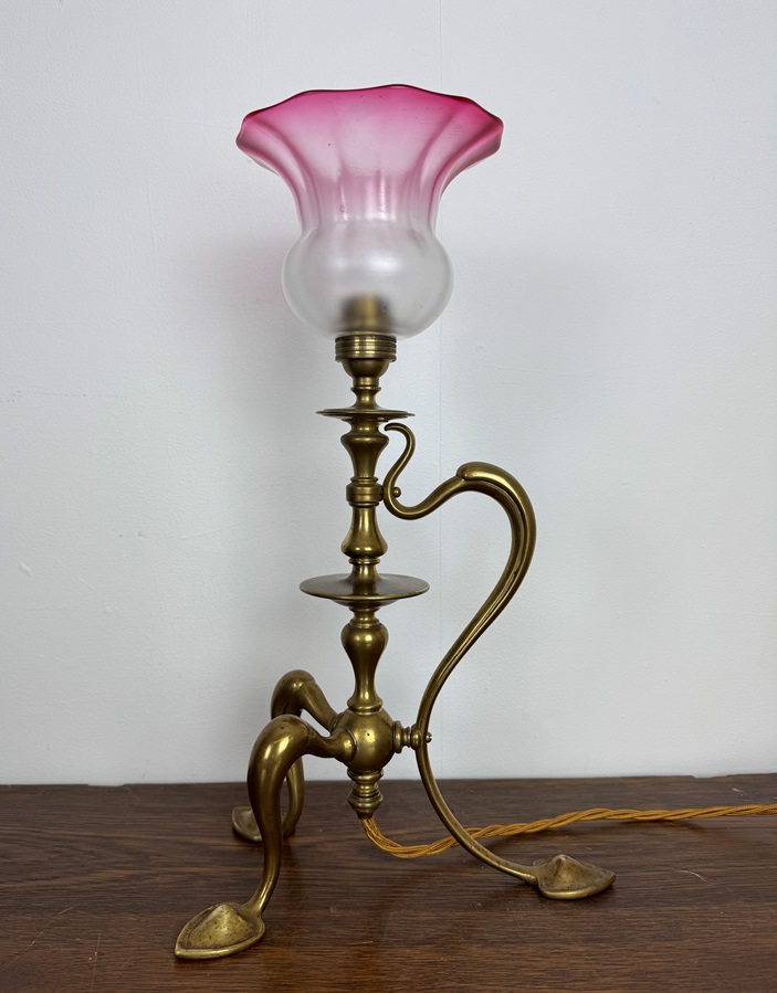 Dating back to the early Art Nouveau period, this lamp sits on three heart shaped feet and has a side feature handle which sweeps from top to bottom.