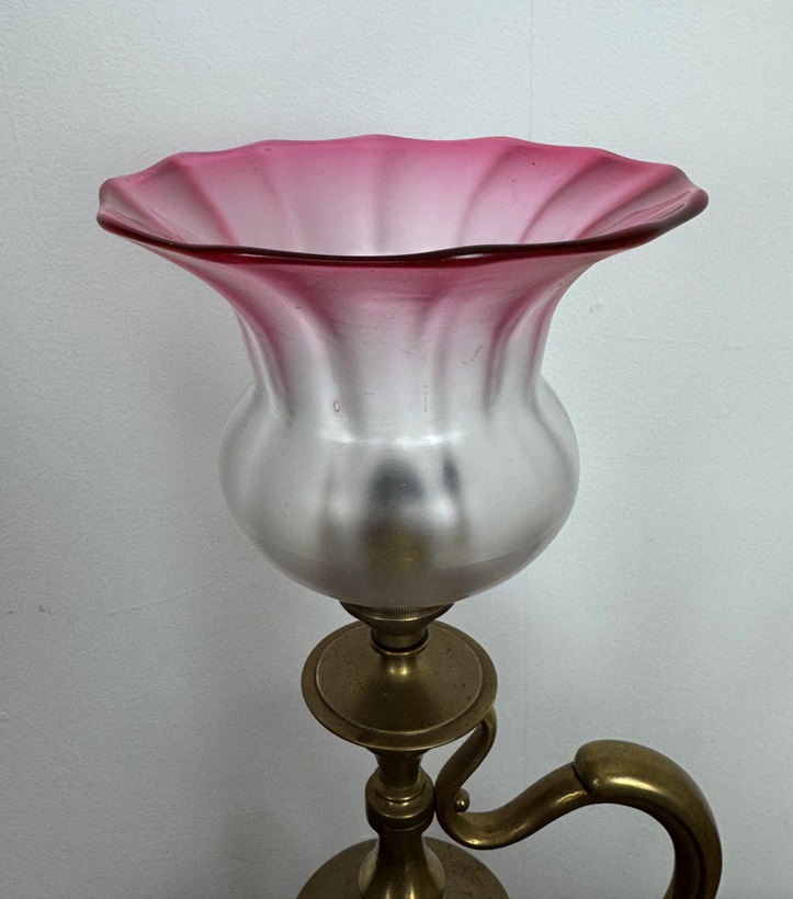 Fitted with an antique pink glass shade.