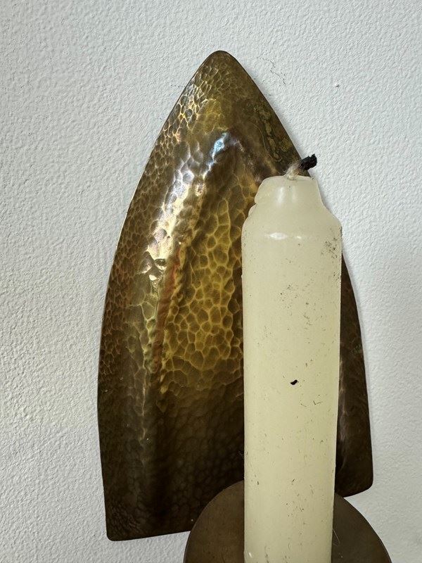 An original arts and crafts candle wall sconce. Made of solid brass with hammered finish. Brass has a dark patina.