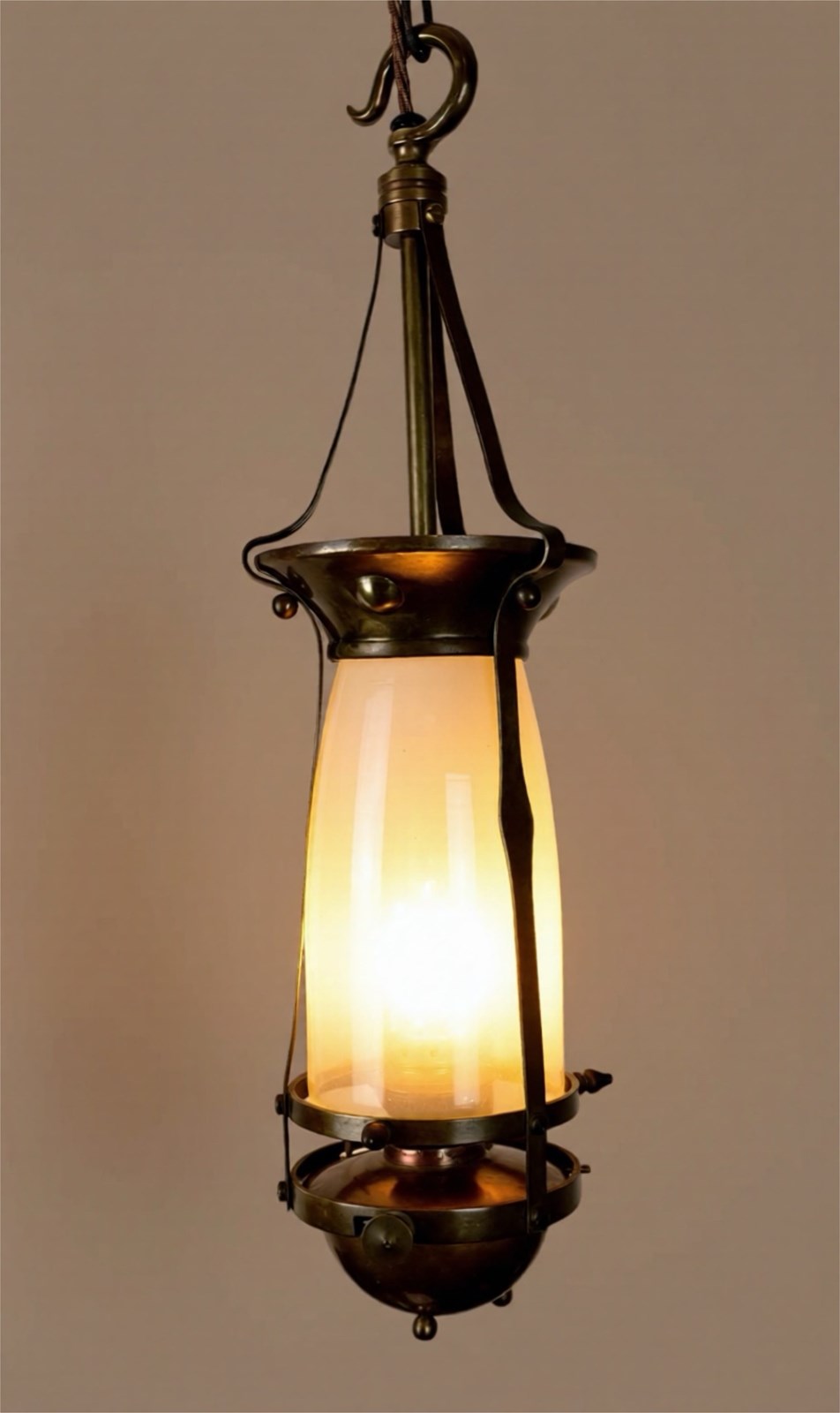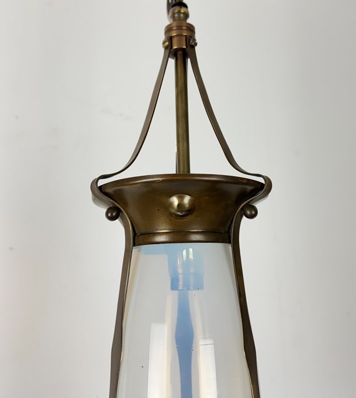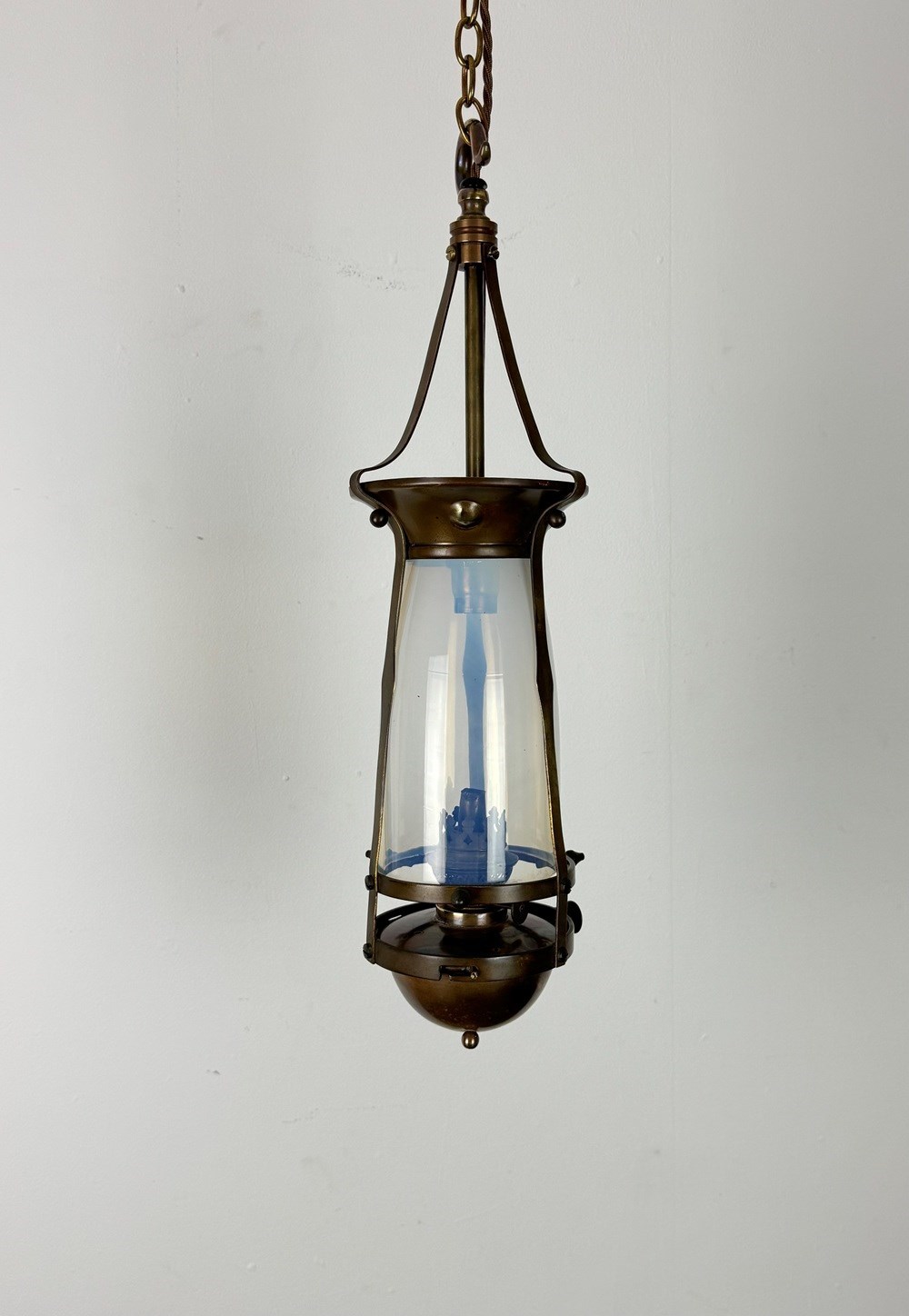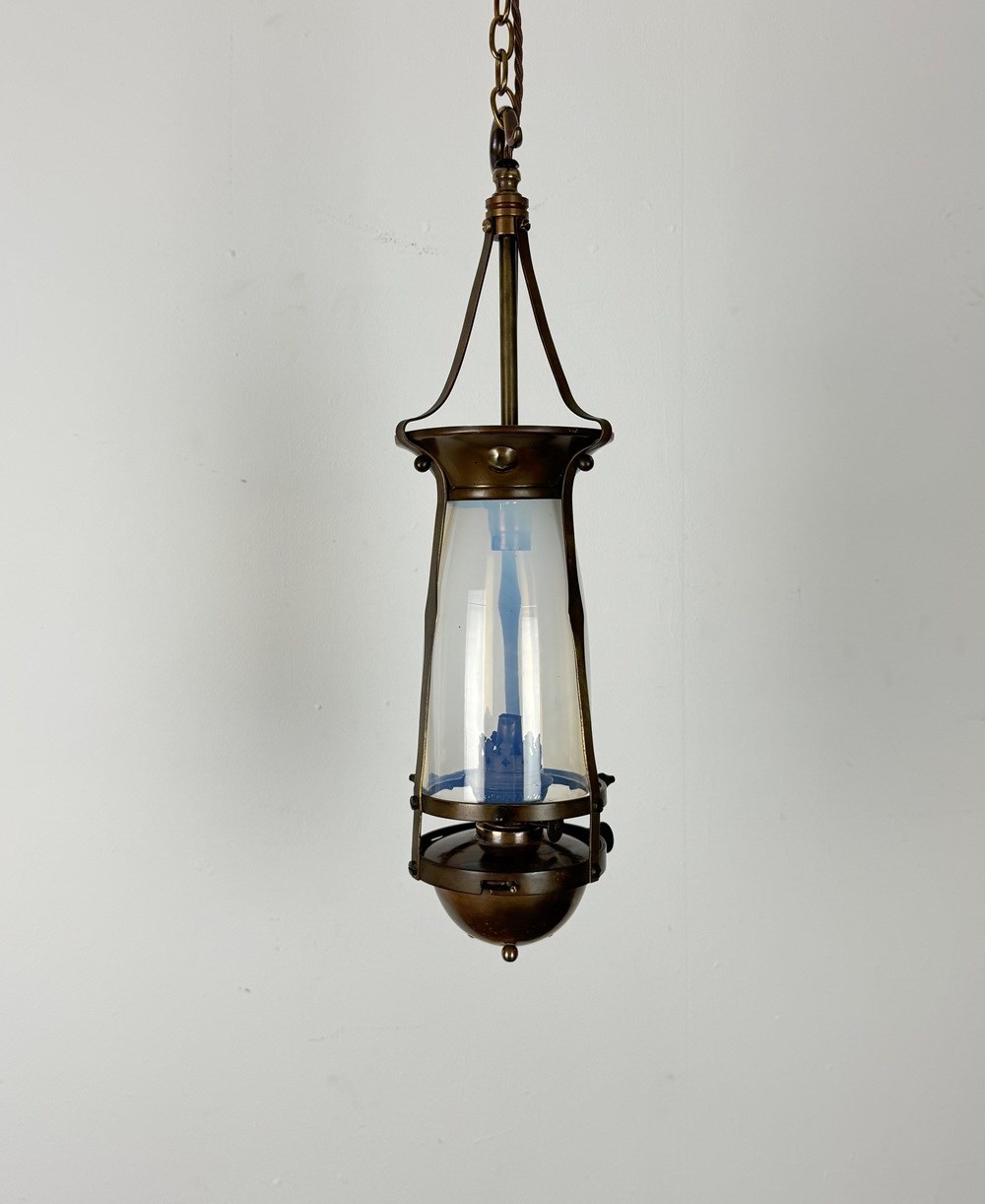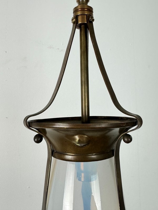 A slim lantern, originally an oil lantern but now converted to electricity. The style is very simple. The brass has a dark aged patina. The canopy has some a circular design pressed to the brass.