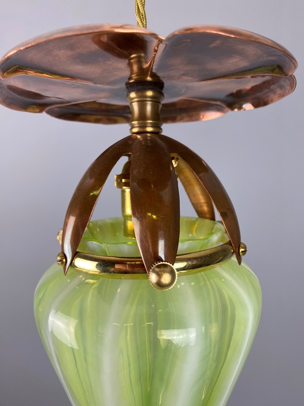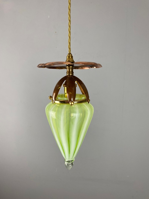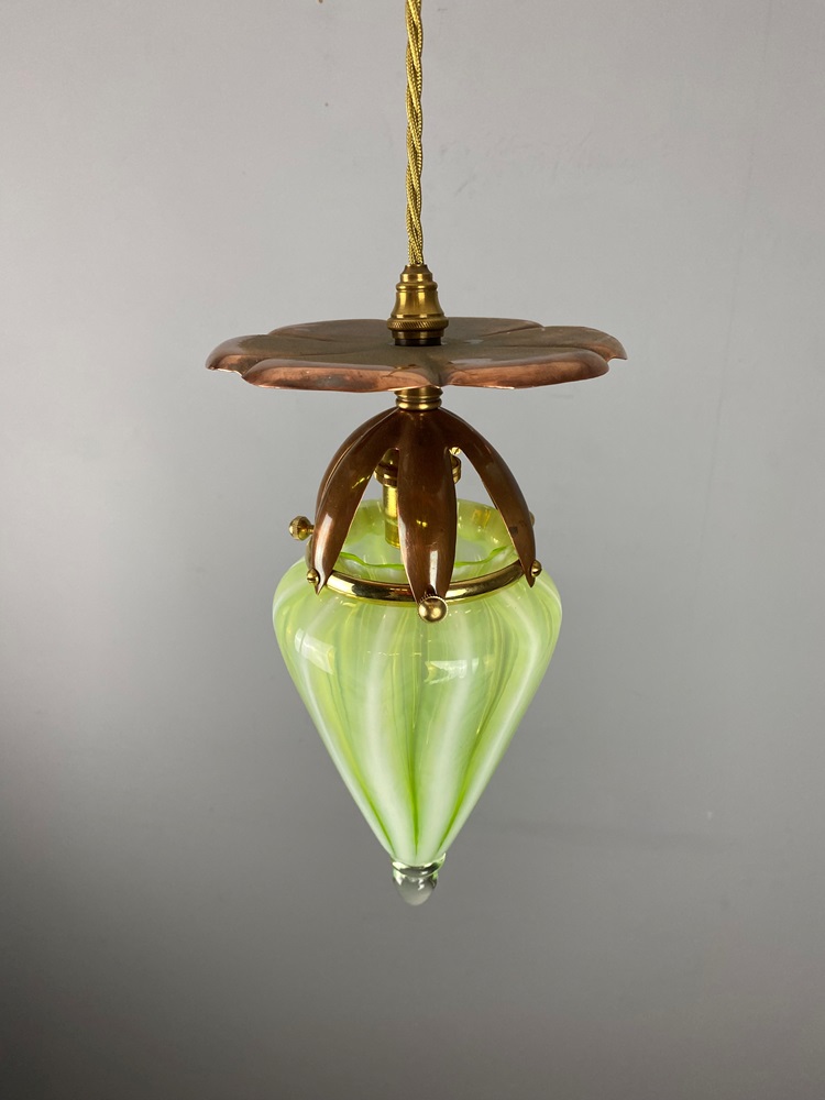 An arts and crafts styled pendant light, based on a similar design by WAS Benson. This small and pretty pendant light combines a copper lily pad and delicate petal gallery which have been hand made by us in our Derbyshire workshop. Lily pad bears a discreet Ashby stamp.